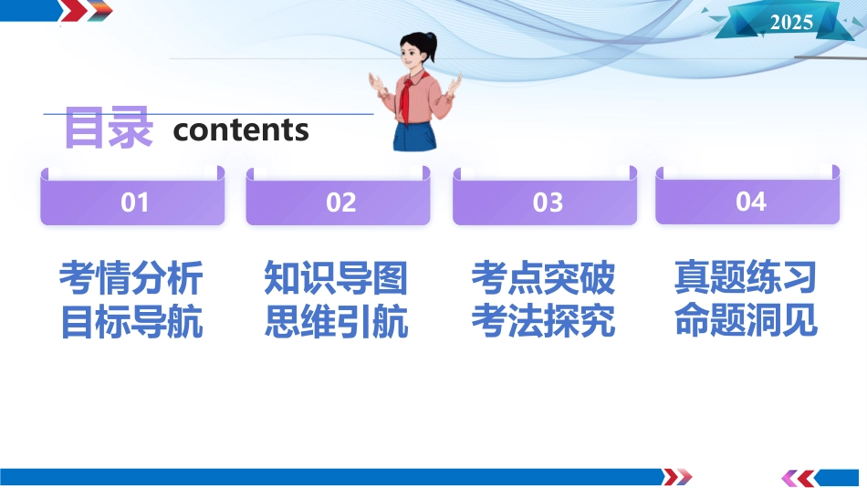 2025教师:XXX2025年高考一轮复习讲练测新材新高考教新材新高考教第31讲机械波202501考情分析目标导航02知识导图思维引航03考点突破考法探究04真题练习命题洞见目录contents202501考情分析目标导航2025复习目标目标1.知道机械波的形成条件及特点。目标2.掌握波速、波长和频率的关系,会分析波的图像。目标3.知道波的干涉、衍射现象和多普勒效应,掌握发生干涉和明显衍射的条件。2024·浙江·高考物理试题2024·湖南·高考物理试题2024·江西·高考物理试题2024·广东·高考物理试题2024·安徽·高考物理试题2024·江苏·高考物理试题考情分析考情分析202502知识导图思维引航2025思维导航机械波描述应用基本概念图像2.意义:表示在波的传播方向上,某时刻各质点离开平衡位置的位移。1.波长λ:在波的传播方向上,振动相位总是相同的两个相邻质点间的距离。2.频率f:等于波源的振动频率,由波源决定3.波速v:波在介质中的传播速度,由介质本身的性质决定,与波长和频率无关。1.坐标轴:横轴表示各质点的平衡位置,纵轴表示该时刻各质点的位移。振动图像与波的图像的综合应用波的多解(1)分清振动图像与波的图像。(2)看清横、纵坐标的单位。(3)找准波的图像对应的时刻,找准振动图像对应的质点。(1)周期性①时间周期性:时间间隔Δt与周期T的关系不明确。②空间周期性:波传播距离Δx与波长λ的关系不明确。(2)双向性①传播方向双向性:波的传播方向不确定。②振动方向双向性:质点振动方向不确定。202503考点探究考法突破2025机械波的形成波的图像考点1振动图像与波的图像的综合应用考点2波的多解问题考点3考航导点考点4波的干涉、衍射和多普勒效应2025知识固本考点一教材原型实验知识点1机械波机械波的形成条件①有发生机械振动的______。②有传播______,如空气、水等。传播特点①机械波传播的只是振动的______和______,质点只在各自的平衡位置附近做简谐运动,并不随波______。②波传到任意一点,该点的起振方向都和波源的起振方向______。③介质中每个质点都做______振动,因此,任一质点的振动频率和周期都和波源的振动频率和周期______。④波源经过一个周期T完成一次全振动,波恰好向前传播一个波长的距离。波源介质形式能量迁移相同受迫相同2025知识固本知识点2.波的图像考点一教材原型实验(1)坐标轴:横轴表示各质点的__________,纵轴表示该时刻各质点的______。平衡位置位移(2)意义:表示在波的传播方向上,某时刻各质点离开__________的位移。平衡位置(3)图像(如图)3.波长、波速、频率及其关系相同振动频率介质无关2025考向洞察考向1机械波的形成与传播根据“同侧法”可以由传播方向判断振动方向。A2025考向洞察考向1机械波的形成与传播D根据“上下坡法”,已知传播方向可以判断质点振动方向。2025考向洞察考向1机械波的形成与传播3.“水袖功”是中国古典舞中用于表达情感的常用技巧,舞者通过手把有规律的抖动传导至袖子上,营造出一种“行云流水”的美感。这一过程其实就是机械波的传播。下列关于机械波中横波的说法正确的是()CA.介质中质点沿波的传播方向移动B.介质中质点的振动速度等于波速C.横波是传递能量的一种方式D.横波由一种介质进入另一种介质时频率发生变化介质中质点不会沿波的传播方向移动,只在自己平衡位置附近振动。介质中质点的振动速度不等于波速,波速与介质有关,振动的速度与距平衡位置的远近有关。横波和纵波都能传递能量,故横波是传递能量的一种方式。波的频率由波源决定,与介质无关,故横波由一种介质进入另一种介质时频率不发生变化。2025考向洞察考向2.波的图像BD2025考向洞察考向2.波的图像C2025考向洞察考向2.波的图像A2025知识固本知识点1.振动图像与波的图像的比较考点二振动图像与波的图像的综合应用振动图像波的图像图像物理意义表示某质点各个时刻的位移表示某时刻各质点的位移图像信息(1)质点振动周期(2)质点振幅(3)各时刻质点位移(4)各时刻速度、加速度方向(1)波长、振幅(2)任意一质点在该时刻的位移(3)任意一质点在该时刻的加速度方向(4)传播方向、振动方向的互判图像变化随时间推移,图像延续,但已有形状不变随时间推移,图像沿...
