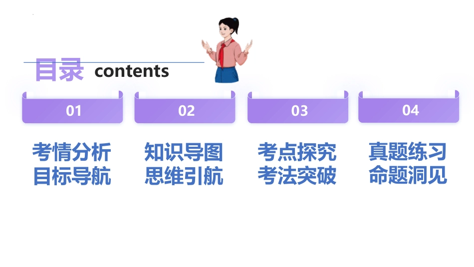 教师:XXX2025年高考一轮复习讲练测新材新高考教新材新高考教第15讲圆周运动01考情分析目标导航02知识导图思维引航03考点探究考法突破04真题练习命题洞见目录contents01考情分析目标导航考情分析复习目标目标1.掌握描述圆周运动的各物理量及关系。目标2.会分析匀速圆周运动的周期性及多解问题。目标3.会分析圆周运动向心力的来源,并利用圆周运动的相关知识解决生活中的圆周运动。辽宁·高考物理试题江苏·高考物理试题甘肃·高考物理试题湖北·高考物理试题江西·高考物理试题辽宁·高考物理试题全国·高考物理试题北京·高考物理试题考情分析考情分析圆周运动的运动学问题考点1圆周运动的动力学问题考点2水平面内圆周运动的临界问题考点3考航导点考点4、5竖直面内圆周运动的临界问题;斜面上圆周运动的临界问题02知识导图思维引航思维导航圆周运动圆周运动的运动学问题皮带传动:两轮边缘线速度大小相等齿轮传动:两轮边缘线速度大小相等同轴传动:两轮转动的角速度大小相等水平面内的圆周运动圆周运动的动力学问题竖直面内的圆周运动运动轨迹在水平物体所受面内,特合外力大小不变方向总是指向圆合外力充当心,向心力圆锥摆火车转弯圆盘模型轻绳模型轻杆模型minvgR恰好无弹力minvgR恰好过最高点min0v03考点探究考法突破知识固本物理观念是学习的出发点考点一圆周运动的运动学问题知识点1、描述圆周运动的物理量及关系线速度1.描述圆周运动的物体运动______的物理量2.是矢量,方向和半径______,和圆周_________(定义式____(与周期的关系)2.单位:角速度1.描述物体绕______转动快慢的物理量2.是矢量,但不研究其方向___(定义式___(与周期的关系)2.单位:与的关系:周期转速频率1.周期是做匀速圆周运动的物体沿圆周运动一周所用的时间,周期的倒数为频率2.转速是单位时间内物体转过的__________(与频率的关系)的单位:s的单位:的单位:向心加速度1.描述线速度______变化快慢的物理量2.方向指向___________2.单位:快慢垂直相切圆心圈数方向圆心知识固本考点一圆周运动的运动学问题知识点2、匀速圆周运动(1)定义:如果物体沿着圆周运动,并且线速度的大小处处______,所做的运动叫作匀速圆周运动。(2)特点:加速度大小______,方向始终指向______,是变加速运动。(3)条件:合外力大小______,方向始终与______方向垂直且指向圆心。(4)匀速圆周运动的向心力大小______方向始终沿半径方向指向圆心,时刻在改变,即向心力是一个______来源向心力可以由一个力提供,也可以由几个力的______提供,还可以由一个力的分力提供相等不变圆心不变速度变力合力知识固本物理观念是学习的出发点考点一圆周运动的运动学问题知识点3、离心运动和近心运动(2)受力特点(如图)(3)本质:离心运动的本质并不是受到离心力的作用,而是提供的力______做匀速圆周运动需要的向心力。逐渐远离圆心(1)离心运动:做圆周运动的物体,在所受合外力突然消失或不足以提供圆周运动所需向心力的情况下,就做______________的运动。切线远离离心向圆心靠近近心小于考向洞察角度一定用弧度制表示考向1圆周运动物理量的分析与计算C由线速度和角速度之间的关系求得曲线运动速度沿切线方向题后感悟(1)对公式v=ωr的理解当r一定时,v与ω成正比。当ω一定时,v与r成正比。当v一定时,ω与r成反比。(2)对an=v2r=ω2r的理解在v一定时,an与r成反比;在ω一定时,an与r成正比。考向洞察注意ABC具有相同的线速度,根据角速度与线速度的关系和向心加速度表达式比较考向2圆周运动中的传动问题ABC转动方向相同2.如图是一种新概念自行车,它没有链条,共有三个转轮,A、B、C转轮半径依次减小。轮C与轮A啮合在一起,行者踩踏板使轮C动,轮C驱动轮A转动,从而使得整个自行车沿路面前行,轮胎不打滑。下列说法正确的是()B题后感悟同轴转动皮带传动齿轮传动装置A、B点在同两的一上轴个圆盘子用皮接,两个轮带连A、B点分是两别两个轮子上的点边缘合,两个齿轮轮齿啮A、B点分是两别两上的点个齿轮边缘三种传动装置题后感悟三种传动装置同轴转动皮带传动齿轮传动特点角速度、周期相同速度大小相等线速度大小相等线向转相同相同相反律...