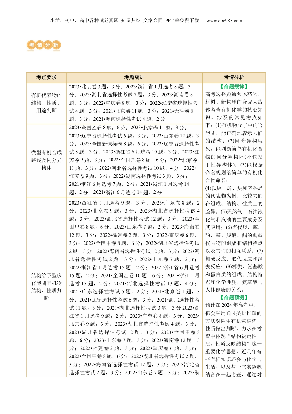 小学、初中、高中各种试卷真题知识归纳文案合同PPT等免费下载www.doc985.com专题13有机化学基础目录1考点一有机代表物的结构、性质、用途判断3【真题研析·规律探寻】3【核心提炼·考向探究】51.常见有机代表物的结构及主要化学性质52.官能团与反应用量的关系6【题型特训·命题预测】6考点二微型有机合成路线及同分异构体9【真题研析·规律探寻】9解题技巧12有机合成题的解题思路12【核心提炼·考向探究】131.同分异构体的判断方法132.典型有机物间的相互转化13【题型特训·命题预测】13题型一有机物的结构及同分异构体13题型二微型有机合成路线15考点三结构给予型多官能团有机物结构、性质判断18【真题研析·规律探寻】18解题技巧22结构、性质判断类有机选择题解题程序22【核心提炼·考向探究】221.常见有机物或官能团及其性质222.常见重要官能团或物质的检验方法23【题型特训·命题预测】23小学、初中、高中各种试卷真题知识归纳文案合同PPT等免费下载www.doc985.com考点要求考题统计考情分析有机代表物的结构、性质、用途判断2023•北京卷3题,3分;2023•浙江省1月选考8题,3分;2023•湖北省选择性考试7题,3分;2023•湖南卷8题,3分;2022•重庆卷8题,3分;2022•辽宁省选择性考试4题,3分;2021•北京卷11题,3分;2021•天津卷8题,3分;2021•海南选择性考试4题,2分【命题规律】高考选择题通常以药物、材料、新物质的合成为载体考查有机化学的核心知识。涉及的常见考点如下:(1)有机物分子中的官能团,能正确地表示它们的结构;(2)同分异构现象,能判断简单有机化合物的同分异构体(不包括手性异构体);(3)能根据命名规则给简单的有机化合物命名;(4)以烷、烯、炔和芳香烃的代表物为例,比较它们在组成、结构、性质上的差异;(5)天然气、石油液化气和汽油的主要成分及其应用;(6)卤代烃、醇、酚、醛、羧酸、酯的典型代表物的组成和结构特点以及它们的相互联系;(7)加成反应、取代反应和消去反应;(8)糖类、氨基酸和蛋白质的组成、结构特点和化学性质,氨基酸与人体健康的关系。【命题预测】预计在2024年高考中,仍会采用通过类比推理的方法对陌生有机物结构、性质做出判断,力求在考查中体现“结构决定性质,性质反映结构”这一重要化学思想,近几年有些有机知识还会与化学与生活、以及与一些实验题结合在一起考查,通过对微型有机合成路线及同分异构体2023•全国乙卷8题,6分;2023•北京卷11题,3分;2023•辽宁省选择性考试6题,3分;2023•山东卷12题,3分;2023•全国新课标卷8题,6分;2023•辽宁省选择性考试8题,3分;2023•浙江省6月选考10题,3分;2023•江苏卷9题,3分;2022•全国乙卷8题,6分;2022•北京卷11题,3分;2022•河北省选择性考试10题,4分;2022•江苏卷9题,3分;2022•湖南选择性考试3题,3分;2021•浙江6月选考7题,2分;2021•浙江1月选考14题,2分;2021•浙江6月选考14题,2分结构给予型多官能团有机物结构、性质判断2023•浙江省1月选考9题,3分;2023•广东卷8题,2分;2023•北京卷9题,3分;2023•湖北省选择性考试4题,3分;2023•湖北省选择性考试12题,3分;2023•全国甲卷8题,6分;2023•山东卷7题,2分;2023•海南卷12题,3分;2022•福建卷2题,3分;2022•重庆卷6题,3分;2022•全国甲卷8题,6分;2022•湖北省选择性考试2题,3分;2022•海南省选择性考试12题,3分;2022•河北省选择性考试2题,3分;2022•山东卷7题,2分;2022·浙江省1月选考15题,2分;2022·浙江省6月选考15题,2分;2021•全国乙卷10题,6分;2021•浙江1月选考15题,2分;2021•河北选择性考试13题,4分;2021•广东选择性考试5题,2分;2021•北京卷1题,3分;2021•辽宁选择性考试6题,3分;2021•湖北选择性考试11题,3分;2021•湖北选择性考试3题,3分2023•浙江省1月选考9题,2分;2023•广东卷8题,3分;2023•北京卷9题,3分;2023•湖北省选择性考试4题,3分;2023•湖北省选择性考试12题,3分;2023•全国甲卷8题,6分;2023•山东卷7题,3分;2023•海南卷12题,3分;2022•福建卷2题,3分;2022•重庆卷6题,3分;2022•全国...
