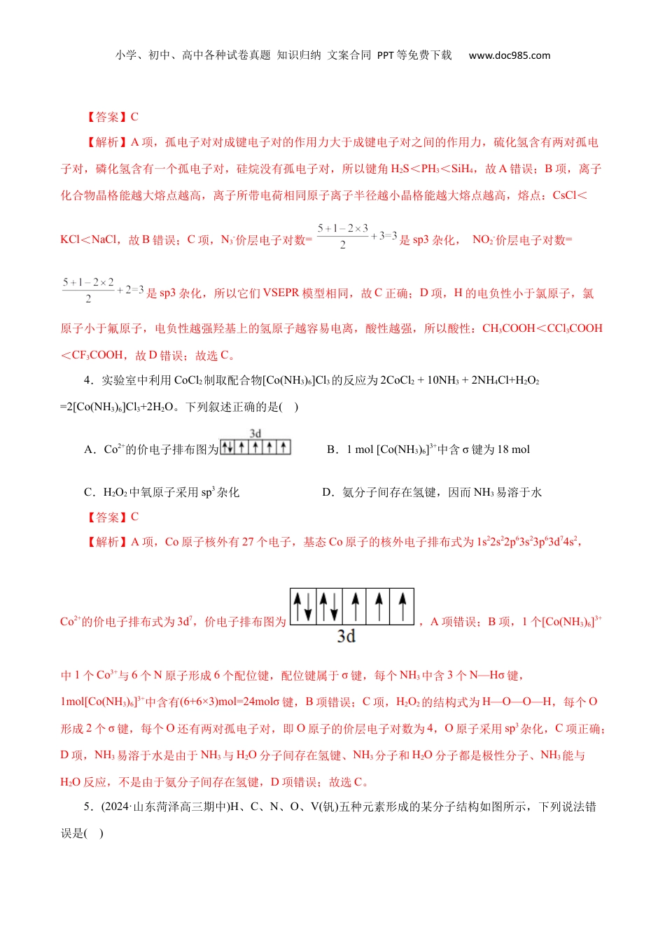 小学、初中、高中各种试卷真题知识归纳文案合同PPT等免费下载www.doc985.com专题12物质结构与性质综合(题型突破)(考试时间:75分钟试卷满分:100分)一、选择题(本题共15小题,每小题3分,共45分。每小题只有一项是符合题目要求的)1.含有N3-、N5+的材料Pb(N3)2、N5AsF6可以用于炸药。下列说法正确的是()A.Pb属于d区元素B.基态As原子的d轨道与p轨道上的电子数之比为3:2C.N3-的空间构型为直线形D.基态F原子中,核外电子的空间运动状态有9种【答案】C【解析】A项,铅元素的原子序数为82,价电子排布式为6s26p2,处于元素周期表的p区,故A错误;B项,砷元素的原子序数为33,电子排布式为1s22s22p63s23p63d104s24p3,则原子的d轨道与p轨道上的电子数之比为10:15=2:3,故B错误;C项,等电子体具有相同的空间构型,N3-离子与二氧化碳分子的原子个数都为3、价电子数都为16,互为等电子体,二氧化碳的空间构型为直线形,则N3-离子的空间构型为直线形,故C正确;D项,核外电子的空间运动状态与原子轨道的数目相同,氟元素的原子序数为9,电子排布式为1s22s22p5,氟原子的原子轨道数目为5,则核外电子的空间运动状态有5种,故D错误;故选C。2.(2024·江苏苏州高三期中)Na、Mg、Al均为第三周期元素。下列说法正确的是()A.离子半径:r(Na+)<r(Mg2+)<r(Al3+)B.第一电离能:I1(Na)>I1(Mg)>I1(Al)C.还原性:Na>Mg>AlD.碱性:NaOH<Mg(OH)2<Al(OH)3【答案】C【解析】A项,三种离子核外电子排布相同半径随核电荷数增大而减小,故A错误;B项,同周期元素第一电离能总体趋势:核电荷数越大,第一电离能越大,故B错误;C项,同周期元素,核电荷数越大金属性越弱,对应单质还原性越弱,故C正确;D项,金属性Na>Mg>Al,其对应最高价氧化物水化物碱性越弱,碱性:NaOH>Mg(OH)2>Al(OH)3,故D错误;故选C。3.(2024·山东淄博高三期中检测)下列关于物质结构和性质的说法正确的是()A.键角:H2S>PH3>SiH4B.熔点:CsCl>KCl>NaClC.NO3-、NO2-的VSEPR模型相同D.酸性:CH3COOH>CCl3COOH>CF3COOH小学、初中、高中各种试卷真题知识归纳文案合同PPT等免费下载www.doc985.com【答案】C【解析】A项,孤电子对对成键电子对的作用力大于成键电子对之间的作用力,硫化氢含有两对孤电子对,磷化氢含有一个孤电子对,硅烷没有孤电子对,所以键角H2S<PH3<SiH4,故A错误;B项,离子化合物晶格能越大熔点越高,离子所带电荷相同原子离子半径越小晶格能越大熔点越高,熔点:CsCl<KCl<NaCl,故B错误;C项,N3-价层电子对数=是sp3杂化,NO2-价层电子对数=是sp3杂化,所以它们VSEPR模型相同,故C正确;D项,H的电负性小于氯原子,氯原子小于氟原子,电负性越强羟基上的氢原子越容易电离,酸性越强,所以酸性:CH3COOH<CCl3COOH<CF3COOH,故D错误;故选C。4.实验室中利用CoCl2制取配合物[Co(NH3)6]Cl3的反应为2CoCl2+10NH3+2NH4Cl+H2O2=2[Co(NH3)6]Cl3+2H2O。下列叙述正确的是()A.Co2+的价电子排布图为B.1mol[Co(NH3)6]3+中含σ键为18molC.H2O2中氧原子采用sp3杂化D.氨分子间存在氢键,因而NH3易溶于水【答案】C【解析】A项,Co原子核外有27个电子,基态Co原子的核外电子排布式为1s22s22p63s23p63d74s2,Co2+的价电子排布式为3d7,价电子排布图为,A项错误;B项,1个[Co(NH3)6]3+中1个Co3+与6个N原子形成6个配位键,配位键属于σ键,每个NH3中含3个N—Hσ键,1mol[Co(NH3)6]3+中含有(6+6×3)mol=24molσ键,B项错误;C项,H2O2的结构式为H—O—O—H,每个O形成2个σ键,每个O还有两对孤电子对,即O原子的价层电子对数为4,O原子采用sp3杂化,C项正确;D项,NH3易溶于水是由于NH3与H2O分子间存在氢键、NH3分子和H2O分子都是极性分子、NH3能与H2O反应,不是由于氨分子间存在氢键,D项错误;故选C。5.(2024·山东菏泽高三期中)H、C、N、O、V(钒)五种元素形成的某分子结构如图所示,下列说法错误是()小学、初中、高中各种试卷真题知识归纳文案合同PPT等免费下载www.doc985.comA.该分子中不存在氢键B.B.基态V原子的价电子轨道表示式为C.基态O原子中有3种能量不同的电子D.该分子中的碳原子全部是sp2...