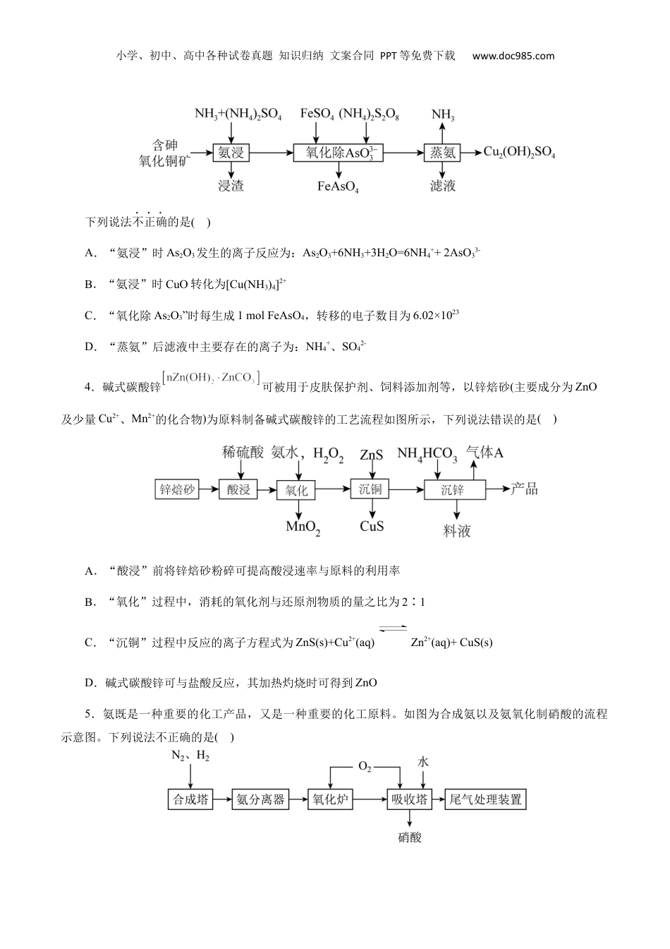 小学、初中、高中各种试卷真题知识归纳文案合同PPT等免费下载www.doc985.com专题10化学工艺流程(题型突破)(考试时间:90分钟试卷满分:100分)一、选择题(本题共15小题,每小题3分,共45分。每小题只有一项是符合题目要求的)1.工业上常用软锰矿生产纯净的MnO2,工艺流程如图所示,已知软锰矿的主要成分为MnO2,还含有少量SiO2、Al2O3。下列说法错误的是()A.“溶解”过程中有氢气生成B.“过滤”得到的滤渣中含有H2SiO3C.“纯化”过程中应先加MnO2,再调pH=5,过滤D.“电解”时MnO2在电解池阳极生成,溶液pH值降低2.聚合硫酸铁[Fe2(OH)m((SO4)p]n是一种新型絮凝剂,其处理污水能力比FeCl3强,且腐蚀性小。工业上利用废铁屑为原料制备聚合硫酸铁的工艺流程如图。下列说法正确的是()A.聚合硫酸铁[Fe2(OH)m((SO4)p]n中B.酸浸槽中加入的酸液可用稀硝酸C.反应釜中发生的离子反应为H2O2+Fe2++H+=Fe3++H2OD.聚合釜中控制溶液的pH越大越好3.弱碱性条件下,利用含砷氧化铜矿(含CuO、As2O3及少量不溶性杂质)制备Cu2(OH)2SO4的工艺流程如图:小学、初中、高中各种试卷真题知识归纳文案合同PPT等免费下载www.doc985.com下列说法不正确的是()A.“氨浸”时As2O3发生的离子反应为:As2O3+6NH3+3H2O=6NH4++2AsO33-B.“氨浸”时CuO转化为[Cu(NH3)4]2+C.“氧化除As2O3”时每生成1molFeAsO4,转移的电子数目为6.02×1023D.“蒸氨”后滤液中主要存在的离子为:NH4+、SO42-4.碱式碳酸锌可被用于皮肤保护剂、饲料添加剂等,以锌焙砂(主要成分为ZnO及少量Cu2+、Mn2+的化合物)为原料制备碱式碳酸锌的工艺流程如图所示,下列说法错误的是()A.“酸浸”前将锌焙砂粉碎可提高酸浸速率与原料的利用率B.“氧化”过程中,消耗的氧化剂与还原剂物质的量之比为2∶1C.“沉铜”过程中反应的离子方程式为ZnS(s)+Cu2+(aq)Zn2+(aq)+CuS(s)D.碱式碳酸锌可与盐酸反应,其加热灼烧时可得到ZnO5.氨既是一种重要的化工产品,又是一种重要的化工原料。如图为合成氨以及氨氧化制硝酸的流程示意图。下列说法不正确的是()小学、初中、高中各种试卷真题知识归纳文案合同PPT等免费下载www.doc985.comA.合成塔内发生的反应中有非极性键的断裂和极性键的生成B.氧化炉内发生的反应氧化剂与还原剂的物质的量之比为5∶4C.使用溶液吸收尾气中的氮氧化物,和NO2是酸性氧化物D.向吸收塔中通入O2的作用是氧化6.化学工业为疫情防控提供了强有力的物质支撑。亚氯酸钠(NaClO2)具有强氧化性,受热易分解,可作漂白剂、食品消毒剂等,以氯酸钠等为原料制备亚氯酸钠的工艺流程如下图所示。已知:消毒能力即每克含氯消毒剂的氧化能力相当于多少克Cl2的氧化能力。下列说法错误的是()A.“母液”中溶质的主要成分是Na2SO4B.相同质量ClO2的消毒能力是Cl2的2.5倍C.“反应2”中氧化剂与还原剂的物质的量之比为2∶1D.“减压蒸发”可以降低蒸发时的温度,提高产品产率7.生产软磁铁氧体的主要原料是α-FeOOH,以硫铁矿(主要成分是FeS2,含少量Al2O3、SiO2和Fe3O4)为原料制备α-FeOOH的工艺流程如下,相关数据见下表。下列说法错误的是()物质开始沉淀pH(25℃)1.97.64.0沉淀完全pH(25℃)3.29.75.2A.“焙烧”的产物之一可用于工业制硫酸B.“试剂a”可以为FeS,主要目的是除去过量硫酸C.“试剂b”可以为氨水,调pH的范围为5.2~7.6D.“沉淀”时,pH过高或者过低均不利于生成小学、初中、高中各种试卷真题知识归纳文案合同PPT等免费下载www.doc985.com8.钪(Sc)可用于制备铝钪合金、燃料电池、钪钠卤灯、示踪剂、激光晶体等产品。以钛白酸性废水(主要含、Fe2+、Sc3+)为原料制备氧化钪(Sc2O3)的工艺流程如下。下列说法正确的是()A.酸洗时加入H2O2的目的是将Ti4+还原为Ti2+B.“操作Ⅰ”需要的玻璃仪器有分液漏斗C.“滤渣Ⅰ”的主要成分是Ti(OH)4、Fe(OH)3D.草酸钪焙烧时反应的化学方程式:2Sc2(C2O4)3+3O22Sc2O3+12CO29.高铁酸钾(K2FeO4)具有杀菌消毒及净水作用,某实验小组在碱性条件下制备K2FeO4流程如图所示:下列说法错误的是()A.1molK2FeO4消毒能力相当于1.5molHClOB.氧化反应:3NaClO+2Fe(NO3)3+10NaOH=2Na2FeO4+3NaCl+6...