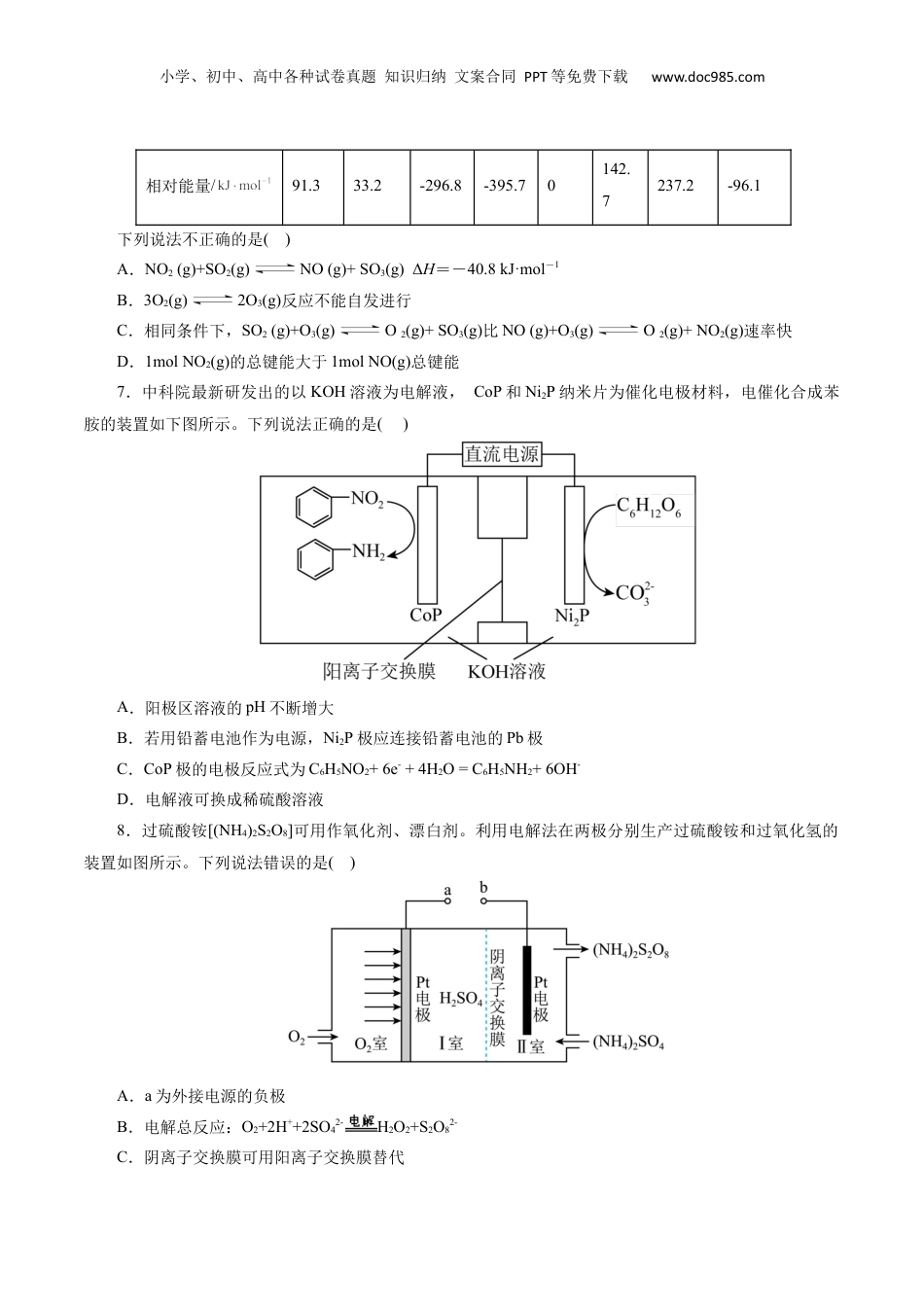 小学、初中、高中各种试卷真题知识归纳文案合同PPT等免费下载www.doc985.com专题05化学反应与能量(考试时间:75分钟试卷满分:100分)一、选择题(本题共15小题,每小题3分,共45分。每小题只有一项是符合题目要求的)1.某化学反应A2(g)+B2(g)=2AB(g)的能量变化如图所示,则下列说法中正确的是()A.该反应为放热反应,无需加热就可以发生B.断裂1molA-A键和1molB-B键要吸收xkJ的能量C.根据图示可知生成1molAB(g)放出的能量D.三种物质A2(g)、B2(g)、AB(g)中,最稳定的物质一定是AB(g)2.(2024·江苏无锡高三教学质量调研测试)1mol液态肼完全燃烧生成N2气体和液态水放出577kJ的热量。工业上利用NH3和CO2制取尿素[CO(NH2)2],尿素在高温条件下可将汽车尾气中的NOx转化为无毒气体N2。下列化学反应表示正确的是()A.N2H4燃烧的热化学方程式:N2H4(l)+O2(g)=N2(g)+2H2O(g)ΔH=-577kJ·mol-1B.碱性N2H4燃料电池负极发生的电极反应式:N2H4+4e-+4OH-=N2↑+4H2OC.NaClO氧化氨气制取N2H4的离子方程式:2NH3+ClO-=N2H4+Cl-+H2OD.N2H4与NO2高温下反应的化学方程式:N2H4+NO2N2↑+2H2O3.(2024·河北迁安市高三期中)下列装置能达到实验目的是()A.用图Ⅰ所示装置测定55mL1mol/L盐酸与50mL11mol/LNaOH溶液发生中和反应的反应热小学、初中、高中各种试卷真题知识归纳文案合同PPT等免费下载www.doc985.comB.为探究铁制品生锈,用图Ⅱ所示装置,正极材料是铁C.图Ⅲ所示装置实现Ag+2HCl=2AgC1↓+H2↑D.图Ⅳ装置可实现粗铜的精炼4.(2023·辽宁省名校联盟高考模拟调研卷)“北溪”天然气管道至少泄漏8万吨天然气,近20年间甲烷的温室效应率是CO2的84倍。已知管道接口处有钢铁材料等,海水的pH约为8.0。设NA为阿伏伽德罗常数的值。下列有关叙述不正确的是()A.损坏的钢铁材料在海水中主要发生吸氧腐蚀B.制造管道时表面涂层能起到抗腐蚀作用C.wg铁在海水中完全发生电化学腐蚀时转移电子数一定为D.修复管道时在钢管表面镶嵌锌块,这种方法叫牺牲阳极法5.下图是处理废水中苯酚的装置,回收利用苯后再排放。下列有关说法合理的是()A.a为负极,电极附近pH增大B.该离子交换膜为阳离子交换膜C.b电极反应式为WO3+xH++xe-=HxWO3D.若有0.1mol电子通过导线,A、B两区域中液体质量改变量的和为0.2g6.(2023·浙江省温州市高三第三次模拟适应性考试)标准状态下,气态反应物、生成物及活化分子[A(B)表示“A+B→产物”的活化分子]的相对能量如表所示:物质NO(g)NO2(g)SO2(g)SO3(g)O2(g)O3(g)NO(O3)SO2(O3)小学、初中、高中各种试卷真题知识归纳文案合同PPT等免费下载www.doc985.com相对能量/91.333.2-296.8-395.70142.7237.2-96.1下列说法不正确的是()A.NO2(g)+SO2(g)NO(g)+SO3(g)ΔH=-40.8kJ·mol-1B.3O2(g)2O3(g)反应不能自发进行C.相同条件下,SO2(g)+O3(g)O2(g)+SO3(g)比NO(g)+O3(g)O2(g)+NO2(g)速率快D.1molNO2(g)的总键能大于1molNO(g)总键能7.中科院最新研发出的以KOH溶液为电解液,CoP和Ni2P纳米片为催化电极材料,电催化合成苯胺的装置如下图所示。下列说法正确的是()A.阳极区溶液的pH不断增大B.若用铅蓄电池作为电源,Ni2P极应连接铅蓄电池的Pb极C.CoP极的电极反应式为C6H5NO2+6e-+4H2O=C6H5NH2+6OH-D.电解液可换成稀硫酸溶液8.过硫酸铵[(NH4)2S2O8]可用作氧化剂、漂白剂。利用电解法在两极分别生产过硫酸铵和过氧化氢的装置如图所示。下列说法错误的是()A.a为外接电源的负极B.电解总反应:O2+2H++2SO42-H2O2+S2O82-C.阴离子交换膜可用阳离子交换膜替代小学、初中、高中各种试卷真题知识归纳文案合同PPT等免费下载www.doc985.comD.电解池工作时,I室溶液质量理论上逐渐减小9.一种能在较低电压下获得氢气和氧气的电化学装置如图所示。下列说法正确的是()A.电极a与电源的负极相连,电极b为阳极B.隔膜为阴离子交换膜,OH-从电解池的左室通过隔膜向右室迁移C.反应器I中发生的反应为4[Fe(CN)6]3-+2H2O4[Fe(CN)6]4-+O2↑+4H+D.该装置的总反应为2H2O2H2↑+O2↑,气体N是氢气10.高铁酸钠(Na2FeO4)是一种新型的消毒剂,以Fe、Ni为电极制取Na2FeO4的原理如图所示。下列叙述错...