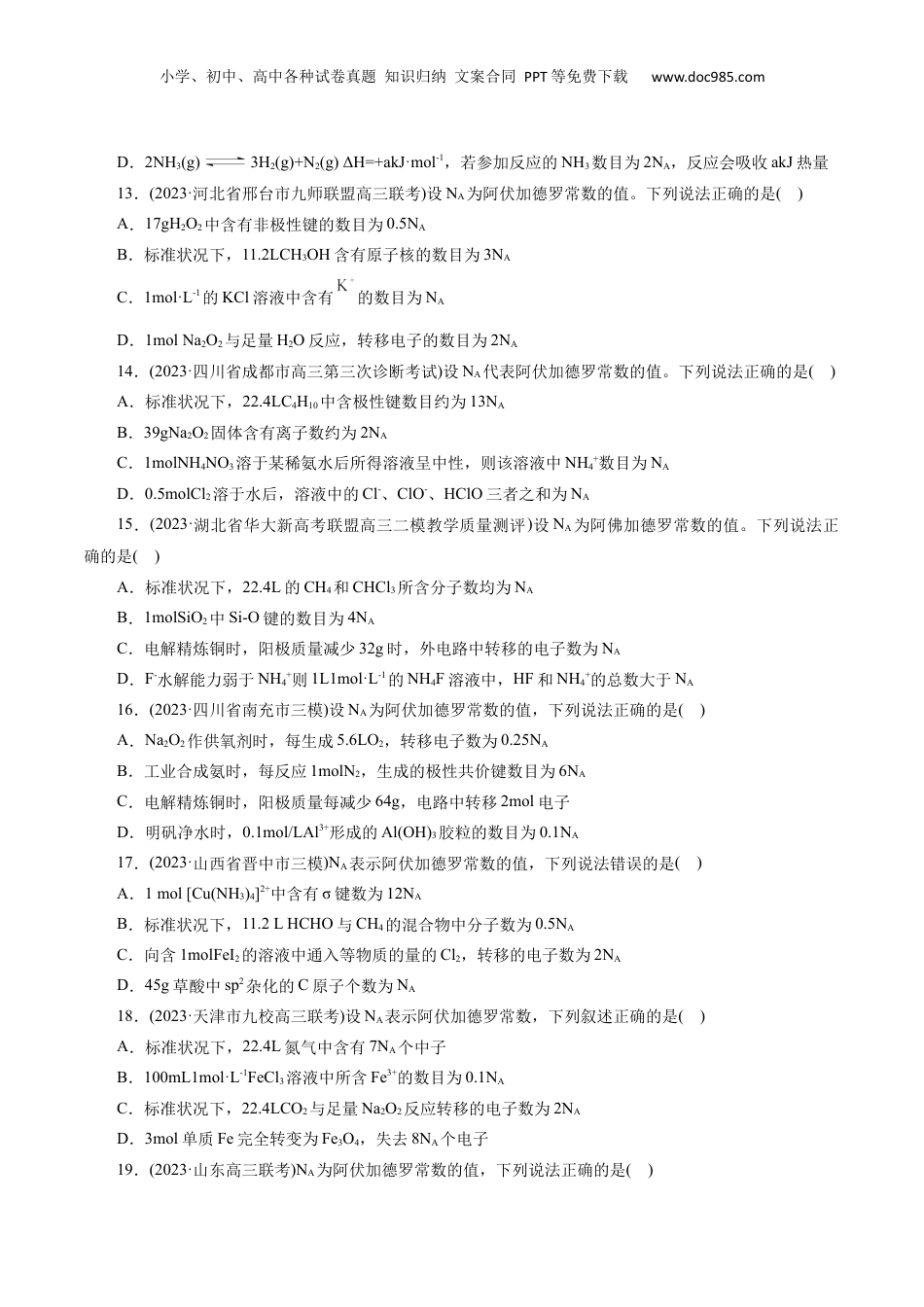 小学、初中、高中各种试卷真题知识归纳文案合同PPT等免费下载www.doc985.com专题02化学计量及其应用(考试时间:75分钟试卷满分:100分)选择题(本题共50小题,每小题2分,共100分。每小题只有一项是符合题目要求的)1.设NA为阿伏伽德罗常数的值,下列说法不正确的是()A.30gHCHO和CH3COOH混合物中H原子数为2NAB.密闭容器中2molSO2和1molO2充分反应后,容器中分子数为2NAC.一定条件下,6.4g铜与过量的氯气反应,转移电子数目为0.2NAD.1molH2O2中含有共价键的数目为3NA2.设NA为阿伏加德罗常数的值。下列说法正确的是()A.18.9g三肽C6H11N3O4(相对分子质量:189)中的肽键数目为0.2NAB.1mol重水比1mol水多NA个质子C.电解精炼铜时,电路中每通过NA个电子时阳极溶解32gCuD.常温常压下,13.6g金刚烷()中所含C-C键的数目为1.36NA3.(2023·浙江省十校联盟高三联考)NA为阿伏加德罗常数的值,下列说法正确的是()A.标准状况下,11.2LH2O2含有的非极性共价键数目为0.5NAB.在1L0.1mol∙L-1CH3COONa溶液中,阴离子的总数等于0.1NAC.5.6gFe与足量的S反应转移的电子数为0.2NAD.1molHOOCCH2COOH与足量乙醇在一定条件下反应,生成的酯基的数目为2NA4.(2023·辽宁省大连市一模)NA为阿伏加德罗常数的值。下列叙述正确的是()A.0.1mol/LNa2CO3溶液中,含有的数目为0.2NAB.标准状况下,22.4LCH4和22.4LCl2在光照下充分反应后的分子数为2NAC.1molCaC2晶体和1molCaH2晶体含有的离子数目均为2NAD.一定条件下,5.6gFe与0.1molCl2充分反应,转移的电子数为0.3NA5.设NA为阿伏加德罗常数的值,下列有关叙述不正确的是()A.0.1mol的11B中,含有0.6NA个中子B.0℃、101kPa下,0.1mol乙炔和甲醛(HCHO)的混合物中含有键的数目为0.2NAC.将1molCl2通入足量水中,所得溶液中Cl2、HClO、Cl-、ClO-三种微粒数目之和为2NAD.常温下,1L0.50mol·L-1NH4Cl溶液与2L0.25mol·L-1NH4Cl溶液所含NH4+的物质的量后者小6.(2023·河南安阳市二模)设NA为阿伏加德罗常数的值,下列说法正确的是()A.标准状况下,生成2.24LO2转移的电子数为0.4NAB.2L1mol·L-1的氯化铜溶液中H+数目为4NA小学、初中、高中各种试卷真题知识归纳文案合同PPT等免费下载www.doc985.comC.常温下,5.6g铁与足量稀硝酸反应转移的电子数为0.3NAD.2LpH=5的0.05mol·L-1K2Cr2O7溶液中Cr2O72-数目为0.1NA7.(2023·浙江省义乌市高三高考适应性考试)设NA为阿伏加德罗常数,下列有关说法正确的是()A.在25℃时,pH为12的CH3COONa溶液中水电离出的H+数目为0.01NAB.标准状况下,4.48LSO2和足量O2反应,生成的SO3分子数目为0.2NAC.电解精炼粗铜时,阳极质量减少6.4g,外电路中通过电子的数目为0.2NAD.13g苯、苯乙烯、聚苯乙烯的混合物中所含氢原子数目为NA8.(2023·辽宁省抚顺市普通高中高三模拟)NA表示阿伏加德罗常数的值,下列说法正确的是()A.1.8g重水(D2O)中所含质子数为NAB.常温下1LpH=13的Ba(OH)2中含有OH-的数目为0.2NAC.106gNa2CO3固体中含有NA个CO32-D.标准状况下,22.4LSO3中含有SO3的分子数为NA9.(2023·河北省衡水市部分重点高中高三二模)已知NA为阿伏加德罗常数的值,下列有关说法正确的是()A.在1mol[Co(NH3)4Cl2]Cl中存在的配位键数目为6NAB.34gH2O2生成O2转移的电子数一定为2NAC.0.1mol·L-1的Na2S溶液中:N(S2-)+N(HS-)+N(H2S)+=0.1NAD.16g14CH4分子所含的电子数目为10NA10.(2023·福建省福州市普通高中毕业班高三质量检测)设NA为阿伏加德罗常数的值,下列说法正确的是()A.32g肼(N2H4)分子中含σ键数目为5NAB.标准状况下,11.2LSO3所含分子数为0.5NAC.1mol铜铝合金与足量稀HNO3充分反应,转移的电子数小于2NAD.室温时,1.0LpH=12的Ba(OH)2溶液中含有的数目为0.2NA11.(2023·四川省成都市蓉城名校联盟高三三模)NA为阿伏加德罗常数的值。下列说法正确的是()A.100mL2mol·L−1蔗糖溶液中所含分子数为0.2NAB.30g由乙酸和葡萄糖组成的混合物中含氧原子数为NAC.0.1molNaHCO3晶体中含阴、阳离子总数为0.3NAD.浓盐酸分别和KMnO4、KClO3反应制备0.1mol氯气,转移的电子数均为0.2NA12.(2023·江西省赣州市高三二模)设...