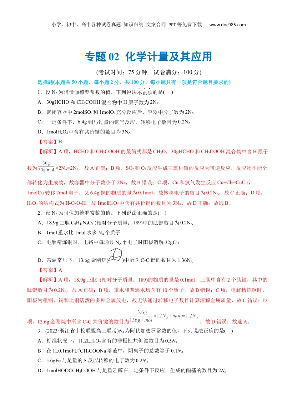 小学、初中、高中各种试卷真题知识归纳文案合同PPT等免费下载www.doc985.com专题02化学计量及其应用(考试时间:75分钟试卷满分:100分)选择题(本题共50小题,每小题2分,共100分。每小题只有一项是符合题目要求的)1.设NA为阿伏伽德罗常数的值,下列说法不正确的是()A.30gHCHO和CH3COOH混合物中H原子数为2NAB.密闭容器中2molSO2和1molO2充分反应后,容器中分子数为2NAC.一定条件下,6.4g铜与过量的氯气反应,转移电子数目为0.2NAD.1molH2O2中含有共价键的数目为3NA【答案】B【解析】A项,HCHO和CH3COOH的最简式都是CH2O,30gHCHO和CH3COOH混合物中含H原子数为×2NA=2NA,故A正确;B项,SO2和O2反应生成三氧化硫的反应为可逆反应,反应物不能全部转化为生成物,故容器中分子数小于2NA,故B错误;C项,Cu和氯气发生反应Cu+Cl2=CuCl2,1molCu转移2mol电子,又6.4g铜的物质的量为0.1mol,故转移电子的数目为0.2NA,故C正确;D项,H2O2的结构式为H-O-O-H,故1molH2O2中含有共价键的数目为3NA,故D正确;故选B。2.设NA为阿伏加德罗常数的值。下列说法正确的是()A.18.9g三肽C6H11N3O4(相对分子质量:189)中的肽键数目为0.2NAB.1mol重水比1mol水多NA个质子C.电解精炼铜时,电路中每通过NA个电子时阳极溶解32gCuD.常温常压下,13.6g金刚烷()中所含C-C键的数目为1.36NA【答案】A【解析】A项,18.9g三肽(相对分子质量:189)的物质的量是0.1mol,三肽中含有2个肽键,其中的肽键数目为0.2NA,故A正确;B项,重水和普通水均含有10个质子,故B错误;C项,电解精炼铜时,阳极为粗铜,铜和比铜活泼的多种金属放电,故无法通过转移电子数目计算溶解金属质量,故C错误;D项,13.6g金刚烷中所含C-C共价键的数目为,故D错误;故选A。3.(2023·浙江省十校联盟高三联考)NA为阿伏加德罗常数的值,下列说法正确的是()A.标准状况下,11.2LH2O2含有的非极性共价键数目为0.5NAB.在1L0.1mol∙L-1CH3COONa溶液中,阴离子的总数等于0.1NAC.5.6gFe与足量的S反应转移的电子数为0.2NAD.1molHOOCCH2COOH与足量乙醇在一定条件下反应,生成的酯基的数目为2NA小学、初中、高中各种试卷真题知识归纳文案合同PPT等免费下载www.doc985.com【答案】C【解析】A项,标准状况下,H2O2呈液态,无法求出11.2LH2O2的物质的量,也就无法求出其含有的非极性共价键数目,A不正确;B项,1L0.1mol∙L-1CH3COONa的物质的量为0.1mol,考虑CH3COO-水解及水电离,阴离子的总数略大于0.1NA,B不正确;C项,5.6gFe(0.1mol)与足量的S反应,生成0.1molFeS,0.1molFe失去0.2mole-,则转移的电子数为0.2NA,C正确;D项,1molHOOCCH2COOH与足量乙醇在一定条件下反应,生成1molH5C2OOCCH2COOC2H5,但反应为可逆反应,所以生成酯基的数目小于2NA,D不正确;故选C。4.(2023·辽宁省大连市一模)NA为阿伏加德罗常数的值。下列叙述正确的是()A.0.1mol/LNa2CO3溶液中,含有的数目为0.2NAB.标准状况下,22.4LCH4和22.4LCl2在光照下充分反应后的分子数为2NAC.1molCaC2晶体和1molCaH2晶体含有的离子数目均为2NAD.一定条件下,5.6gFe与0.1molCl2充分反应,转移的电子数为0.3NA【答案】B【解析】A项,0.1mol/LNa2CO3溶液体积未知,难以计算含有的Na+数目,故A错误;B项,标准状况下,22.4LCH4和22.4LCl2均为1mol,分子数共2NA,甲烷和氯气发生取代反应,反应前后分子总数不变,则充分反应后的分子数为2NA,故B正确;C项,1molCaH2中含1mol钙离子和2mol氢负离子,离子数目为3NA,故C错误;D项,Fe与氯气反应生成氯化铁,5.6gFe为0.1mol,完全反应消耗0.15mol氯气,则氯气量不足,应以氯气的量计算电子数,0.1molCl2完全跟反应得0.2mol电子,即0.2NA,故D错误;故选B。5.设NA为阿伏加德罗常数的值,下列有关叙述不正确的是()A.0.1mol的11B中,含有0.6NA个中子B.0℃、101kPa下,0.1mol乙炔和甲醛(HCHO)的混合物中含有键的数目为0.2NAC.将1molCl2通入足量水中,所得溶液中Cl2、HClO、Cl-、ClO-三种微粒数目之和为2NAD.常温下,1L0.50mol·L-1NH4Cl溶液与2L0.25mol·L-1NH4Cl溶液所含NH4+的物质的量后者小【答案】C【解析】A项,元素符号的左...