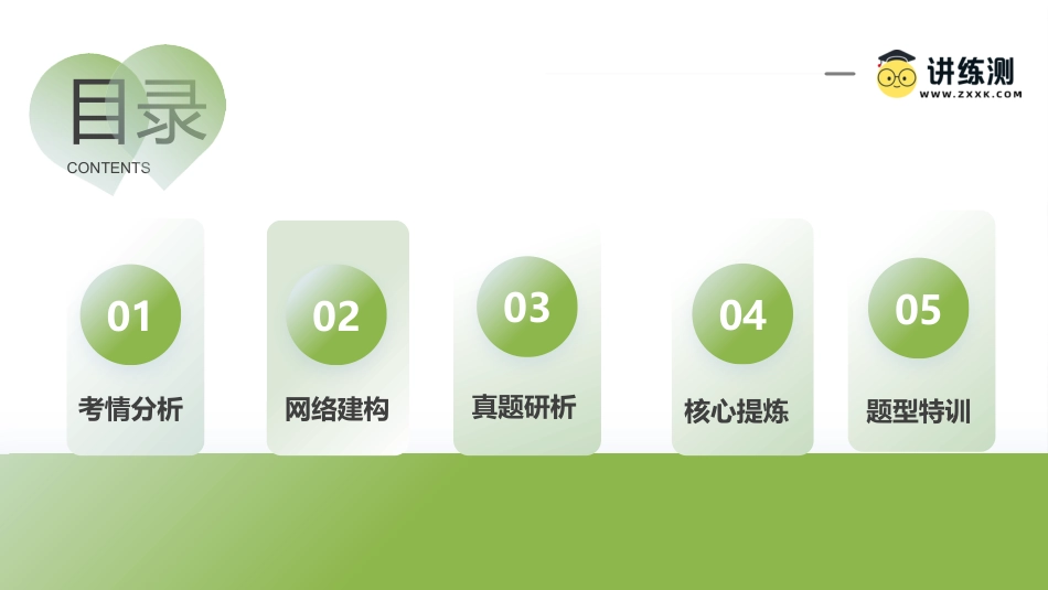 专题14有机合成与推断(题型突破)2024授课:×××高考二轮复习讲练测01考情分析02网络建构03真题研析04核心提炼目录CONTENTS05题型特训考点要求考题统计考情分析物质的组成、性质、分类2023**卷**题,**分2022**卷**题,**分2021**卷**题,**分……传统文化中的性质与变化2023**卷**题,**分2022**卷**题,**分2021**卷**题,**分考情分析有机合成与推断2023浙江1月选考21题,12分;2023湖南卷18题,15分;2022海南卷18题,14分;2022河北卷18题,15分;2022山东卷19题,12分;2022湖南卷19题,15分;2022浙江1月选考31题,12分;2022浙江6月选考31题,12分;2022江苏卷16题,15分;2022广东卷21题,14分;2021全国甲卷36题,15分;2021浙江1月选考31题,12分;2021浙江6月选考31题,12分;2021湖南卷19题,15分;2021河北卷18题,15分;2021广东卷20题,14分;2021山东卷19题,12分;2021天津卷18题,14分;2021海南卷18题,14分;考点要求考题统计考点要求考题统计考情分析物质的组成、性质、分类2023**卷**题,**分2022**卷**题,**分2021**卷**题,**分……传统文化中的性质与变化2023**卷**题,**分2022**卷**题,**分2021**卷**题,**分考点要求考情分析有机合成与推断考情分析【命题规律】1.高考的经典题型:有机合成与推断题。2.常以药物、材料、新物质的合成为背景,根据合成路线命题形式总体可分为三类:1)第一类是有机推断型;2)第二类是结构已知型;3)第三类是“半推半知”型;3.考查的知识点相对比较稳定,有结构简式的推断、官能团的名称、有机物命名、反应类型的判断、有机化学方程式的书写、同分异构体数目的判断、结合核磁共振氢谱书写指定有机物的结构简式、合成路线设计等。【命题预测】1.预计在2024年高考中,仍会以合成新颖的实用有机物为主线,运用典型的合成路线,将信息和问题交织在一起,环环相扣,串联多类有机物结构、性质进行考查;2.重点与难点:同分异构体数目确定和书写,利用题给信息设计简短合成路线。选材热点如下:1——.安全与健康人体必需的营养元素;重金属对人体的危害;食品添加剂;有关化学与健康方面的材料等。2——“”.环境保护新进展雾霾的产生土壤的污染;绿色化学在工农业生产中的导向作用等。3——.新能源的使用新型的燃料电池、高能绿色电池;新能源开发利用的新进展。4.新型无机非金属材料和有机高分子材料在社会、生活中的应用等。5.涉及碳中和、碳达峰的知识。网络建构有机合成推断官能团与反应类型及有机方程式有限定条件同分异构体数目的判断及书写不饱和度与结构的关系取代反应:卤代烃的水解;硝化反应;苯环上的卤代;苯环上的磺化;皂化反应;酯化反应(环酯);二肽水解官能团的结构、性质、命名依据合成框图及相关信息设计有机合成路线有机合成与推断综合不饱和烃:①碳碳双键:;②二烯烃;③碳碳三键:易加成、易氧化、易加聚卤素原子:—X(X表示Cl、Br等):易取代、易消去羟基:①醇—OH:易取代、易消去、易催化氧化、易被强氧化剂氧化;②酚羟基—OH:弱酸性、易氧化、显色反应羰基:①醛基:易氧化、易还原;②(酮)羰基:易还原羧基:酸性(如乙酸的酸性强于碳酸,乙酸与NaOH溶液反应)、易取代(如乙酸与乙醇在浓硫酸、加热条件下发生酯化反应)酯基:易水解(如乙酸乙酯在稀硫酸、加热条件下发生酸性水解,乙酸乙酯在NaOH溶液、加热条件下发生碱性水解)醚键:R—O—R,如环氧乙烷在酸催化下与水一起加热生成乙二醇硝基:—NO2,如酸性条件下,硝基苯在铁粉催化下被还原为苯胺加成反应:烯烃的加成;炔烃的加成;苯环加氢;DielsAlder反应消去反应:醇分子内脱水生成烯烃;卤代烃脱HX生成烯烃加聚反应:单烯烃的加聚;双烯烃的加聚缩聚反应:二元醇与二元酸之间的缩聚;羟基酸的缩聚;氨基酸之间的缩聚;苯酚与HCHO的缩聚氧化反应:催化氧化;醛基与银氨溶液的反应;醛基与新制氢氧化铜的反应还原反应:醛基加氢;硝基还原为氨基化学性质与结构的关系核磁共振氢谱与结构的关系其他限定条件Ω=1:一个双键或一个环Ω=2:一个三键或两个双键或一个双键+一个环Ω=3:三个双键或一个双键+一个三键或一个环+两个双...