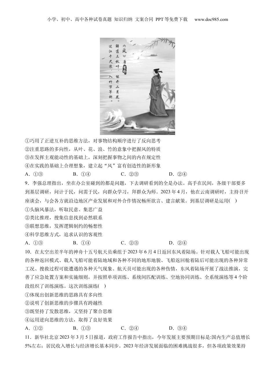 小学、初中、高中各种试卷真题知识归纳文案合同PPT等免费下载www.doc985.com保密★启用前第四单元提高创新思维能力测试卷时间:90分钟分值:100分注意事项:1.答题前填写好自己的姓名、班级、考号等信息2.请将答案正确填写在答题卡上第I卷(选择题)一、单项选择题(每题3分,共45分)1.2023年5月26日,工信部等十部门联合印发《科技成果赋智中小企业专项行动(2023—2025年)》,提出到2025年,健全成果项目库和企业需求库,推动一批先进适用科技成果到中小企业落地转化,促进中小企业产出更多高质量科技成果,带动更多中小企业走“专精特新”发展之路。因此,中小企业应该()①运用创造性思维敢于肯定现在、否定过去②进行科技创新把科技成果转化为现实生产力③明确科技创新的根本目的在于科学理论创新④进行创造性思维要敢于提出新问题开拓新境界A.①②B.①③C.②④D.③④2.想象是联想思维的一种方式。在中国的传统文化中有大量诗词展示了作者丰富的想象力。下列诗词体现了想象思维的是()①知否,知否?应是绿肥红瘦②不识庐山真面目,只缘身在此山中③我欲因之梦吴越,一夜飞度镜湖月④不知细叶谁裁出,二月春风似剪刀A.①②B.①④C.②③D.③④3.“中国节日”系列节目坚持“思想+艺术+技术”的创作路径,突破传统节日晚会“主持人+舞台表演”的创作模式,运用“情景剧+舞台表演”的表达形式,将传统与现代巧妙结合,让藏在历史典籍里的故事跃然屏上,实现了对中国主要传统节日的“活化”传承。“中国节日”系列节目体现了创新思维的()①思路具有单向性,离不开对中华优秀传统文化的继承②思路新,突破常规实现中华优秀传统文化创造性转化③方法新,敢用新手段“情景剧+舞台表演”的表达形式④步骤的跨越性,用独特而巧妙的方法传承中国传统节日A.①②B.①④C.②③D.③④4.“小炉+小饼+小葱”三位一体的“灵魂”吃法使山东淄博烧烤火爆出圈。据淄博当地人讲,小炉子代表温度、小饼代表包容、小葱代表豪爽,文化底蕴与意蕴可见一斑。政府“教科书式”的举措也在持续擦亮“淄博烧烤”名片,如高铁专列、公交专线、监督标准、“金炉奖”评选等。淄博烧烤火爆出圈的原因在于()小学、初中、高中各种试卷真题知识归纳文案合同PPT等免费下载www.doc985.com①运用联想思维,挖掘品牌文化底蕴②抓住主流,以消费者的需求为中心③把握共性中的个性,保持特色不变④注重动态思维,配套服务迅速跟进A.①③B.①④C.②③D.②④5.习近平总书记指出:“问题是创新的起点,也是创新的动力源。”推动创新必须坚持问题导向,通过发现问题、筛选问题、研究问题、解决问题,不断推动社会发展进步。可见,创新思维()①要求突破陈规看问题、另辟蹊径想问题②要以问题为导向,创新结果要能解决问题③是在实践基础上继承前人的认识成果④思路新、方法新、结论新、检验途径新A.①②B.①③C.②④D.③④6.首届中国—中亚峰会期间,中国宇通集团与哈萨克斯坦卡斯杰赫纳公司签署了新能源客车合作协议。针对哈萨克斯坦地区冬季极寒天气,宇通集团在客车防寒保暖性能上下足了“功夫”,采用了“智能加热+快速加热+全方位保温”等多项加热保暖技术,这表明宇通集团()①坚持了联系观点,在继承的基础上实现客车优化升级②运用了创新思维,对新能源客车的发展趋势作出预测③运用了系统思维,整合多项技术提升客车保暖性能④运用了逆向思维,综合考虑各种环境因素设计车型A.①②B.①③C.②④D.③④7.国务委员兼外长秦刚在2023年两会外长记者会上阐述中国式现代化时说,中国式现代化一不靠战争,二不靠殖民,三不靠掠夺。服务少数国家、少数人不是现代化,富者越富、穷者越穷不是现代化,精神空虚、失德失序也不是现代化。从逻辑与思维的角度看,该阐述()①所包含的判断都是关系判断,明确了中国与西方现代化的根本区别②对中国式现代化进行多向思考,为世界展示了人类文明新形态③通过否定定义,科学揭示了中国式现代化的本质属性④以反推正,彰显中国不走老路、不走邪路、勇辟新路的历史自信A.①②B.①④C.②③D.②④8.风是无形的,又是有形的。李峤这首诗,正文中看不见“风”...