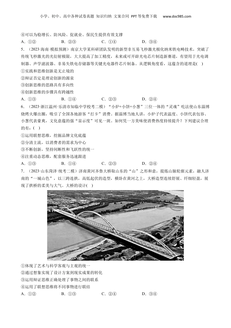 小学、初中、高中各种试卷真题知识归纳文案合同PPT等免费下载www.doc985.com第11课创新思维要善于联想(模拟精练+真题演练)一、单项选择题1.(2023·浙江绍兴·统考二模)反渗透技术作为净水机行业的主流技术,去除重金属等对人体有害物质的同时,也会带走人体必需的矿物质和微量元素。方太公司转换思考方式,经过调查、研究、学习、研发、试验等步骤,历经8年自主研发出“NSP选择性过滤技术”,推动了行业净水技术方向从“安全水”向“健康水”层面迭代升级。方太公司的研发()①表明创新思维的根本动力来自社会实践的需要②对已有的有关事物存在状态的认识作转换性思考③表明经过实践检验的创造性思维才会有实际价值④说明创造性思维的思路新、方法新、结果新A.①③B.②③C.①④D.②④2.(2023·河北保定·校联考三模)1895年,16岁的爱因斯坦这样想象:假如我以光速追随一束光线运动,将会看到什么情景呢?按照牛顿力学的速度合成法则,这束光线好像是一个空间里振荡却停滞不前的电磁场。但是,按照麦克斯韦的电磁场理论,绝不会发生这样的事情。通过这个想象,爱因斯坦提出了著名的“追光疑难”,进而又提出狭义相对论。对此,下列说法正确的是()①爱因斯坦通过提出“假如”式的问题,实现了从新角度去看旧问题②爱因斯坦填补了前辈物理学家经验知识的空白,创造出“虚拟世界”③想象有助于打破人们对事物原有认识的局限性,助力科学理论创新④科学家所进行的不由自主的想象,通常是没有预定目标的无意想象A.①②B.①③C.②④D.③④3.(2023·黑龙江鸡西·鸡东县第二中学校考二模)下列诗句是由两个事物之间存在因果关系而引起的联想的是()①落红不是无情物,化作春泥更护花②白发三千丈,缘愁似个长③春蚕到死丝方尽,蜡炬成灰泪始干④青山有幸埋忠骨,白铁无辜铸佞臣A.①②B.①④C.②③D.③④4.(2023·山东潍坊·统考三模)2023年1月17日,C市发布《支持返乡入乡创新创业促进乡村振兴和县域经济高质量发展的若干措施》,聚焦“人才有优待、用工有补贴、用地有保障、资金有支持、办证有效率”等五个方面,提出了15条可操作、可落实的措施,支持各类人才返乡入乡创新创业。该市的做法()①有利于搞好要素保障,用创新思维务实解决现实问题②坚持了以人民为中心,能够确保就业实现“双向奔赴”③有利于克服市场自发性弊端,完善科学高效的创业制度小学、初中、高中各种试卷真题知识归纳文案合同PPT等免费下载www.doc985.com④可以为稳增长、防风险、促就业、保民生提供有效支撑A.①②B.②③C.①④D.③④5.(2023·海南·模拟预测)南京大学某科研团队发明的新型非互易飞秒激光极化纳米铁电畴技术,突破了传统飞秒激光的光衍射极限,大大提高了加工精度,未来或可开辟光电芯片制造新赛道,有望用于光电调制器、声学滤波器、非易失铁电存储器等关键光电器件芯片制备。从逻辑角度看,这蕴含的道理是()①实践和思维创新是无止境的②辩证否定是理论创新的源泉③创新思维的思路具有多向性④创新思维的步骤具有跨越性A.①③B.①④C.②③D.②④6.(2023·浙江温州·乐清市知临中学校考二模)“小炉+小饼+小葱”三位一体的“灵魂”吃法使山东淄博烧烤火爆出圈,吸引了全国各地游客“打卡”消费。据淄博当地人讲,小炉子代表温度、小饼代表包容、小葱代表豪爽,文化意蕴的强“显示度”可见一斑。如何凭一方美味使消费热度持续提升?下列建议合理的有:()①运用联想思维,挖掘品牌文化底蕴②分清主流,以消费者的需求为中心③不断创新,坚持间断性和飞跃性的统一④注重动态思维,配套服务迅速跟进A.①③B.①④C.②③D.②④7.(2023·山东菏泽·统考二模)济南黄河齐鲁大桥取山东的“山”之形和意,提炼山脉轮廓元素,融人济南的“一城山色”,以三跨连拱,高低起伏的造型,横卧在黄河之上,大桥造型连续舒展、纤细轻盈,展现了拱桥的柔美与大气。大桥的设计()①体现了艺术与科学客观与主观的统一②通过想象实现了设计方案到现实成果的转化③运用辩证思维正确处理了事物之间的联系④运用了联想思维将不同事物进行联结A.①②B.①③C.②④D.③④小学、初中...