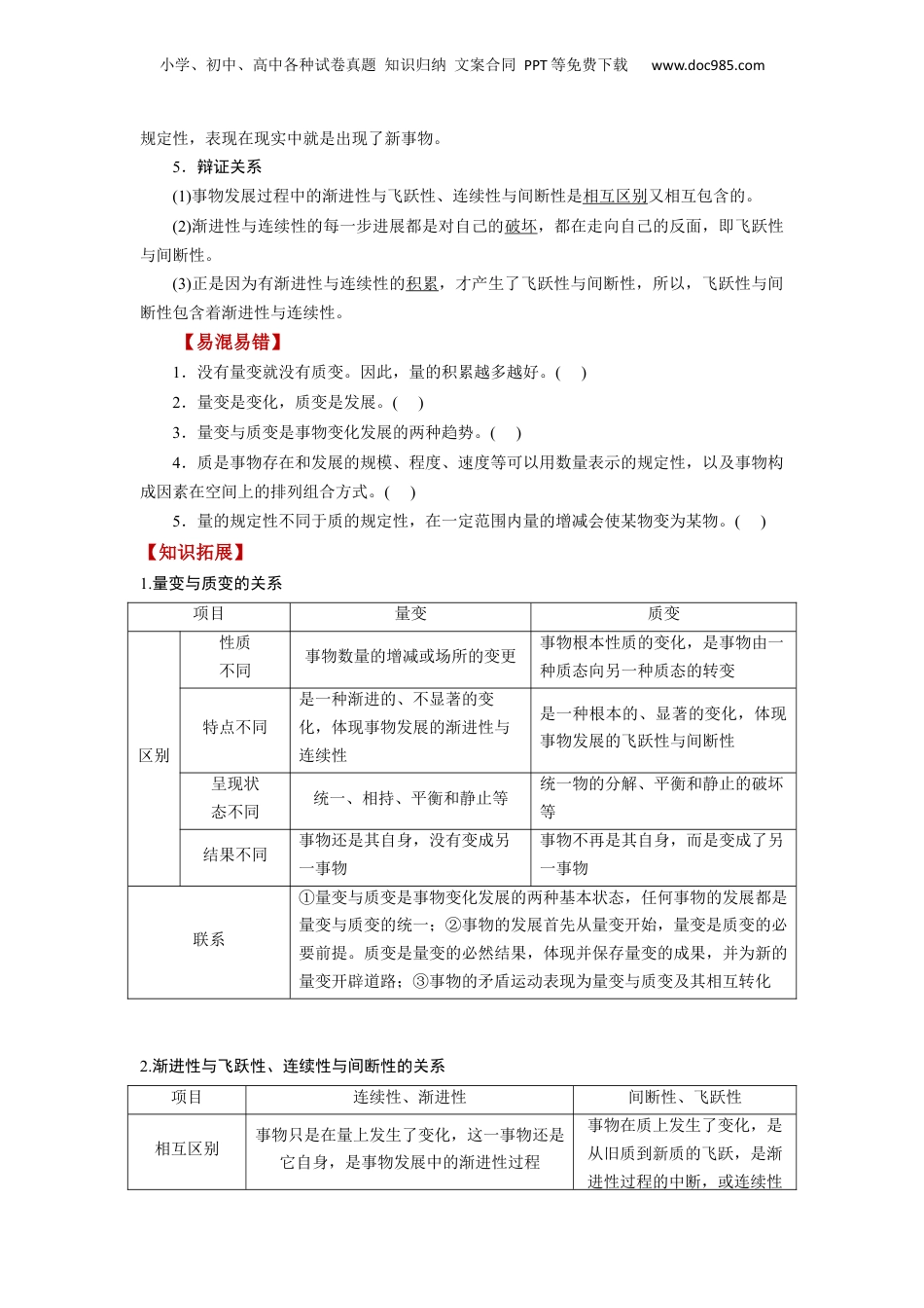 小学、初中、高中各种试卷真题知识归纳文案合同PPT等免费下载www.doc985.com第09课理解质变互变目录考情分析网络构建【速卡片】记考点一认识质量互变规律【夯基·必备基础知识梳理】知识点1质量互变规律的含义知识点2遵循质量互变规律【易混易】错【知拓展】识【提升·必考考向归纳】考向1质量互变规律的含义考向2遵循质量互变规律考点二把握适度原则【夯基·必备基础知识梳理】知识点1适度的含义知识点2掌握适度原则【易混易】错【知拓展】识【提升·必考考向归纳】考向1适度的含义考向2掌握适度原则时政探究【命】题预测真题感悟课标要求考情概览年份试题类型考查考点1.联系事物发展过程中的渐进性和飞跃性,懂得事物的发展过程是量变与质变的统一。2.理解质量互变规律,把握适度原则。2020天津高考真题选择题考查量变与质变辩证关系原理及其方法论2019全国高考真题选择题考查量变与质变辩证关系原理及其方法论小学、初中、高中各种试卷真题知识归纳文案合同PPT等免费下载www.doc985.com【速记卡片】遵循1个规律:质量互变规律的含义、要求及意义掌握1个原则:掌握适度原则的原因及要求区分1个根本标志:区分量变与质变的根本标志掌握2个含义:度与关节点的含义考点一认识质量互变规律知识点1质量互变规律的含义1.质与量质是一事物成为自身并区别于他事物的内部固有的规定性。量是事物存在和发展的规模、程度、速度等可以用数量表示的规定性,以及事物构成因素在空间上的排列组合方式。2.量变与质变量变与质变是事物变化发展的两种基本状态。量变即量的变化,质变即质的变化。量变是质变的必要前提。质变是量变的必然结果,体现并保存量变的成果,并为新的量变开辟道路。知识点2遵循质量互变规律1.要求:以统一性的观念正确把握事物发展过程中的量变与质变、渐进性与飞跃性、连续性与间断性的关系。2.连续性:是指事物只是在量上发生了变化,表现在现实中就是这一事物还是它自身,是事物发展中的渐进性过程。3.间断性:是指事物在质上发生了变化,是从旧质到新质的飞跃,是渐进性过程的中断,或连续性的间断。4.过程:这个过程不是事物停止了发展,而是打破旧的质的规定性而代之以新的质的小学、初中、高中各种试卷真题知识归纳文案合同PPT等免费下载www.doc985.com规定性,表现在现实中就是出现了新事物。5.辩证关系(1)事物发展过程中的渐进性与飞跃性、连续性与间断性是相互区别又相互包含的。(2)渐进性与连续性的每一步进展都是对自己的破坏,都在走向自己的反面,即飞跃性与间断性。(3)正是因为有渐进性与连续性的积累,才产生了飞跃性与间断性,所以,飞跃性与间断性包含着渐进性与连续性。【易混易错】1.没有量变就没有质变。因此,量的积累越多越好。()2.量变是变化,质变是发展。()3.量变与质变是事物变化发展的两种趋势。()4.质是事物存在和发展的规模、程度、速度等可以用数量表示的规定性,以及事物构成因素在空间上的排列组合方式。()5.量的规定性不同于质的规定性,在一定范围内量的增减会使某物变为某物。()【知识拓展】1.量变与质变的关系项目量变质变区别性质不同事物数量的增减或场所的变更事物根本性质的变化,是事物由一种质态向另一种质态的转变特点不同是一种渐进的、不显著的变化,体现事物发展的渐进性与连续性是一种根本的、显著的变化,体现事物发展的飞跃性与间断性呈现状态不同统一、相持、平衡和静止等统一物的分解、平衡和静止的破坏等结果不同事物还是其自身,没有变成另一事物事物不再是其自身,而是变成了另一事物联系①量变与质变是事物变化发展的两种基本状态,任何事物的发展都是量变与质变的统一;②事物的发展首先从量变开始,量变是质变的必要前提。质变是量变的必然结果,体现并保存量变的成果,并为新的量变开辟道路;③事物的矛盾运动表现为量变与质变及其相互转化2.渐进性与飞跃性、连续性与间断性的关系项目连续性、渐进性间断性、飞跃性相互区别事物只是在量上发生了变化,这一事物还是它自身,是事物发展中的渐进性过程事物在质上发生了变化,是从旧质到新质的飞跃,是渐进性过程的中断,或连续性小学、初中、高中各种试...
