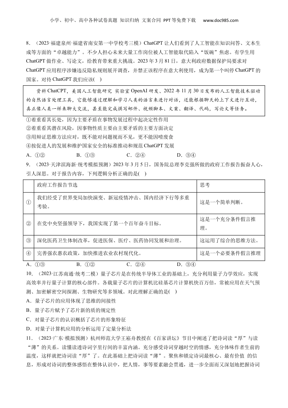 小学、初中、高中各种试卷真题知识归纳文案合同PPT等免费下载www.doc985.com第08课把握辩证分合(模拟精练+真题演练)一、单项选择题1.(2023·河北张家口·统考三模)内蒙古阿鲁科尔沁草原干旱少雨,降雨集中,草场植被自我恢复能力相对脆弱。根据这样的气候和生态特点,草原民族发展出“逐水草而居”的游牧式生产生活方式,依据气候影响下的牧草生长情况,将草场划分出夏牧场和冬牧场,在不同牧场间迁徙,从而实现了草场资源的可持续利用。该思维()①坚持了用辩证思维的方法分析和解决现实问题②坚持在整体性与动态性的对立统一中把握事物③是在分析的基础上将各个要素综合起来考察④用综合的结果指导人们对事物进行新的分析A.①③B.①④C.②③D.②④2.(2023·辽宁沈阳·沈阳二中校考模拟预测)2023年中央一号文件提出要持续深化供销社综合改革,从过去传统单一的日用品、农资经营,向土地托管、配方施肥、电子商务、农村合作金融等为农服务转变,成为健全服务农民生产生活的综合平台,促进乡村振兴。之所以要持续深化供销社综合改革,是因为()①部分影响整体,要立足部分以实现经济发展的最优目标②经济基础决定上层建筑,上层建筑要与经济基础相适应③正确的价值判断与选择必须自觉遵循社会发展客观规律④在实践中要坚持辩证思维的整体性和动态性的有机统一A.①②B.①④C.③④D.②③3.(2023·湖南长沙·长沙一中校考一模)在到本世纪中叶建成社会主义现代化强国目标中,美丽中国是其中一个。我们要推进美丽中国建设,坚持山水林田湖草沙一体化保护和系统治理,协同推进降碳、减污、扩绿、增长,推进生态优先、节约集约、绿色低碳发展。这表明,美丽中国建设()①将注意力放在各个部分之间的联系上,统筹推进②将注意力放在问题的“点”上,力求透彻认识③坚持辩证思维,科学处理了整体与部分之间的关系④坚持辩证思维,精准地预测了事物的发生、发展过程A.①④B.①③C.②③D.②④4.(2023·安徽安庆·二模)下图是某地“文商融合”的发展模式。该模式()小学、初中、高中各种试卷真题知识归纳文案合同PPT等免费下载www.doc985.com①反映了综合思维能够决定事物的发展②表明人们可以根据需要建立新的联系③体现了辩证联系观和综合的思维方法④证明全部社会生活在本质上是实践的A.①②B.①③C.②④D.③④5.(2023·湖南邵阳·统考模拟预测)习近平总书记在二十届中央政治局第一次集体学习时的讲话中强调,各地区各部门要牢固树立全国一盘棋思想,谋划和推动本地区本部门工作要以贯彻党中央决策部署为前提,创造性开展工作,做到既为一域增光,又为全局添彩。这一论述蕴含的思维方法是()①要运用分析方法分解剖析各种认识对象②要运用综合方法把握各部分之间的联系③要善于从整体角度去思考如何开展工作④要善于将事物的变化控制在度的范围内A.①③B.①④C.②③D.②④6.(2023·河北石家庄·统考一模)2023年央视春晚创意节目《满庭芳•国色》取意自中国古典文学词牌名,创作团队用中国传统色作为切入点,以“寻色”“拾色”“唱色”“舞色”为结构,秉持“思想+艺术+技术”的融合创作理念,织就春晚色彩体系的传承与创新之美,并与整台晚会的整体性、系统性美学相协调,形成了对中华优秀传统文化的当代化演绎。从思维角度看,该创作()①把握了肯定与否定之间的对立统一关系②运用定量分析法形成对事物整体的认识③科学地处理了“此”与“彼”之间的关系④把对立双方调和起来达到发展的最佳状态A.①②B.①③C.②④D.③④7.(2023·江苏·江苏省天一中学校考模拟预测)农谚是中国古代先民在长期的农耕实践中总结出来的经验结晶。如农民们发现作物生长与播种农时密切相关,总结出来“人误地一时,地误人一季”“春雨贵如油”等农谚。下列对这两条农谚认识正确的是()A.都具有形象思维的特征,未概括对象本质属性B.对已有的有关事物存在状态的认识作转换性思考C.“人误地一时,地误人一季”体现了辩证思维的动态性D.“春雨贵如油”体现了类比推理的思维方法小学、初中、高中各种试卷真题知识归纳文案合同PPT等免费下载www.doc985.com8.(2023·福...