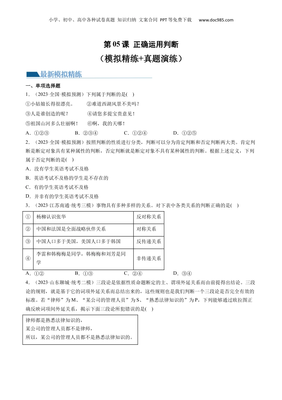 小学、初中、高中各种试卷真题知识归纳文案合同PPT等免费下载www.doc985.com第05课正确运用判断(模拟精练+真题演练)一、单项选择题1.(2023·全国·模拟预测)下列属于判断的是()①小姑娘长得很漂亮。②难道西湖风景不美吗?③人是谁创造的呢?④请您多提宝贵意见!⑤祖国山河多么壮丽啊!⑥啊,我的天哪!A.①②③B.②③④C.①②④D.①②⑤2.(2023·全国·模拟预测)按照判断的性质进行分类,判断可以分为肯定判断和否定判断两大类。肯定判断是断定对象具有某种属性的判断,否定判断就是断定对象不具有某种属性的判断。根据上述定义,下列属于否定判断的是()A.没有学生英语考试不及格B.英语考试不及格的学生是不存在的C.有的学生英语考试不及格D.并非有的学生英语考试不及格3.(2023·江苏南通·统考三模)事物具有多种多样的关系。对下表中各类关系的判断正确的是()①杨柳认识张华反对称关系②中国和法国是全面战略伙伴关系对称关系③中国人口多于美国,美国人口多于韩国反传递关系④李雷和韩梅梅是同学,韩梅梅和刘芳是同学非传递关系A.①②B.①③C.②④D.③④4.(2023·山东聊城·统考二模)三段论是依据性质命题断定的主、谓项外延关系而由前提得出结论。三段论的规则,就是基于它的词项外延关系而总结出来的,这些规则也是我们判断一个三段论是否完全有效的标准。若“律师”为M、“某公司的管理人员”为S、“熟悉法律知识的”为P,下列能够通过欧拉图正确反映词项间外延关系,揭示下面三段论所犯错误的是()律师都是熟悉法律知识的,某公司的管理人员都不是律师,所以,某公司的管理人员都不是熟悉法律知识的。小学、初中、高中各种试卷真题知识归纳文案合同PPT等免费下载www.doc985.comA.B.C.D.5.(2023·天津·校联考一模)以下判断或推理与所违反的逻辑规则相对应的是()判断或推理违反的逻辑规则麻醉就是麻醉剂所起的作用。①定义项不能直接或者间接包含被定义项犯罪分为故意犯罪、过失犯罪、共同犯罪。②划分应逐级进行,不能越级某国领导人在讲话中说:“世界各国,不支持销毁核武器,就是想发展核武器。”③相容选言判断的选言支至少有一个是真班干部都要有集体荣誉感,我不是班干部,所以,我用不着有集体荣誉感。④前提中不周延的项在结论中不得周延A.①②B.①④C.②③D.③④6.(2023·广东深圳·统考二模)一些西方政客认为:“西方的政治制度是民主制度,中国的政治制度不是西方的政治制度,所以中国的政治制度就不是民主制度。”这一观点()①违反了排中律②犯了“四概念”的错误③违反了同一律④犯了“小项不当周延”的错误A.①②B.①④C.②③D.③④7.(2023·安徽·校联考三模)“生存还是毁灭,这是个问题?”说到莎士比亚,很多人会脱口而出来自于《哈姆雷特》的这句经典台词。下列与这句名言采用的判断形式一致的是()①不是鱼死,就是网破②商品滞销,要么是质量差,要么是价格高③动物或是原生动物,或是后生动物④三角形,如果是等角必然是等边A.①③B.①④C.②③D.②④8.(2023·广东汕头·统考三模)中国式现代化既有各国现代化的共同特征,更有基于自己国情的中国特色。对该论断,甲、乙,丙、丁四人分别表达了自己的观点。甲:中国式现代化是中国的现代化乙:中国式现代化与现代化是属种关系丙:上述中国式现代化的论断是选言判断小学、初中、高中各种试卷真题知识归纳文案合同PPT等免费下载www.doc985.com丁:中国式现代化是中国的,也是世界的从逻辑与思维的角度,下列对四人观点的评价正确的是()①甲犯了“同语反复”的逻辑错误②乙正确表达了两者之间的关系③丙正确说明了论断的判断类型④丁没有违反矛盾律的基本要求A.①③B.①④C.②③D.②④9.(2023·河北邯郸·统考三模)党的二十大报告指出:“马克思主义是我们立党立国、兴党兴国的根本指导思想”。下列选项与引言判断类型一致的是()A.世上无难事,只要肯登攀B.书籍是人类进步的阶梯C.所有真理不是一成不变的D.这篇散文文笔生动且富有哲理10.(2023·山东潍坊·统考三模)青色是在可见光谱中介于绿色和蓝色之间的颜色,是大自然的颜色。无论...