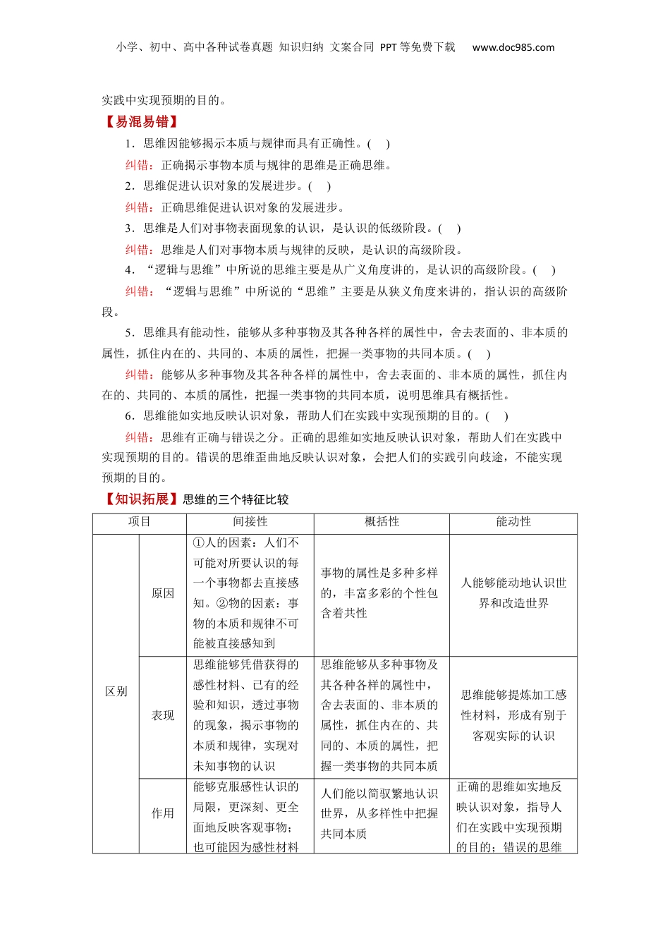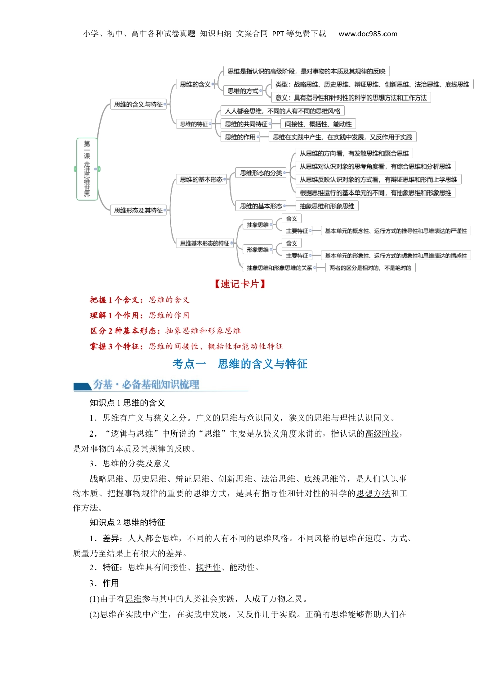 小学、初中、高中各种试卷真题知识归纳文案合同PPT等免费下载www.doc985.com第01课走进思维世界目录考情分析网络构建【速卡片】记考点一思维的含义与特征【夯基·必备基础知识梳理】知识点1思维的含义知识点2思维的特征【易混易】错【知拓展】识【提升·必考考向归纳】考向1思维的含义考向2思维的特征考点二思维形态及其特征【夯基·必备基础知识梳理】知识点1思维的形态及分类知识点2思维的基本形态:抽象思维和形象思维【易混易】错【知拓展】识【提升·必考考向归纳】考向1思维的形态及分类考向2思维的基本形态:抽象思维和形象思维时政探究【命】题预测真题感悟课标要求考情概览年份试题类型考查考点1.描述常见的思维活动,体会思维是人所特有的属性,了解思维的基本形态和特征;懂得正确思维的基本条件。2.区分抽象思维和形象思维。无小学、初中、高中各种试卷真题知识归纳文案合同PPT等免费下载www.doc985.com【速记卡片】把握1个含义:思维的含义理解1个作用:思维的作用区分2种基本形态:抽象思维和形象思维掌握3个特征:思维的间接性、概括性和能动性特征考点一思维的含义与特征知识点1思维的含义1.思维有广义与狭义之分。广义的思维与意识同义,狭义的思维与理性认识同义。2.“逻辑与思维”中所说的“思维”主要是从狭义角度来讲的,指认识的高级阶段,是对事物的本质及其规律的反映。3.思维的分类及意义战略思维、历史思维、辩证思维、创新思维、法治思维、底线思维等,是人们认识事物本质、把握事物规律的重要的思维方式,是具有指导性和针对性的科学的思想方法和工作方法。知识点2思维的特征1.差异:人人都会思维,不同的人有不同的思维风格。不同风格的思维在速度、方式、质量乃至结果上有很大的差异。2.特征:思维具有间接性、概括性、能动性。3.作用(1)由于有思维参与其中的人类社会实践,人成了万物之灵。(2)思维在实践中产生,在实践中发展,又反作用于实践。正确的思维能够帮助人们在小学、初中、高中各种试卷真题知识归纳文案合同PPT等免费下载www.doc985.com实践中实现预期的目的。【易混易错】1.思维因能够揭示本质与规律而具有正确性。()纠错:正确揭示事物本质与规律的思维是正确思维。2.思维促进认识对象的发展进步。()纠错:正确思维促进认识对象的发展进步。3.思维是人们对事物表面现象的认识,是认识的低级阶段。()纠错:思维是人们对事物本质与规律的反映,是认识的高级阶段。4.“逻辑与思维”中所说的思维主要是从广义角度讲的,是认识的高级阶段。()纠错:“逻辑与思维”中所说的“思维”主要是从狭义角度来讲的,指认识的高级阶段。5.思维具有能动性,能够从多种事物及其各种各样的属性中,舍去表面的、非本质的属性,抓住内在的、共同的、本质的属性,把握一类事物的共同本质。()纠错:能够从多种事物及其各种各样的属性中,舍去表面的、非本质的属性,抓住内在的、共同的、本质的属性,把握一类事物的共同本质,说明思维具有概括性。6.思维能如实地反映认识对象,帮助人们在实践中实现预期的目的。()纠错:思维有正确与错误之分。正确的思维如实地反映认识对象,帮助人们在实践中实现预期的目的。错误的思维歪曲地反映认识对象,会把人们的实践引向歧途,不能实现预期的目的。【知识拓展】思维的三个特征比较项目间接性概括性能动性区别原因①人的因素:人们不可能对所要认识的每一个事物都去直接感知。②物的因素:事物的本质和规律不可能被直接感知到事物的属性是多种多样的,丰富多彩的个性包含着共性人能够能动地认识世界和改造世界表现思维能够凭借获得的感性材料、已有的经验和知识,透过事物的现象,揭示事物的本质和规律,实现对未知事物的认识思维能够从多种事物及其各种各样的属性中,舍去表面的、非本质的属性,抓住内在的、共同的、本质的属性,把握一类事物的共同本质思维能够提炼加工感性材料,形成有别于客观实际的认识作用能够克服感性认识的局限,更深刻、更全面地反映客观事物;也可能因为感性材料人们能以简驭繁地认识世界,从多样性中把握共同本质正确的思维如实地反映认识对象,指导人们在实践中实现预期的目...