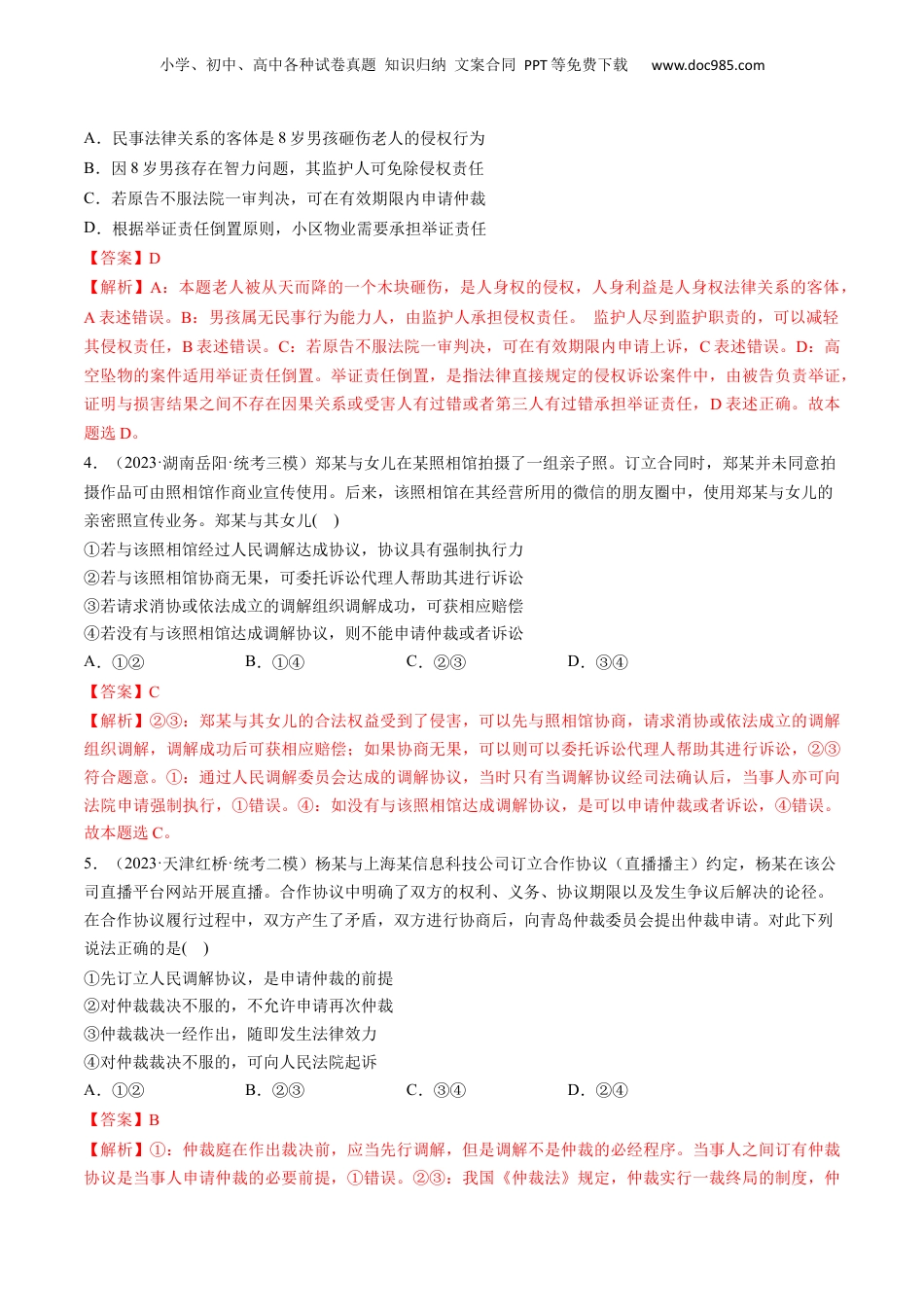小学、初中、高中各种试卷真题知识归纳文案合同PPT等免费下载www.doc985.com第9课纠纷的多元解决方式(模拟精练+真题演练)一、单项选择题1.(2023·河北石家庄·统考三模)人民法院循法而行,依法而治,努力让人民群众切实感受到公平正义。不考虑特殊情况,以下请求可能会得到法院支持的是()①孔某与丈夫感情确已破裂,且调解无效,请求法院判决离婚②甲因乙没有按时还钱,将乙的照片加上贬损性文字公之于众,乙将甲诉至法院③某公司在送货途中因车辆故障无法及时按约送达,请求免除其违约责任④小王因所购车辆有质量问题申请仲裁,但对仲裁结果不满意,将4S店诉至法院A.①②B.①③C.②④D.③④【答案】A【解析】①:我国法律明确规定,“一方坚决要求离婚,经调解无效,可依法判决准予离婚”,若二人感情确已破裂且调解无效,人民法院应当判决离婚,①正确。②:甲因乙没有按时还钱,将乙的照片加上贬损性文字公之于众,这侵犯了乙的名誉权,因此,乙将甲诉至法院,会得到法院支持,②正确。③:车辆发生故障,不属于不可抗力,不能成为违约后的法定免责情形,某公司可以申请延迟交货,但不能免除违约责任,因此,甲请求免除其违约责任不会得到法院的支持,③排除。④:商事仲裁遵循或裁或审,选择了仲裁,就不能再选择诉讼。因此,小王的请求不会得到法院支持,④排除。故本题选A。2.(2023·山东济南·山东省实验中学校考二模)对腿脚不好的老年人来说,家门口的步梯犹如天堑。不少地方的街道社区为加装电梯的事组织过多次居民议事会,却因楼上楼下、老年青年、有无补贴这三类矛盾点的存在,使住户们在加装电梯问题上难以达成一致意见。对此类纠纷的解决,下列说法正确的是()①在维护自身的权利时,应照顾到相邻方的利益②民事主体行使权利,超过正当界限就构成违约③解决邻里纠纷的多元方式中,诉讼是最后途径④低层住户应按少数服从多数原则同意加装电梯A.①②B.③④C.①③D.②④【答案】C【解析】①③:材料中指出老旧小区由于无电梯,老年人出行不便,不少地方的街道社区在加装电梯问题上难以达成一致意见,对于此纠纷应注意到在维护自身的权利时,应照顾到相邻方的利益,若此纠纷始终无法得到解决,诉讼是最后途径,①③正确。②:民事主体行使权利时,应当注意界限,否则就可能会造成侵权责任,而不是违约责任,②不选。④:加装电梯不能简单按照“少数服从多数”原则,更不能损害少数人的合法利益,应该通过充分协商满足大家的合理诉求,④不选。故本题选C。3.(2023·江苏盐城·统考三模)2023年2月,六旬老人肖某某接7岁孙子放学回家,在途经小区二栋和三栋之间的道路时,老人被从天而降的一个木块砸伤。经警方侦查,从天而降的木块系一名智力方面有问题的8岁男孩所扔。伤者家属已放弃调解,起诉了肇事方和小区物业。本案中()小学、初中、高中各种试卷真题知识归纳文案合同PPT等免费下载www.doc985.comA.民事法律关系的客体是8岁男孩砸伤老人的侵权行为B.因8岁男孩存在智力问题,其监护人可免除侵权责任C.若原告不服法院一审判决,可在有效期限内申请仲裁D.根据举证责任倒置原则,小区物业需要承担举证责任【答案】D【解析】A:本题老人被从天而降的一个木块砸伤,是人身权的侵权,人身利益是人身权法律关系的客体,A表述错误。B:男孩属无民事行为能力人,由监护人承担侵权责任。监护人尽到监护职责的,可以减轻其侵权责任,B表述错误。C:若原告不服法院一审判决,可在有效期限内申请上诉,C表述错误。D:高空坠物的案件适用举证责任倒置。举证责任倒置,是指法律直接规定的侵权诉讼案件中,由被告负责举证,证明与损害结果之间不存在因果关系或受害人有过错或者第三人有过错承担举证责任,D表述正确。故本题选D。4.(2023·湖南岳阳·统考三模)郑某与女儿在某照相馆拍摄了一组亲子照。订立合同时,郑某并未同意拍摄作品可由照相馆作商业宣传使用。后来,该照相馆在其经营所用的微信的朋友圈中,使用郑某与女儿的亲密照宣传业务。郑某与其女儿()①若与该照相馆经过人民调解达成协议,协议具有强制执行力②若与该照相馆协商无果,可委托诉讼代理人...