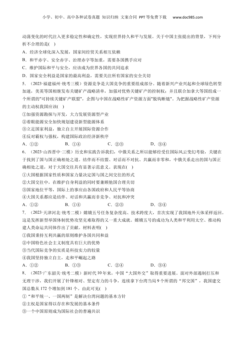 小学、初中、高中各种试卷真题知识归纳文案合同PPT等免费下载www.doc985.com第3课多极化趋势(模拟精练+真题演练)一、单项选择题1.(2023·湖北·模拟预测)2023年2月,美国总统拜登在国情咨文中表示,美国寻求对中国竞争而不是冲突,为了美国的利益会与中国合作,但如果威胁到美国主权,会为守护国家面采取行动。字里行间充斥着“美国利益优先”,更暴露出美国对华政策“对抗是本质、合作是权宜之计、竞争是话语陷阱”的居心。材料给我们的启示是()①竞争、合作、冲突是国际关系的基本形式,美国据此扰乱国际秩序②中美作为较大的主权国家,应该在促进共同发展中谋求本国发展③国际关系的决定性因素是国家利益,国际关系的实质是利益关系④我们要坚决反对一切形式的霸权主义,反对冷战思维和零和博弈A.①②B.②③C.①③D.③④2.(2023·山东济南·山东师范大学附中校考模拟预测)针对美国与日本、荷兰协议限制向中方出口半导体相关设备以阻碍中国在高端科技领域的发展的问题,中国半导体行业协会在2023年2月15日发布严正声明,反对这一破坏现有全球半导体产业生态的行为,指出开放合作是创造价值和促进全球进步的最佳选择,也是半导体产业发展的核心驱动力,号召全体会员单位坚决捍卫全球化产业链稳定,积极应变,发扬行业志气,繁荣产业生态,共创广阔未来。这表明()①中国成为维护世界和平的积极因素和坚定力量②当今国际竞争的实质是以经济和科技为基础的综合国力的较量③追求国家利益是主权国家对外活动的出发点和落脚点④竞争、合作与冲突是国际关系的基本内容A.①③B.①④C.②③D.②④3.(2023·山东济宁·统考三模)“一本中国护照,就是前往最安全地区的通行证,能把你从世界上的任何地方接回家。”近期,苏丹安全局势持续恶化。为保护中国在苏丹人员生命财产安全,中国海军微山湖舰、南宁舰赴苏丹执行撤侨任务。截至4月29日,已撤出1500名多中国公民、231名外籍人员。对此,理解正确的是()①坚定维护国家主权独立是中华民族根本利益所在②强大祖国永远是广大海外侨胞最坚强的后盾③人权高于主权,要切实维护海外侨胞合法权益④我国坚持总体国家安全观,将人民生命安全置于首位A.①②B.①③C.②④D.③④4.(2023·辽宁葫芦岛·统考二模)安全问题事关各国人民的福祉,事关人类的前途命运。2023年2月21日,中国正式发布《全球安全倡议概念文件》,提出中国主张,倡导以团结精神适应深刻调整的国际格局,以共赢思维应对复杂交织的安全挑战。旨在消弭国际冲突根源、完善全球安全治理,推动国际社会携手为小学、初中、高中各种试卷真题知识归纳文案合同PPT等免费下载www.doc985.com动荡变化的时代注入更多稳定性和确定性,实现世界持久和平与发展。关于中国主张提出的背景,下列分析不合理的是()A.经济全球化深入发展,国家间经贸关系相互依赖B.和平赤字、安全赤字、治理赤字等加重,需要各国携手应对C.维护国际和平与安全,应该成为世界各国的共同追求D.国家安全利益是国家的最高利益,需要关注所有国家的安全关切5.(2023·福建福州·统考三模)资源竞争是大国竞争的重要组成部分。随着新兴产业兴起和全球绿色转型加速,美英等国相继发布关键矿产战略清单,加强对优势关键矿产的控制权;并且联合加拿大等国组成一个所谓的"可持续关键矿产联盟",企图与中国在战略性矿产资源方面"脱钩断链"。为把握战略性矿产资源的主动权我国应该()①加强资源勘探与开发,大力发展资源型产业②着眼能源安全加快规划建设新型能源体系③立足国家利益,独立自主开展国际资源合作④反对霸权与强权,构建国际政治经济新秩序A.①②B.①④C.②③D.③④6.(2023·山西晋中·三模)历史和实践告诉我们,中俄关系之所以能够经受住国际风云变幻考验,关键在于找到了国与国正确相处之道。结伴而不结盟、对话而不对抗、共赢而非零和,中俄关系走出的国与国正确相处之道,对于大国交往具有显著示范意义。表现在()①大国根据国家性质和国家力量决定国与国之间交往的形式②大国交往中,在维护自身利益的同时要兼顾他国合理关切③国家地位平等,国际上的事应由各国政府和人民平等...