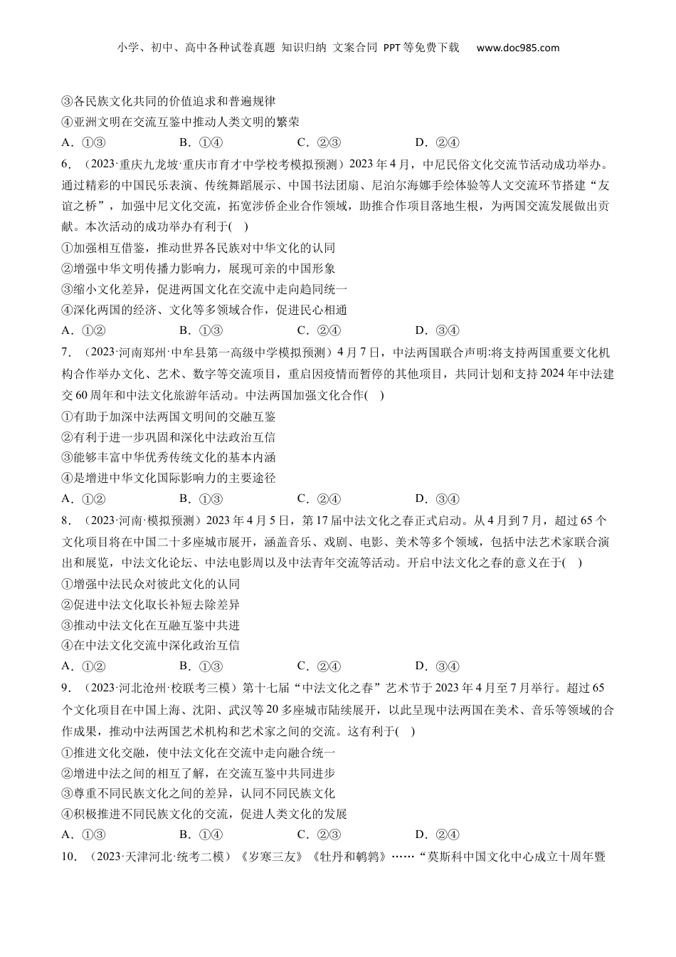 小学、初中、高中各种试卷真题知识归纳文案合同PPT等免费下载www.doc985.com第8课学习借鉴外来文化的有益成果(模拟精练+真题演练)1.(2023·江西抚州·模拟预测)2023年3月15日,习近平主席在中国共产党与世界政党高层对话会的主旨讲话中,首次提出了“全球文明倡议”,指出要共同倡导尊重世界文明多样性,弘扬全人类共同价值,重视文明传承和创新,加强国际人文交流合作等。这一倡议()①将统一不同文明之间的价值内涵②与中国式现代化的内涵相互承接③有利于促进人类文明的包容共存④以中华传统文化的底蕴作为支撑A.①②B.①④C.②③D.③④2.(2023·湖南娄底·统考三模)习近平总书记指出:“每种文明都有其独特魅力和深厚底蕴,都是人类的精神瑰宝”,“意识形态、社会制度、发展模式的差异,不应成为人类文明交流的障碍,更不能成为相互对抗的理由”。这说明()①文化是经济政治的反映②文化是人类进步和开化状态的标志③只要是文明就是积极向上的④要以文明共存超越文明优越A.①②B.①③C.②④D.③④3.(2023·河南·二模)敦煌画院30年来首次出书《敦煌如是绘——接续1600年美的历程》,将精心打磨多年的泥本摹绘壁画一次性展示给读者,“真实”还原壁画的本色。敦煌如是绘,即敦煌是此般绘成的。该书的出版有助于()①带领人们触摸博大精深的中华文化②彰显文化自信的“敦煌力量”③为敦煌文化艺术注入时代内涵④海内外读者对敦煌文化的认同A.①②B.①③C.②④D.③④4.(2023·河南·二模)2023年3月,国家主席习近平在中国共产党与世界政党高层对话会上首次提出全球文明倡议,强调要共同倡导尊重世界文明多样性、共同倡导弘扬全人类共同价值、共同倡导重视文明传承和创新、共同倡导加强国际人文交流合作,引发国际社会积极反响。这是基于()①文化多样性是人类社会的基本特征,是人类文明进步的重要动力②全球文明倡议将有力推动文明交流互鉴,促进不同文明相互认同③不同文明包容共存、交流互鉴,能够推动人类社会现代化进程④世界政党高层对话日益成为世界各国文化交流和传播的主要途径A.①②B.①③C.②④D.③④5.(2023·山东威海·统考二模)亚洲是人类最早的定居地之一,也是人类文明的重要发祥地。2023年4月24日,亚洲文化遗产保护联盟大会在陕西西安举行,一系列文化遗产合作项目相继实施。从中国文物赴日举办“三国志”展,到故宫博物院与巴基斯坦共同主办的“譬若香山:犍陀罗艺术展”亮相紫禁城……在“走出去”和“引进来”的步伐中,文物展览讲述着()①文化遗产独具特色的内涵和文化价值②各国人民在平等交流中推动传统文化的创新小学、初中、高中各种试卷真题知识归纳文案合同PPT等免费下载www.doc985.com③各民族文化共同的价值追求和普遍规律④亚洲文明在交流互鉴中推动人类文明的繁荣A.①③B.①④C.②③D.②④6.(2023·重庆九龙坡·重庆市育才中学校考模拟预测)2023年4月,中尼民俗文化交流节活动成功举办。通过精彩的中国民乐表演、传统舞蹈展示、中国书法团扇、尼泊尔海娜手绘体验等人文交流环节搭建“友谊之桥”,加强中尼文化交流,拓宽涉侨企业合作领域,助推合作项目落地生根,为两国交流发展做出贡献。本次活动的成功举办有利于()①加强相互借鉴,推动世界各民族对中华文化的认同②增强中华文明传播力影响力,展现可亲的中国形象③缩小文化差异,促进两国文化在交流中走向趋同统一④深化两国的经济、文化等多领域合作,促进民心相通A.①②B.①③C.②④D.③④7.(2023·河南郑州·中牟县第一高级中学模拟预测)4月7日,中法两国联合声明:将支持两国重要文化机构合作举办文化、艺术、数字等交流项目,重启因疫情而暂停的其他项目,共同计划和支持2024年中法建交60周年和中法文化旅游年活动。中法两国加强文化合作()①有助于加深中法两国文明间的交融互鉴②有利于进一步巩固和深化中法政治互信③能够丰富中华优秀传统文化的基本内涵④是增进中华文化国际影响力的主要途径A.①②B.①③C.②④D.③④8.(2023·河南·模拟预测)2023年4月5日,第17届中法文化之春正式启动。从4月到7月,超过65个文化项目将在中国二...