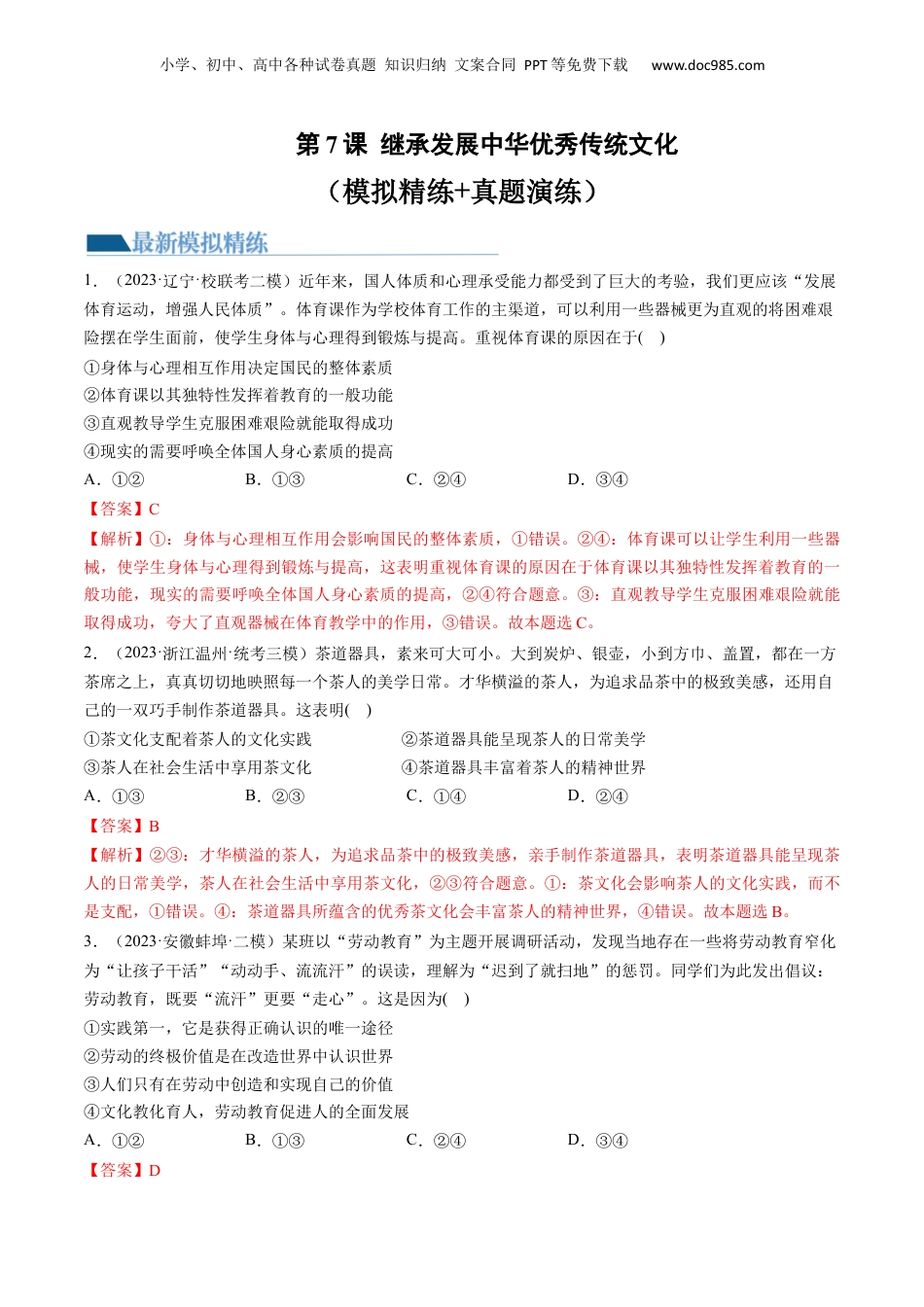 小学、初中、高中各种试卷真题知识归纳文案合同PPT等免费下载www.doc985.com第7课继承发展中华优秀传统文化(模拟精练+真题演练)1.(2023·辽宁·校联考二模)近年来,国人体质和心理承受能力都受到了巨大的考验,我们更应该“发展体育运动,增强人民体质”。体育课作为学校体育工作的主渠道,可以利用一些器械更为直观的将困难艰险摆在学生面前,使学生身体与心理得到锻炼与提高。重视体育课的原因在于()①身体与心理相互作用决定国民的整体素质②体育课以其独特性发挥着教育的一般功能③直观教导学生克服困难艰险就能取得成功④现实的需要呼唤全体国人身心素质的提高A.①②B.①③C.②④D.③④【答案】C【解析】①:身体与心理相互作用会影响国民的整体素质,①错误。②④:体育课可以让学生利用一些器械,使学生身体与心理得到锻炼与提高,这表明重视体育课的原因在于体育课以其独特性发挥着教育的一般功能,现实的需要呼唤全体国人身心素质的提高,②④符合题意。③:直观教导学生克服困难艰险就能取得成功,夸大了直观器械在体育教学中的作用,③错误。故本题选C。2.(2023·浙江温州·统考三模)茶道器具,素来可大可小。大到炭炉、银壶,小到方巾、盖置,都在一方茶席之上,真真切切地映照每一个茶人的美学日常。才华横溢的茶人,为追求品茶中的极致美感,还用自己的一双巧手制作茶道器具。这表明()①茶文化支配着茶人的文化实践②茶道器具能呈现茶人的日常美学③茶人在社会生活中享用茶文化④茶道器具丰富着茶人的精神世界A.①③B.②③C.①④D.②④【答案】B【解析】②③:才华横溢的茶人,为追求品茶中的极致美感,亲手制作茶道器具,表明茶道器具能呈现茶人的日常美学,茶人在社会生活中享用茶文化,②③符合题意。①:茶文化会影响茶人的文化实践,而不是支配,①错误。④:茶道器具所蕴含的优秀茶文化会丰富茶人的精神世界,④错误。故本题选B。3.(2023·安徽蚌埠·二模)某班以“劳动教育”为主题开展调研活动,发现当地存在一些将劳动教育窄化为“让孩子干活”“动动手、流流汗”的误读,理解为“迟到了就扫地”的惩罚。同学们为此发出倡议:劳动教育,既要“流汗”更要“走心”。这是因为()①实践第一,它是获得正确认识的唯一途径②劳动的终极价值是在改造世界中认识世界③人们只有在劳动中创造和实现自己的价值④文化教化育人,劳动教育促进人的全面发展A.①②B.①③C.②④D.③④【答案】D小学、初中、高中各种试卷真题知识归纳文案合同PPT等免费下载www.doc985.com【解析】③④:劳动教育,既要“流汗”更要“走心”,这是因为人们只有在劳动中创造和实现自己的价值,文化教化育人,劳动教育促进人的全面发展,③④符合题意。①:实践是认识的唯一来源,但不是获得认识的唯一途径,①错误。②:劳动的终极价值在于创造价值,而不是在改造世界中认识世界,②错误。故本题选D。4.(2023·全国·二模)漳州市南靖土楼脚下的方圆里·国木复兴馆陈列着一系列主题木雕:“古田会议永放光芒”“二万五千里长征”“三大战役”“四大名著”“清明上河图”“千里江山图”等。这些木雕圈粉无数,人们既叹服于雕刻工艺的巧夺天工,又被其表现出的不屈精神深深感动。这说明()①文化底蕴是发展先进文化的前提②优秀的文化滋养若人们的精神世界③木雕是展现历史和传统文化的载体④多样的形式赋予中华文化新的内涵A.①②B.①③C.②③D.②④【答案】C【解析】①:材料能体现厚重的文化底蕴,但未反映与发展先进文化的关系,且文化底蕴不是发展先进文化的前提,①错误。②:人们既叹服于雕刻工艺的巧夺天工,又被其表现出的不屈精神深深感动,这说明优秀的文化滋养着人们的精神世界,②符合题意。③:通过木雕这种形式展现了革命文化和中华优秀传统文化,这说明木雕是展现历史和传统文化的载体,③正确。④:材料未体现赋予中华文化新的内涵,④不选。故本题选C。5.(2023·湖南岳阳·统考三模)岳麓书院位于湘江西岸秀丽的岳麓山下,为我国著名的“四大书院”之一。它自北宋创始,历宋、元、明、清各代,直至湖南大学,均于旧址扩建,千余年来都是湖南高等...