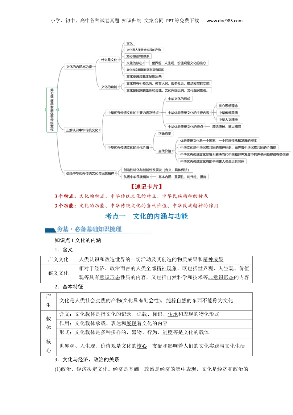 小学、初中、高中各种试卷真题知识归纳文案合同PPT等免费下载www.doc985.com第07课继承发展中华优秀传统文化目录考情分析网络构建【速卡片】记考点一文化的内涵与功能【夯基·必备基础知识梳理】知识点1文化的内涵知识点2文化的功能【易混易】错【知拓展】识【提升·必考考向归纳】考向1文化的内涵考向2文化的功能考点二正确认识中华传统文化【夯基·必备基础知识梳理】知识点1中华优秀传统文化的主要内容及特点知识点2中华优秀传统文化的当代价值【易混易】错【知拓展】识【提升·必考考向归纳】考向1中华优秀传统文化的主要内容及特点考向2中华优秀传统文化的当代价值考点三弘扬中华优秀传统文化与民族精神【夯基·必备基础知识梳理】知识点1创造性转化与创新性发展知识点2弘扬中华民族精神【易混易】错【知拓展】识【提升·必考考向归纳】考向1创造性转化与创新性发展考向2弘扬中华民族精神时政探究【命】题预测真题感悟课标要求考情概览年份试题类型考查考点1.地看待文辩证传统化。2.中秀领会对华优传统文化行造性化、进创转创新性展的重要意。发义3.弘民族精神。扬2023辽宁高考真题选择题考查文化的功能2023全国高考真题选择题考查中华优秀传统文化的当代价值2023广东高考真题选择题考查文化的功能,中华优秀传统文化的主要内容2023浙江高考真题选择题考查正确对待传统文化的态度,创造性转化与创新性发展,弘扬民族精神2022北京高考真题非选择题考查文化的功能,文化的继承与发展小学、初中、高中各种试卷真题知识归纳文案合同PPT等免费下载www.doc985.com【速记卡片】3个特点:文化的特点、中华传统文化的特点、中华民族精神的特点3个功能:文化的功能、中华传统文化的当代价值、中华民族精神的作用考点一文化的内涵与功能知识点1文化的内涵1.含义广义文化人类认识和改造世界的一切活动及其创造的物质成果和精神成果狭义文化相对于经济、政治而言的人类全部精神现象,既包括世界观、人生观、价值观等具有意识形态性质的内容,又包括自然科学和技术等非意识形态的内容2.基本特征产生文化是人类社会实践的产物(文化具有社性会),纯粹自然的东西不能称为文化载体含义:文化载体是指文化的记录、记载、标识、传承和表现的物化形式作用:文化载体承载、表达和展现着文化的内容形式:文化载体是多种多样的,器物、行为、制度等是文化的载体核心世界观、人生观、价值观是文化的核心,支配和影响着人们的文化实践与文化生活3.文化与经济、政治的关系(1)政治、经济决定文化。经济是基础,政治是经济的集中表现,文化是经济和政治的小学、初中、高中各种试卷真题知识归纳文案合同PPT等免费下载www.doc985.com反映,一定的文化由一定的经济、政治所决定。(2)文化反作用于一定的经济、政治,给予经济、政治以重大影响。先进、健康的文化推动社会发展,落后、腐朽的文化阻碍社会的发展。(3)文化具有相对独立性。经济发展是文化发展的基础,但这并不意味着文化的发展始终与经济发展完全同步。文化并不是经济、政治的派生物和附属品。4.文化与文明区别文明与野蛮相对立,是人类进步和开化状态的标志,有物质文明、精神文明、制度文明、生态文明。只要是文明就是积极向上的文化有先进与落后的区分,反映先进的经济和政治的文化形成了先进文化,反映腐朽落后的经济和政治的文化形成了落后文化联系①文化与文明都是实践的产物,其创造主体都是人②先进文化是人类文明的一项重要内容知识点2文化的功能引领风尚文化引导人们认识真善美,为人们提供精神指引,提升全民族的文明素养教育人民文化教化育人,帮助人们提高思想道德素质、科学文化素质和身心健康素质,促进人的全面发展服务社会文化服务社会,满足人们过上美好生活的新期待,为人们提供丰富的精神食粮推动发展文化推动发展,是国家繁荣振兴取之不尽、用之不竭的力量源泉,对提高社会文明程度具有重要作用民族复兴文化是民族的血脉和灵魂。文化兴国运兴,文化强民族强。当代中国,铸牢中华民族共同体意识,要以认同、传承和发展中华优秀文化为前提。没有高度的文化自信,没有文化的繁荣兴盛,就没有中华民族的伟大复兴【易混易错...