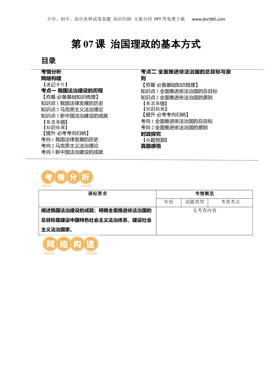 小学、初中、高中各种试卷真题知识归纳文案合同PPT等免费下载www.doc985.com第07课治国理政的基本方式目录考情分析网络构建【速卡片】记考点一我国法治建设的历程【夯基·必备基础知识梳理】知识点1我国法律发展的历史知识点2马克思主义法治理论知识点3新中国法治建设的成就【易混易】错【知拓展】识【提升·必考考向归纳】考向1我国法律发展的历史考向2马克思主义法治理论考向3新中国法治建设的成就考点二全面推进依法治国的总目标与原则【夯基·必备基础知识梳理】知识点1全面推进依法治国的总目标知识点2全面推进依法治国的原则【易混易】错【知拓展】识【提升·必考考向归纳】考向1全面推进依法治国的总目标考向2全面推进依法治国的原则时政探究【命】题预测真题感悟课标要求考情概览年份试题类型考查考点阐述我国法治建设的成就;明确全面推进依法治国的总目标是建设中国特色社会主义法治体系,建设社会主义法治国家。无考查内容小学、初中、高中各种试卷真题知识归纳文案合同PPT等免费下载www.doc985.com【速记卡片】1个总目标:全面推进依法治国的总目标。2种职能:政治职能与社会职能。3点成就:新中国法治建设取得的成就。4种法的类型:即奴隶制法、封建制法、资本主义法和社会主义法。5种原则:全面推进依法治国应该遵循的五种原则。考点一我国法治建设的历程知识点1我国法律发展的历史1.法律的产生、本质和作用法律是人类社会发展到一定历史阶段的产物。法律体现着统治阶级的意志,是实现国家职能的工具,它既维护公共管理秩序,也保障正常的社会生活。2.中国古代的法治历程我国是一个具有五千多年文明史的古国,中华法系源远流长。春秋战国时期,我国开始制定成文法,并通过铸刑鼎、书竹简等方式发布法律。西汉时期,儒家思想成为政治生活的主导思想,强调礼法结合。唐朝时期,我国形成了较为完备的封建法典,并为以后历代封建王朝所传承和发展。中华法系成为世界上独树一帜的法律文明,古老的中国为人类法治发展作出了重要贡献。知识点2马克思主义法治理论1.法的产生法是人类社会发展到一定历史阶段,随着私有制、阶级和国家的出现而逐步产生的。2.法的本质小学、初中、高中各种试卷真题知识归纳文案合同PPT等免费下载www.doc985.com在阶级社会中,法反映的是该社会中在经济上、政治上居于统治地位的阶级的根本利益和共同意志。3.法的决定因素马克思主义认为,法所反映的统治阶级意志的内容最终是由社会物质生活条件决定的。4.法是维持社会秩序、调整社会关系的一种社会规范(1)内涵:法反映并调整一定的社会关系,用规定权利和义务的方式规范人们的行为。法确认、保护和发展有利于统治阶级的社会关系和社会秩序。(2)特点:①法是由国家制定或认可的社会规范。制定和认可是国家创制法律规范的两种基本形式。②法是由国家强制力保证实施的具有普通约束力的社会规范。5.法的功能法在国家治理中既执行政治职能,又执行社会职能。(1)政治职能:即法维护一定阶级统治的作用。(2)社会职能:即法管理一定社会公共事务的作用。知识点3新中国法治建设的成就1.一国法治的决定因素由该国的国情和社会制度所决定并与其相适应。2.中国人民的法治实践依法治国,建设社会主义法治国家,是中国人民的主张、理念,也是中国人民的实践。3.巨大成就(1)形成了以宪法为核心的中国特色社会主义法律体系。(2)依法行政和公正司法水平不断提高。(3)人权的法治保障取得巨大成就。【易混易错】1.近代一些仁人志士,将西方国家的法治模式,移植到中国的努力失败了,所以,建设社会主义法治国家时,要拒绝西方国家的法治模式经验。()2.法治是人类社会一出现就存在的一种现象。()3.自从有了法律以来,法律面前人人平等就成了现实。()4.法在国家治理中只有政治职能,只体现在政治领域。()5.中国共产党坚持依法执政,为人权法治保障提供了坚强的物质保证。()【知识拓展】1.正确理解法的本质法的本质就是统治阶级意志的体现。法是被提升为国家意志的统治阶级的意志的体现。(1)法是统治阶级意志的体现。这说明法的阶级性。法不是超阶级的,它总是一定阶级的意志的体现。(2)法只能属于统治阶级。...