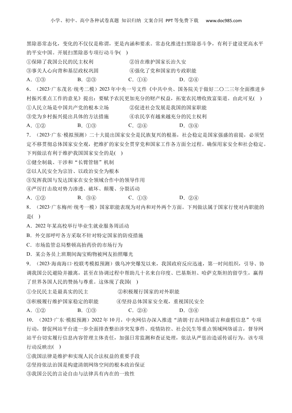 小学、初中、高中各种试卷真题知识归纳文案合同PPT等免费下载www.doc985.com第04课人民民主专政的社会主义国家(模拟精练+真题演练)1.(2023·湖南邵阳·统考三模)2023年3月1日至9月30日,某市开展为期7个月的“春夏雷霆”严打整治专项行动。行动期间坚持“以打促稳、以打促防、以打增效”的工作思路,全警动员、全警参战、全力以赴,严打突出犯罪、严治社会乱象,全力提升人民群众幸福感、安全感、满意度。该市开展“春夏雷霆”专项行动的依据是()①人民民主是社会主义现代化建设的可靠保障②人民民主专政的社会主义国家具有专政职能③人民民主是最广泛、最真实、最管用的民主④我国是人民民主专政的社会主义国家A.①②B.①③C.②④D.③④2.(2023·四川·模拟预测)从收入到就业、从教育到医疗,从养老到社会保障……党的二十大报告聚焦人民群众的操心事、烦心事、揪心事,部署一系列新举措,着力增进民生福祉、回应人民期盼,不断实现人民对美好生活的向往。这说明()①我国人民当家作主的地位得到了充分彰显②我国人民民主是最真实,最管用的民主③中国共产党求真务实,全心全意为人民服务④满足人民的美好生活需要是党的中心任务A.①②B.①③C.②④D.③④3.(2023·北京朝阳·统考二模)从人大“开门立法”,到政府“开门问策”,我们的民主覆盖各个领域、各个行业、各个群体。基层民主的实践从城乡社区的议事会民主恳谈会、民主听证会到党代表、人大代表政协委员联合进社区,从线下“圆桌会”到线上“议事群”,民主参与的形式不断丰富、渠道不断拓展。全过程人民民主()①是全链条、全方位、全覆盖的全民民主②实现了人民民主和国家意志的统一③为人类民主事业发展提供了最终模式④不仅有完整的制度程序而且有完整的参与实践A.①③B.①④C.②③D.②④4.(2023·山东·模拟预测)2023年2月21日,公安部召开“昆仑2023”专项行动动员部署会,部署全国公安机关全面贯彻落实党的二十大精神,坚持以人民为中心,坚持统筹发展与安全,扎实开展“昆仑2023”专项行动,依法严厉打击食药环和知识产权领域突出违法犯罪,全力抓好防风险、保安全、护稳定、促发展各项任务落实。该专项行动()①打击了危害社会主义制度的破坏活动②体现了政府积极协调人民内部的矛盾③有利于切实维护人民群众的合法权益④是积极履行维护国家稳定职能的体现A.①②B.①③C.②④D.③④5.(2023·辽宁·校联考三模)电视剧《狂飙》生动反映了扫黑除恶阶段的变化,从扫黑除恶专项行动到扫小学、初中、高中各种试卷真题知识归纳文案合同PPT等免费下载www.doc985.com黑除恶常态化,变化的不仅仅是称谓,更是内涵和要求。常态化推进扫黑除恶斗争,有利于建设更高水平的平安中国。开展扫黑除恶专项行动斗争()①保障了我国公民的民主权利②旨在维护国家长治久安③事关人心向背和基层政权巩固④强化了党和国家的专政职能A.①③B.②③C.①④D.②④6.(2023·广东茂名·统考二模)2023年中央一号文件《中共中央、国务院关于做好二〇二三年全面推进乡村振兴重点工作的意见》提出:要赋予农民更加充分的财产权益,拓宽农民增收致富渠道。由此可见()①人民立场是中国共产党的根本立场②促进社会发展是我国的国家职能③党为乡村振兴提出具体的方法措施④农民享有越来越充分的民主权利A.①②B.①③C.②④D.③④7.(2023·广东·模拟预测)二十大提出国家安全是民族复兴的根基,社会稳定是国家强盛的前提,必须坚定不移贯彻总体国家安全观,把维扩的家安全贯穿党和国家工作各方面全过程。确保用家安全和社会稳定。下列做法有利于维护我国国家安全的是()①健全制裁、干涉和“长臂管辖”机制②以人民安全为宗旨、以政治安全为根本③发挥我国与发达国家在安全领域合作中的领导作用④严厉打击敌对势力渗透、破坏、颠覆、分裂活动A.①②B.③④C.①③D.②④8.(2023·广东梅州·统考一模)国家职能表现为对内和对外两个方面。下列做法属于国家行使对内职能的是()A.2022年某高校举行毕业生就业服务周活动B.外交部呼吁各方采取不针对特定国家的防疫措施C.市场监管总局整顿高抬药价的市场行为D...
