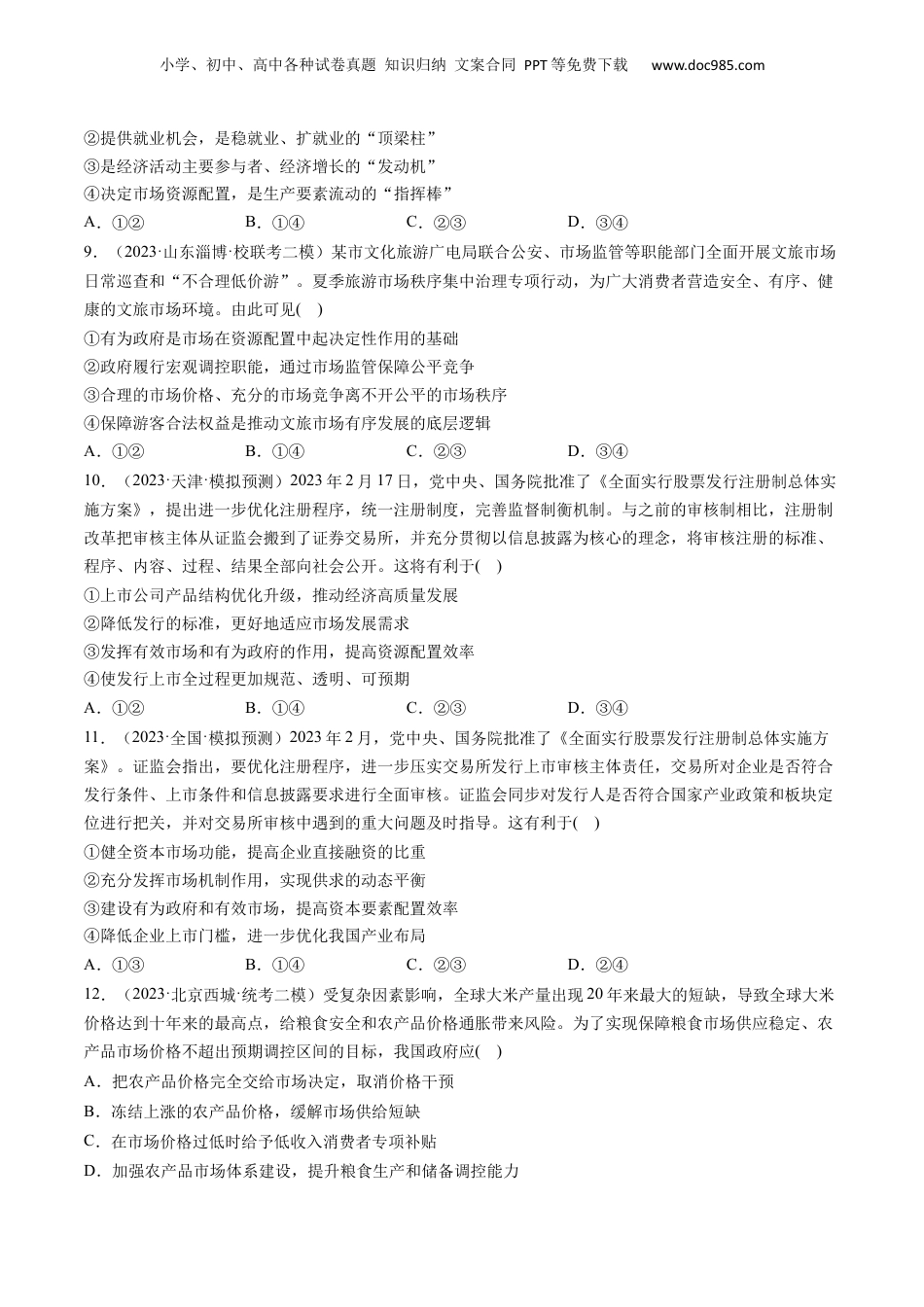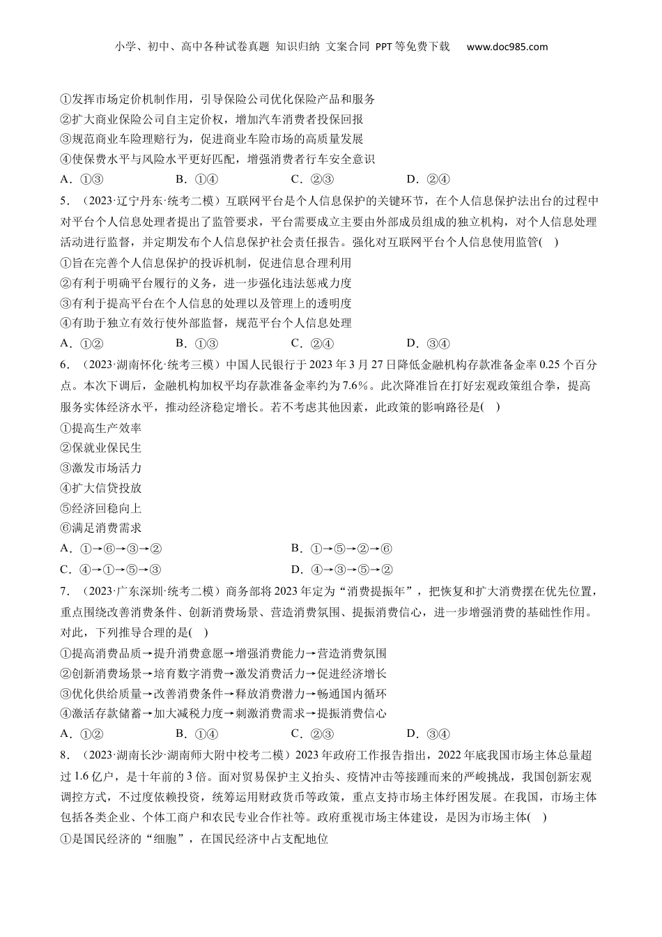 小学、初中、高中各种试卷真题知识归纳文案合同PPT等免费下载www.doc985.com第02课我国的社会主义市场经济体制(模拟精练+真题演练)1.(2023·河北保定·统考二模)在石家庄举行的“2023正定招商大会”现场,河北比邻科技有限公司用时36分钟,完成了公司注册、办理营业执照、刻制发放公章、银行开户及实缴注册资本金等流程,实现了企业“签约即落地”。会上,正定县还推出了鼓励企业家于事创业十条措施、招商选资十条优惠政策等,为企业安心发展保驾护航。这说明()①市场调节具有灵敏、快捷的特点②有为政府才能更好服务经济发展③科学的宏观调控凸显社会主义制度优势④规范的市场环境是企业安心发展的保障A.①③B.①④C.②③D.②④2.(2023·辽宁沈阳·统考三模)为确保房地产市场平稳发展,中国人民银行联合相关部门实施改善优质房企资产负债表计划,聚焦专注主业、资质良好、具有一定系统重要性的优质房企,开展“资产激活”、“负债接续”等行动,主要措施包括新增1500亿元保交楼专项借款投放,加大信贷、债券新增融资支持力度等。上述措施产生预期影响传导路径正确的是()①改善优质房企资产负债状况②提高个人住房贷款平均利率③促进房地产业平稳健康发展④保持优质房企的现金流稳定⑤防范化解优质头部房企风险A.②→①→⑤→③B.④→①→⑤→③C.①→④→③→⑤D.⑤→④→①→③3.(2023·浙江金华·统考三模)2023年“3·15”晚会的主题是“用诚信之光照亮消费信心”。“隔空盗刷”短信,网络水军流量造假、手机竟成窃听器……“网络安全”“互联网治理”领域又双叒成了焦点话题。由此可见()①市场调节不是万能的,有自发性的弊病②手机短信等公共物品不能由市场来调节③需要健全社会征信体系来规范市场秩序④更应使市场在资源配置中起决定性作用A.①③B.①④C.②③D.②④4.(2023·河北衡水·校联考二模)2023年中国银保监会发布通知,明确商业车险自主定价系数的浮动范围由[0.65,1.35]扩大到[0.5,1.5]。此次改革后,对于同一型号的车,在其他因素不变的情况下,保险公司可以在更大范围内采用不同的自主定价系数,事故少的车主将获得更加优惠的车险价格。扩大商业车险自主定价系数范围可以()小学、初中、高中各种试卷真题知识归纳文案合同PPT等免费下载www.doc985.com①发挥市场定价机制作用,引导保险公司优化保险产品和服务②扩大商业保险公司自主定价权,增加汽车消费者投保回报③规范商业车险理赔行为,促进商业车险市场的高质量发展④使保费水平与风险水平更好匹配,增强消费者行车安全意识A.①③B.①④C.②③D.②④5.(2023·辽宁丹东·统考二模)互联网平台是个人信息保护的关键环节,在个人信息保护法出台的过程中对平台个人信息处理者提出了监管要求,平台需要成立主要由外部成员组成的独立机构,对个人信息处理活动进行监督,并定期发布个人信息保护社会责任报告。强化对互联网平台个人信息使用监管()①旨在完善个人信息保护的投诉机制,促进信息合理利用②有利于明确平台履行的义务,进一步强化违法惩戒力度③有利于提高平台在个人信息的处理以及管理上的透明度④有助于独立有效行使外部监督,规范平台个人信息处理A.①②B.①③C.②④D.③④6.(2023·湖南怀化·统考三模)中国人民银行于2023年3月27日降低金融机构存款准备金率0.25个百分点。本次下调后,金融机构加权平均存款准备金率约为7.6%。此次降准旨在打好宏观政策组合拳,提高服务实体经济水平,推动经济稳定增长。若不考虑其他因素,此政策的影响路径是()①提高生产效率②保就业保民生③激发市场活力④扩大信贷投放⑤经济回稳向上⑥满足消费需求A.①→⑥→③→②B.①→⑤→②→⑥C.④→①→⑤→③D.④→③→⑤→②7.(2023·广东深圳·统考二模)商务部将2023年定为“消费提振年”,把恢复和扩大消费摆在优先位置,重点围绕改善消费条件、创新消费场景、营造消费氛围、提振消费信心,进一步增强消费的基础性作用。对此,下列推导合理的是()①提高消费品质→提升消费意愿→增强消费能力→营造消费氛围②创新消费场景→培育数字消费→激发消费活力→促进经济增长③...