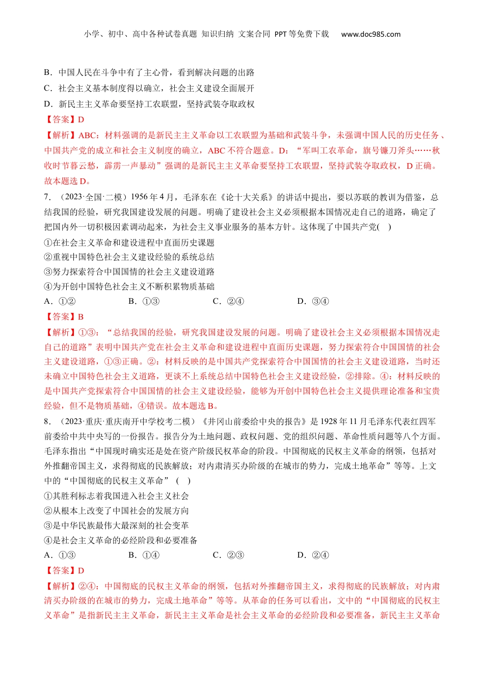 小学、初中、高中各种试卷真题知识归纳文案合同PPT等免费下载www.doc985.com第02课只有社会主义才能救中国(模拟精练+真题演练)1.(2023·浙江温州·统考三模)辛亥革命之后,中国尝试过君主立宪制、议会制、多党制、总统制等各种形式,各种政治势力及其代表人物纷纷登场,但都没能找到正确答案。其主要原因有()①帝国主义不允许中国通过走资本主义道路强大起来②半殖民地半封建的近代中国,资本主义道路走不通③封建势力同帝国主义相勾结及民族资产阶级的弱点④当时我国生产力水平落后及缺乏先进理论的指导A.①③B.①④C.②③D.②④【答案】C【解析】①③:辛亥革命之后的各种救国的尝试都失败了,是因为帝国主义不允许中国通过走资本主义道路强大起来,封建势力同帝国主义相勾结及民族资产阶级的弱点,①③说法正确。②:半殖民地半封建的近代中国,资本主义道路走不通是各种救国的尝试失败得出的结论,而不是原因,②观点不符合题意。④:中国尝试过君主立宪制、议会制、多党制、总统制等各种形式,说明了当时的中国有先进理论的指导,④说法错误。故本题选C。2.(2023·福建·二模)2022年是辛亥革命111周年。喊出“振兴中华”口号的孙中山,领导辛亥革命,推翻了清王朝的统治,建立了中华民国,结束了中国两千多年的封建君主专制制度。但是,革命果实被窃取,“无量头颅无量血,可怜购得假共和”。这启示我们()①为了实现国家富强、人民幸福,必须另辟新路②旧民主主义革命不能改变中国人民和中华民族的悲惨命运③探索复兴之路,必然要经历屈辱岁月和艰辛历程④为实现民族独立,无数仁人志士不屈不挠、前仆后继A.①②B.①③C.②④D.③④【答案】A【解析】①:辛亥革命没有改变旧中国半殖民地半封建社会的性质,没有改变中国人民的悲惨命运,没有完成实现民族独立、人民解放的历史任务,因此,为了实现国家富强、人民幸福,必须另辟新路。故①符合题意。②:辛亥革命是资产阶级领导的旧民主主义革命。旧民主主义革命时期,无论是农民阶级、地主阶级还是资产阶级革命派,所进行的救国尝试无一例外地走向失败。因此,旧民主主义革命不能改变中国人民和中华民族的悲惨命运。故②符合题意。③:辛亥革命果实被窃取,不涉及遭受外辱,故③不符合题意。④:题干强调的是辛亥革命没有完成实现民族独立、人民解放的历史任务,不涉及无数仁人志士为实现民族独立不屈不挠、前仆后继,故④不符合题意。故本题选A。3.(2023·安徽·一模)20世纪初,中国人民寻求救国救民真理的道路屡遭挫折。1917年,十月革命一声炮响,给中国送来了马克思列宁主义。下列关于马克思列宁主义传入中国的过程及其影响,按时间先后排序正确的是()小学、初中、高中各种试卷真题知识归纳文案合同PPT等免费下载www.doc985.com①五四运动促进了马克思列宁主义在中国的传播及与中国工人运动的结合②在马克思列宁主义指导下,新民主主义革命胜利完成,中华人民共和国成立③在俄国十月革命的影响下,中国先进知识分子开始接受和传播马克思列宁主义④在马克思列宁主义同中国工人运动结合的过程中,中国共产党成立A.③→①→④→②B.③→④→①→②C.④→③→②→①D.①→④→②→③【答案】A【解析】①②③④:十月革命发生在1917年,五四运动1919年爆发,中国共产党1921年成立,中华人民共和国1949年成立,故③排第一,①排第二,④排第三,②排第四。故本题选A。4.(2023·全国·二模)习近平总书记在党的二十大报告中指出,“党的百年奋斗成功道路是党领导人民独立自主探索开辟出来的,马克思主义的中国篇章是中国共产党人依靠自身力量实践出来的,贯穿其中的一个基本点就是中国的问题必须从中国基本国情出发,由中国人自己来解答。"以下能够论证这一观点的是()①中国人民和无数仁人志士为了民族复兴苦苦探寻适合国情的政治制度模式②中国民族资产阶级软弱性的局限决定其不能成为反帝反封建的民主革命的领导力量③中国共产党人把马克思主义基本原理同中国革命具体实践结合起来创立了毛泽东思想④中国共产党探索出以农村包围城市、武装夺取政权、最后夺取全国胜利的新民主主义革命道路A.①②B.②...