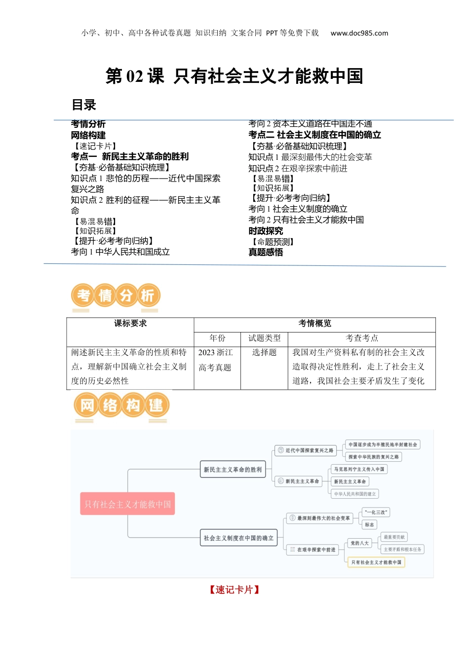 小学、初中、高中各种试卷真题知识归纳文案合同PPT等免费下载www.doc985.com第02课只有社会主义才能救中国目录考情分析网络构建【速卡片】记考点一新民主主义革命的胜利【夯基·必备基础知识梳理】知识点1悲怆的历程——近代中国探索复兴之路知识点2胜利的征程——新民主主义革命【易混易】错【知拓展】识【提升·必考考向归纳】考向1中华人民共和国成立考向2资本主义道路在中国走不通考点二社会主义制度在中国的确立【夯基·必备基础知识梳理】知识点1最深刻最伟大的社会变革知识点2在艰辛探索中前进【易混易】错【知拓展】识【提升·必考考向归纳】考向1社会主义制度的确立考向2只有社会主义才能救中国时政探究【命】题预测真题感悟课标要求考情概览年份试题类型考查考点阐述新民主主义革命的性质和特点,理解新中国确立社会主义制度的历史必然性2023浙江高考真题选择题我国对生产资料私有制的社会主义改造取得决定性胜利,走上了社会主义道路,我国社会主要矛盾发生了变化【速记卡片】小学、初中、高中各种试卷真题知识归纳文案合同PPT等免费下载www.doc985.com把握1个重要思想:毛泽东思想。明确1条总路线和总任务:党在过渡时期的总路线和总任务。理解2大历史任务:近代以后中国人民的历史任务。掌握3个意义:马克思列宁主义传入中国的意义、中华人民共和国成立的意义、中国进入社会主义社会的意义。考点一新民民主义革命的胜利知识点1悲怆的历程——近代中国探索复兴之路1.近代中国社会性质的改变鸦片战争后,中国逐步成为半殖民地半封建社会,陷入内忧外患的黑暗境地。2.近代中国人民必须完成的历史任务近代以后,争取民族独立、人民解放和实现国家富强、人民幸福就成为中国人民的历史任务。3.探索复兴之路(1)为了探索复兴之路,无数仁人志士不屈不挠、前仆后继,进行了可歌可泣的斗争,进行了各式各样的尝试,但终究未能改变旧中国的社会性质和中国人民的悲惨命运。(2)在半殖民地半封建的近代中国,资本主义道路走不通。这是由近代中国的基本国情决定的。知识点2胜利的征程——新民主主义革命1.中国共产党诞生马克思列宁主义传入中国1917年,十月革命一声炮响,给中国送来了马克思列宁主义。中国先进分子从马克思列宁主义的科学真理中看到了解决中国问题的出路五四运动是中国旧民主主义革命走向新民主主义革命的转折点,在近代以来中华民族追求民族独立和发展进步的历史进程中具有里程碑意义中国共产党的诞生1921年,在马克思列宁主义同中国工人运动的结合过程中,中国共产党应运而生。中国人民谋求民族独立、人民解放和国家富强、人民幸福的斗争就有了主心骨2.新民主主义革命道路逐步探索出一条以农村包围城市、武装夺取政权、最后夺取全国胜利的新民主主义革命道路胜利经过28年浴血奋战和顽强奋斗,中国共产党领导中国各族人民,在经历了大革命、土地革命战争、抗日战争和解放战争这四个阶段后,终于在1949年夺取了新民主主义革命的伟大胜利,建立了中华人民共和国法宝统一战线,武装斗争,党的建设,是中国共产党在中国革命中战胜敌人的三个法宝性质新民主主义革命是无产阶级领导的,工农联盟为基础的,人民大众的,反对帝国主义、封建主义和官僚资本主义的民主革命小学、初中、高中各种试卷真题知识归纳文案合同PPT等免费下载www.doc985.com步骤中国半殖民地半封建社会的基本国情,决定了中国革命必须分为民主革命和社会主义革命两个步骤。新民主主义革命是社会主义革命的必要准备,社会主义革命是新民主主义革命的必然趋势。只有完成前一个革命才能完成后一个革命,这两个革命阶段必须互相衔接3.中华人民共和国的成立意义(1)实现了中国从几千年封建专制政治向人民民主的伟大飞跃,彻底结束了旧中国半殖民地半封建社会的历史,使中华民族以崭新的姿态自立于世界民族之林。(2)为实现由新民主主义向社会主义的过渡创造了前提条件,从根本上改变了中国社会的发展方向,为实现国家富强、民族复兴展示了美好前景和现实道路。(3)极大地改变了世界政治力量的对比,鼓舞和推动了世界被压迫民族和被压迫人民争取解放的斗争。4.毛泽东思想创立在中国革命实践中,以毛泽东同志为主...
