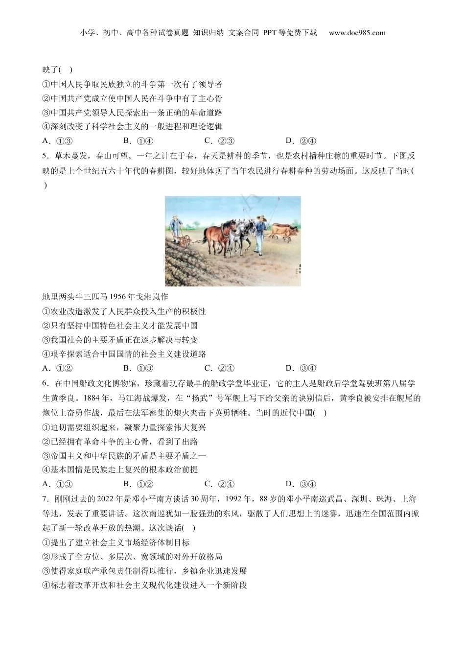 小学、初中、高中各种试卷真题知识归纳文案合同PPT等免费下载www.doc985.com保密★启用前必修1中国特色社会主义测试卷时间:90分钟分值:100分注意事项:1.答题前填写好自己的姓名、班级、考号等信息2.请将答案正确填写在答题卡上第I卷(选择题)一、单项选择题(每题3分,共45分)1.毛泽东在《湖南农民运动考察报告》中指出:“中国的男子,普遍要受政权、族权和神权三种有系统的权力的支配。至于女子,除受上述三种权力的支配以外,还要受男子的支配(夫权)。这四种权力代表了全部封建宗法的思想和制度,是束缚中国人民特别是农民的四条极大的绳索。”对此理解正确的是()①封建国家的显著特征是君主专制、等级森严②农民和封建主的矛盾是封建社会的基本矛盾③农民阶级反抗地主阶级的斗争从来没有停止④最底层的农民背负着整个封建上层等级的重压A.①③B.①④C.②③D.②④2.2023年是科学社会主义诞生的标志——《共产党宣言》发表的175周年。《共产党宣言》是一部科学洞见人类社会发展规律的经典著作,是一部充满斗争精神、批判精神、革命精神的经典著作,是一部秉持人民立场、为人民大众谋利益、为全人类谋解放的经典著作。这体现出《共产党宣言》()①论证了资本主义必然灭亡和社会主义必然胜利的历史必然性②站在人民立场指明无产阶级领导革命探求人类自由解放之路③从理性、正义等原则出发揭露了资本主义的弊端和阶级对立④实现了科学社会主义从理论到现实一国到多国的历史性飞跃A.①②B.①③C.②④D.③④3.“四万万人齐下泪,天涯何处是神州”。太平天国、戊戌变法、义和团运动、辛亥革命……中国人在黑暗中苦苦摸索救亡图存之路;改良主义、自由主义、无政府主义、实用主义、资本主义……终究未能改变旧中国的性质和中国人民的悲惨命运。中国共产党领导中国人民经过28年浴血奋战,取得新民主主义革命的胜利。新民主主义革命“新”在()①革命的领导权始终掌握在无产阶级手里②革命的形式是通过武装斗争来夺取政权③革命的前途最终是过渡到社会主义社会④革命的任务是反对帝国主义和封建主义A.①③B.①④C.②③D.②④4.从北京城区往西一百多千米,顺着一条奔流的小溪,可以到达一个群山环抱的小村庄——堂上村。1943年,歌曲《没有共产党就没有新中国》就诞生在这里,并从这里传遍大江南北,经久不衰。这首歌反小学、初中、高中各种试卷真题知识归纳文案合同PPT等免费下载www.doc985.com映了()①中国人民争取民族独立的斗争第一次有了领导者②中国共产党成立使中国人民在斗争中有了主心骨③中国共产党领导人民探索出一条正确的革命道路④深刻改变了科学社会主义的一般进程和理论逻辑A.①③B.①④C.②③D.②④5.草木蔓发,春山可望。一年之计在于春,春天是耕种的季节,也是农村播种庄稼的重要时节。下图反映的是上个世纪五六十年代的春耕图,较好地体现了当年农民进行春耕春种的劳动场面。这反映了当时()地里两头牛三匹马1956年戈湘岚作①农业改造激发了人民群众投入生产的积极性②只有坚持中国特色社会主义才能发展中国③我国社会的主要矛盾正在逐步解决与转变④艰辛探索适合中国国情的社会主义建设道路A.①②B.①③C.②④D.③④6.在中国船政文化博物馆,珍藏着现存最早的船政学堂毕业证,它的主人是船政后学堂驾驶班第八届学生黄季良。1884年,马江海战爆发,在“扬武”号军舰上写下给父亲的诀别信后,黄季良被安排在舰尾的炮位上奋勇作战,最后在法军密集的炮火夹击下英勇牺牲。当时的近代中国()①迫切需要组织起来,凝聚力量探索伟大复兴②已经拥有革命斗争的主心骨,看到了出路③帝国主义和中华民族的矛盾是主要矛盾之一④基本国情是民族走上复兴的根本政治前提A.①③B.①②C.②④D.③④7.刚刚过去的2022年是邓小平南方谈话30周年,1992年,88岁的邓小平南巡武昌、深圳、珠海、上海等地,发表了重要讲话。这次南巡犹如一股强劲的东风,驱散了人们思想上的迷雾,迅速在全国范围内掀起了新一轮改革开放的热潮。这次谈话()①提出了建立社会主义市场经济体制目标②形成了全方位、多层次、宽领域的对外开放格局③使得家庭联产承包责任制得以推...