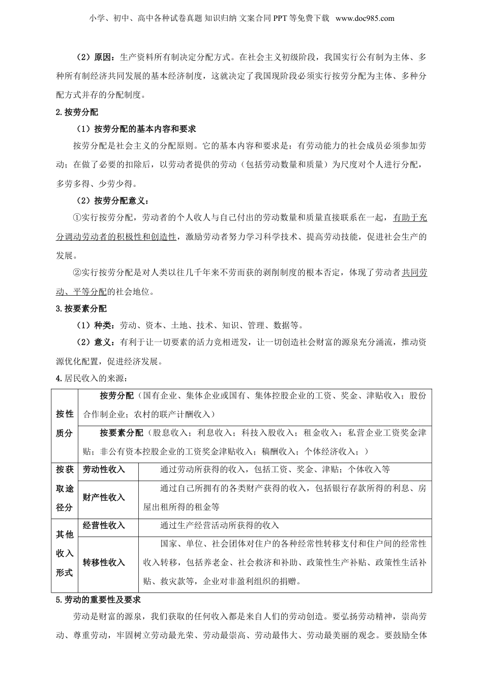 小学、初中、高中各种试卷真题知识归纳文案合同PPT等免费下载www.doc985.com2025年高考政治一轮复习精讲精练第四课我国的个人收入分配与社会保障【课标要求】1.了解我国个人收入的方式与合法途径,解释个人收入分配政策的完善;2.评析实现共同富裕、促进社会公平正义的收入分配政策、社会保障政策,列举完善社会保障体系的措施。【核心素养】政治认同:增强对我国分配制度的政治认同,坚持和完善社会保障制度。科学精神:用全面的观点认识我国居民获得收入的合法途径和方式,增强学生的科学精神。公共参与:积极参与社会调查和实践,弘扬劳动精神,提高守法致富的法治意识,积极为社会保障体系的完善建言献策。【命题预测】从2024年的高考题可以看出,对于本部分内容的考查注重基础性,以传导题的形式考查相关知识,着重考察考生对我国收入分配政策以及社会保障制度作用的分析能力,弘扬正确的劳动观以及择业观,理解社会公平正义与共同富裕的发展目标。【思维导图】【考点梳理】一、按劳分配为主体多种分配方式并存1.我国的个人收入分配制度(1)我国现阶段实行的分配制度:按劳分配为主体、多种分配方式并存。小学、初中、高中各种试卷真题知识归纳文案合同PPT等免费下载www.doc985.com(2)原因:生产资料所有制决定分配方式。在社会主义初级阶段,我国实行公有制为主体、多种所有制经济共同发展的基本经济制度,这就决定了我国现阶段必须实行按劳分配为主体、多种分配方式并存的分配制度。2.按劳分配(1)按劳分配的基本内容和要求按劳分配是社会主义的分配原则。它的基本内容和要求是:有劳动能力的社会成员必须参加劳动;在做了必要的扣除后,以劳动者提供的劳动(包括劳动数量和质量)为尺度对个人进行分配,多劳多得、少劳少得。(2)按劳分配意义:①实行按劳分配,劳动者的个人收人与自己付出的劳动数量和质量直接联系在一起,有助于充分调动劳动者的积极性和创造性,激励劳动者努力学习科学技术、提高劳动技能,促进社会生产的发展。②实行按劳分配是对人类以往几千年来不劳而获的剥削制度的根本否定,体现了劳动者共同劳动、平等分配的社会地位。3.按要素分配(1)种类:劳动、资本、土地、技术、知识、管理、数据等。(2)意义:有利于让一切要素的活力竞相迸发,让一切创造社会财富的源泉充分涌流,推动资源优化配置,促进经济发展。4.居民收入的来源:按性质分按劳分配(国有企业、集体企业或国有、集体控股企业的工资、奖金、津贴收入;股份合作制企业;农村的联产计酬收入)按要素分配(股息收入;利息收入;科技入股收入;租金收入;私营企业工资奖金津贴;非公有资本控股企业的工资奖金津贴收入;稿酬收入;个体经济收入;)按获取途径分劳动性收入通过劳动所获得的收入,包括工资、奖金、津贴;个体收入等财产性收入通过自己所拥有的各类财产获得的收入,包括银行存款所得的利息、房屋出租所得的租金等其他收入形式经营性收入通过生产经营活动所获得的收入转移性收入国家、单位、社会团体对住户的各种经常性转移支付和住户间的经常性收入转移,包括养老金、社会救济和补助、政策性生产补贴、政策性生活补贴、救灾款等,企业对非盈利组织的捐赠。5.劳动的重要性及要求劳动是财富的源泉,我们获取的任何收入都是来自人们的劳动创造。要弘扬劳动精神,崇尚劳动、尊重劳动,牢固树立劳动最光荣、劳动最崇高、劳动最伟大、劳动最美丽的观念。要鼓励全体小学、初中、高中各种试卷真题知识归纳文案合同PPT等免费下载www.doc985.com劳动者通过辛勤劳动、诚实劳动、创造性劳动、守法劳动致富。二、完善个人收入分配1.完善个人收入分配的必要性:分配制度是促进共同富裕的基础性制度。收入分配是民生之源,是改善民生、实现发展成果由人民共享最重要、最直接的方式。为此,必须完善个人收入分配,理顺国家、企业和个人三者的收入分配关系,构建初次分配、再分配、第三次分配协调配套的制度体系,健全体现效率、促进公平的收入分配制度。2.如何完善个人收入分配:(总)理顺国家、企业和个人三者的收入分配关系,构建初次分配、再分配、第三次分配协调配套的制度体系,健全...