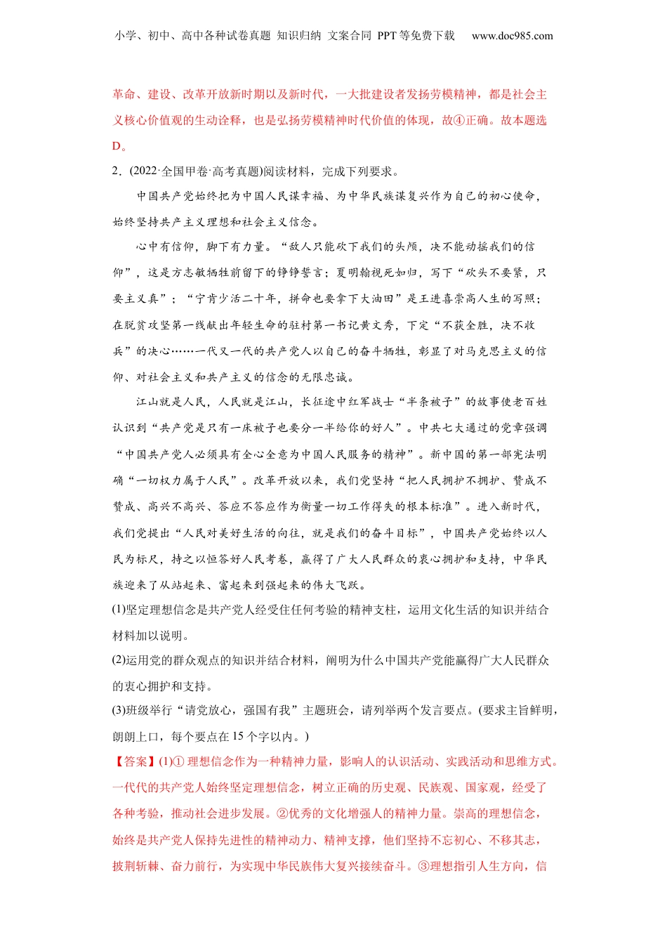 小学、初中、高中各种试卷真题知识归纳文案合同PPT等免费下载www.doc985.com专题12发展中国特色社会主义文化1.(2022·全国乙卷·高考真题)从社会主义革命和建设时期的“高炉卫士”孟泰、“两弹元勋”邓稼先,改革开放新时期的“知识工人”邓建军、“白衣圣人”吴登云,再到新时代的“走钢丝的高空医生”陈国信、“金牌焊工”高凤林……一大批建设者发扬“爱岗敬业、争创一流,艰苦奋斗、勇于创新,淡泊名利、甘于奉献”的劳模精神,续写着中华民族从站起来到富起来、强起来的伟大篇章。劳模精神是()①衡量优秀传统文化的价值尺度②不同劳模独特个性的集中体现③推动创新创造的强大精神力量④社会主义核心价值观的生动诠释A.①②B.①④C.②③D.③④【答案】D【解析】①:衡量优秀传统文化的价值尺度是看它是否适应时代需求,推动社会发展,是否能经受实践检验,是否有助于文化认同,促进民族团结,助力民族复兴,是否能提供精神支撑,是否有益世界文明。该选项夸大了劳模精神的作用。故①错误。②:说法错误,应该是不同劳模共性的体现,故排除②。③:在革命、建设、改革开放新时期以及新时代,一大批建设者发扬“爱岗敬业、争创一流,艰苦奋斗、勇于创新,淡泊名利、甘于奉献”的劳模精神,续写中华民族从站起来到富起来、强起来的伟大篇章。劳模精神是推动创新创造的强大精神力量,故②③正确。④:材料强调的是在小学、初中、高中各种试卷真题知识归纳文案合同PPT等免费下载www.doc985.com革命、建设、改革开放新时期以及新时代,一大批建设者发扬劳模精神,都是社会主义核心价值观的生动诠释,也是弘扬劳模精神时代价值的体现,故④正确。故本题选D。2.(2022·全国甲卷·高考真题)阅读材料,完成下列要求。中国共产党始终把为中国人民谋幸福、为中华民族谋复兴作为自己的初心使命,始终坚持共产主义理想和社会主义信念。心中有信仰,脚下有力量。“敌人只能砍下我们的头颅,决不能动摇我们的信仰”,这是方志敏牺牲前留下的铮铮誓言;夏明翰视死如归,写下“砍头不要紧,只要主义真”;“宁肯少活二十年,拼命也要拿下大油田”是王进喜崇高人生的写照;在脱贫攻坚第一线献出年轻生命的驻村第一书记黄文秀,下定“不获全胜,决不收兵”的决心……一代又一代的共产党人以自己的奋斗牺牲,彰显了对马克思主义的信仰、对社会主义和共产主义的信念的无限忠诚。江山就是人民,人民就是江山,长征途中红军战士“半条被子”的故事使老百姓认识到“共产党是只有一床被子也要分一半给你的好人”。中共七大通过的党章强调“中国共产党人必须具有全心全意为中国人民服务的精神”。新中国的第一部宪法明确“一切权力属于人民”。改革开放以来,我们党坚持“把人民拥护不拥护、赞成不赞成、高兴不高兴、答应不答应作为衡量一切工作得失的根本标准”。进入新时代,我们党提出“人民对美好生活的向往,就是我们的奋斗目标”,中国共产党始终以人民为标尺,持之以恒答好人民考卷,赢得了广大人民群众的衷心拥护和支持,中华民族迎来了从站起来、富起来到强起来的伟大飞跃。(1)坚定理想信念是共产党人经受住任何考验的精神支柱,运用文化生活的知识并结合材料加以说明。(2)运用党的群众观点的知识并结合材料,阐明为什么中国共产党能赢得广大人民群众的衷心拥护和支持。(3)班级举行“请党放心,强国有我”主题班会,请列举两个发言要点。(要求主旨鲜明,朗朗上口,每个要点在15个字以内。)【答案】(1)①理想信念作为一种精神力量,影响人的认识活动、实践活动和思维方式。一代代的共产党人始终坚定理想信念,树立正确的历史观、民族观、国家观,经受了各种考验,推动社会进步发展。②优秀的文化增强人的精神力量。崇高的理想信念,始终是共产党人保持先进性的精神动力、精神支撑,他们坚持不忘初心、不移其志,披荆斩棘、奋力前行,为实现中华民族伟大复兴接续奋斗。③理想指引人生方向,信小学、初中、高中各种试卷真题知识归纳文案合同PPT等免费下载www.doc985.com念决定事业成败,理想信念是中国共产党人的政治灵魂,无数共产党员为了理想信念,高扬爱国主义为核心的民族精神,不畏牺牲...