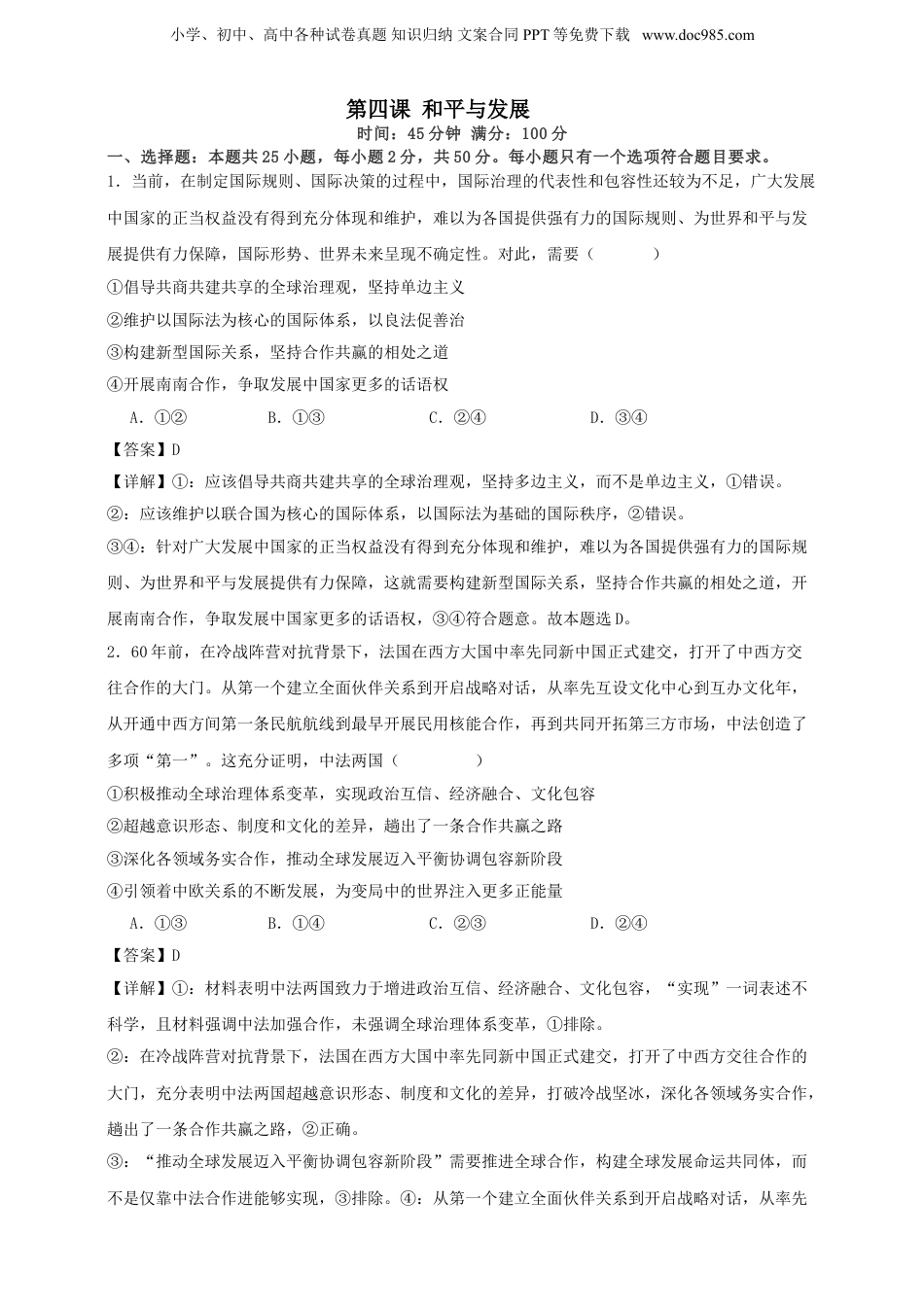 小学、初中、高中各种试卷真题知识归纳文案合同PPT等免费下载www.doc985.com第四课和平与发展时间:45分钟满分:100分一、选择题:本题共25小题,每小题2分,共50分。每小题只有一个选项符合题目要求。1.当前,在制定国际规则、国际决策的过程中,国际治理的代表性和包容性还较为不足,广大发展中国家的正当权益没有得到充分体现和维护,难以为各国提供强有力的国际规则、为世界和平与发展提供有力保障,国际形势、世界未来呈现不确定性。对此,需要()①倡导共商共建共享的全球治理观,坚持单边主义②维护以国际法为核心的国际体系,以良法促善治③构建新型国际关系,坚持合作共赢的相处之道④开展南南合作,争取发展中国家更多的话语权A.①②B.①③C.②④D.③④【答案】D【详解】①:应该倡导共商共建共享的全球治理观,坚持多边主义,而不是单边主义,①错误。②:应该维护以联合国为核心的国际体系,以国际法为基础的国际秩序,②错误。③④:针对广大发展中国家的正当权益没有得到充分体现和维护,难以为各国提供强有力的国际规则、为世界和平与发展提供有力保障,这就需要构建新型国际关系,坚持合作共赢的相处之道,开展南南合作,争取发展中国家更多的话语权,③④符合题意。故本题选D。2.60年前,在冷战阵营对抗背景下,法国在西方大国中率先同新中国正式建交,打开了中西方交往合作的大门。从第一个建立全面伙伴关系到开启战略对话,从率先互设文化中心到互办文化年,从开通中西方间第一条民航航线到最早开展民用核能合作,再到共同开拓第三方市场,中法创造了多项“第一”。这充分证明,中法两国()①积极推动全球治理体系变革,实现政治互信、经济融合、文化包容②超越意识形态、制度和文化的差异,趟出了一条合作共赢之路③深化各领域务实合作,推动全球发展迈入平衡协调包容新阶段④引领着中欧关系的不断发展,为变局中的世界注入更多正能量A.①③B.①④C.②③D.②④【答案】D【详解】①:材料表明中法两国致力于增进政治互信、经济融合、文化包容,“实现”一词表述不科学,且材料强调中法加强合作,未强调全球治理体系变革,①排除。②:在冷战阵营对抗背景下,法国在西方大国中率先同新中国正式建交,打开了中西方交往合作的大门,充分表明中法两国超越意识形态、制度和文化的差异,打破冷战坚冰,深化各领域务实合作,趟出了一条合作共赢之路,②正确。③:“推动全球发展迈入平衡协调包容新阶段”需要推进全球合作,构建全球发展命运共同体,而不是仅靠中法合作进能够实现,③排除。④:从第一个建立全面伙伴关系到开启战略对话,从率先小学、初中、高中各种试卷真题知识归纳文案合同PPT等免费下载www.doc985.com互设文化中心到互办文化年,从开通中西方间第一条民航航线到最早开展民用核能合作,再到共同开拓第三方市场,中法创造了多项“第一”。这充分证明,中法两国引领着中欧关系的不断发展,为变乱交织的世界注入更多稳定性和正能量,④正确。故本题选D。3.普京赢得俄总统选举后谈中俄关系,“我们两国的关系是在过去20年中逐步成型的,两国关系牢固并且互补,我相信这样的关系将继续保持下去。”普京说,“最重要的是,我们的国家利益是一致的,这为解决我们的共同任务以及在国际关系领域创造了有利环境,俄罗斯和中国之间的关系(在国际关系中)是一个稳定因素。”由此可知()①中俄盟友关系是基于双方共同利益作出的战略抉择②中俄增强政治互信有利于顺应当今时代主题的变化③中俄加强双边关系建设有利于推动世界多极化发展④中俄树立相互尊重、合作共赢的新型大国关系典范A.①②B.①③C.②④D.③④【答案】D【详解】①:普京的话表明中俄双方是基于双方共同利益作出的战略抉择,但是中国不与任何国家结盟,“盟友”说法有误,①不选;②:和平与发展是当今时代主题,时代主题没有发生变化,②说法错误。③④:普京的话传递出加强双边关系建设,这有利于推动世界多极化发展,树立相互尊重、合作共赢的新型大国关系典范,③④说法正确;故本题选D。4.2023年3月10日,中国、沙特阿拉伯、伊朗在北京发表三方联合声明。声明指出,为响应...