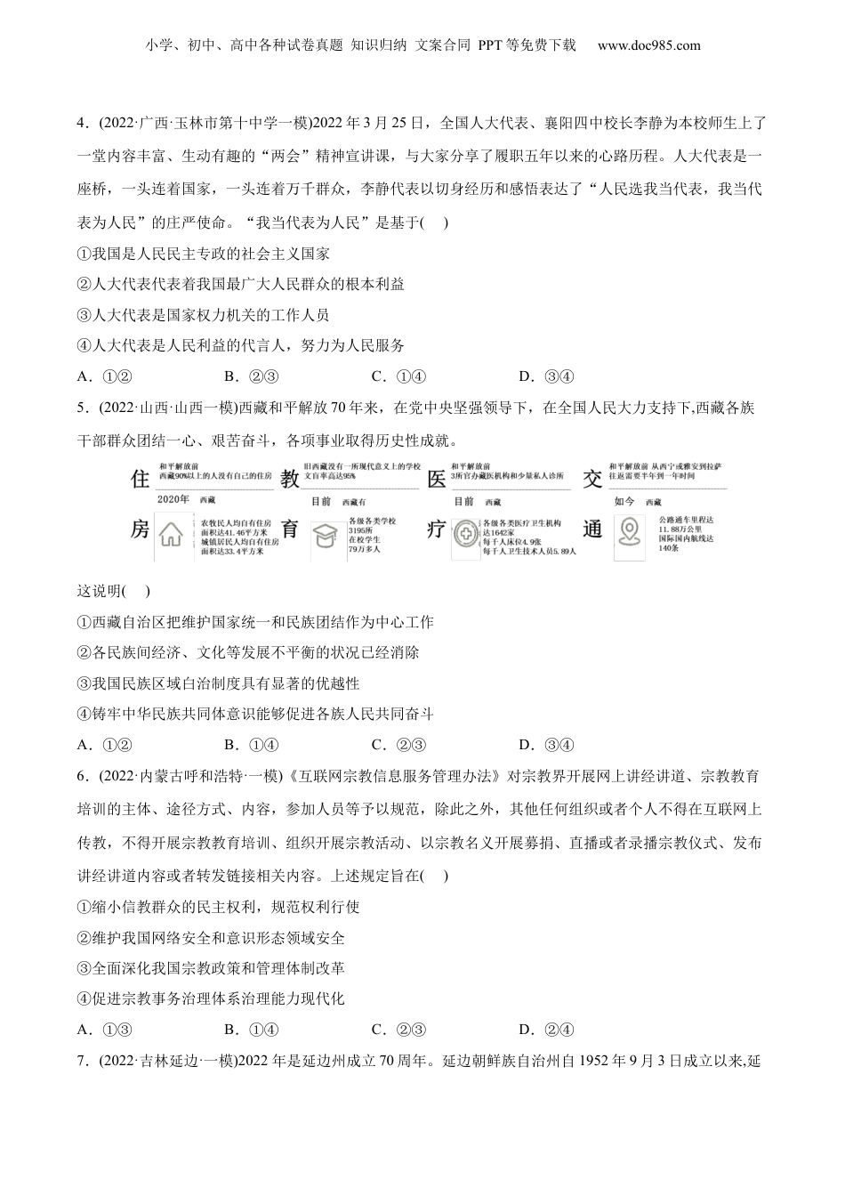 小学、初中、高中各种试卷真题知识归纳文案合同PPT等免费下载www.doc985.com专题07发展社会主义民主政治1.(2022·全国乙卷·高考真题)近年,新疆伽师县饮水安全问题被列入国家重点民生工程。2020年5月,在党和政府的领导下,当地干部群众克服气候恶劣、地质条件差等困难,建成全长1827公里的通水管网,实现城乡饮水安全工程全面通水,40多万各族群众喝上甘甜的“安全水”“幸福水”。该县各族群众饮水安全问题的解决()①彰显了立党为公执政为民的执政理念②开辟了民族地区生态环境保护的新途径③更好地满足了人民群众的美好生活需要④实现了各民族共同发展、共同富裕、共同繁荣A.①②B.①③C.②④D.③④2.(2022·全国甲卷·高考真题)2021年开始施行的《云南省民族团结进步示范区建设条例实施细则》规定,省、州(市)、县(市、区)、乡镇(街道)、村(社区)民族团结进步五级联创,推进民族团结进步创建进机关、进企业、进社区(村)、进乡镇(街道)、进学校、进铁路、进医院、进部队、进宗教活动场所、进出入境边防检查机构等。上述规定()①有利于统筹推进民族团结进步工作机制的建设②构成了边疆民族地区强边固防工作的法规基础③进一步强调全民参与民族团结进步事业的义务和责任④是民族自治机关根据本地情况贯彻执行国家政策的表现A.①②B.①③C.②④D.③④3.(2022·贵州遵义·一模)2020年8月27日,汪洋出席十三届全国政协常委会第十三次会议闭幕式并指出,人民政协要发挥协商民主优势,紧扣“十四五”规划重点议题科学安排协商议政活动,努力提高协商能力,善于把建言资政成果转化为党政部门工作选项。这表明人民政协()①体现了中国特色社会主义制度的鲜明特点②努力使建言资政成果成为国家机关工作的依据③发挥专门协商机构作用助力科学民主决策④坚持把协商议政作为根本活动准则A.①②B.①③C.②④D.③④小学、初中、高中各种试卷真题知识归纳文案合同PPT等免费下载www.doc985.com4.(2022·广西·玉林市第十中学一模)2022年3月25日,全国人大代表、襄阳四中校长李静为本校师生上了一堂内容丰富、生动有趣的“两会”精神宣讲课,与大家分享了履职五年以来的心路历程。人大代表是一座桥,一头连着国家,一头连着万千群众,李静代表以切身经历和感悟表达了“人民选我当代表,我当代表为人民”的庄严使命。“我当代表为人民”是基于()①我国是人民民主专政的社会主义国家②人大代表代表着我国最广大人民群众的根本利益③人大代表是国家权力机关的工作人员④人大代表是人民利益的代言人,努力为人民服务A.①②B.②③C.①④D.③④5.(2022·山西·山西一模)西藏和平解放70年来,在党中央坚强领导下,在全国人民大力支持下,西藏各族干部群众团结一心、艰苦奋斗,各项事业取得历史性成就。这说明()①西藏自治区把维护国家统一和民族团结作为中心工作②各民族间经济、文化等发展不平衡的状况已经消除③我国民族区域白治制度具有显著的优越性④铸牢中华民族共同体意识能够促进各族人民共同奋斗A.①②B.①④C.②③D.③④6.(2022·内蒙古呼和浩特·一模)《互联网宗教信息服务管理办法》对宗教界开展网上讲经讲道、宗教教育培训的主体、途径方式、内容,参加人员等予以规范,除此之外,其他任何组织或者个人不得在互联网上传教,不得开展宗教教育培训、组织开展宗教活动、以宗教名义开展募捐、直播或者录播宗教仪式、发布讲经讲道内容或者转发链接相关内容。上述规定旨在()①缩小信教群众的民主权利,规范权利行使②维护我国网络安全和意识形态领域安全③全面深化我国宗教政策和管理体制改革④促进宗教事务治理体系治理能力现代化A.①③B.①④C.②③D.②④7.(2022·吉林延边·一模)2022年是延边州成立70周年。延边朝鲜族自治州自1952年9月3日成立以来,延小学、初中、高中各种试卷真题知识归纳文案合同PPT等免费下载www.doc985.com边经济社会发展取得了令人瞩目的成就。2021年,延边州公共预算财政收入达到135.88亿元,规模以上工业总产值增长14%,全州呈现出经济发展、政治安定、文化繁荣、社会进步、民族团结、边疆稳定的良好局面。延边州70年沧桑巨变得益于()①坚...
