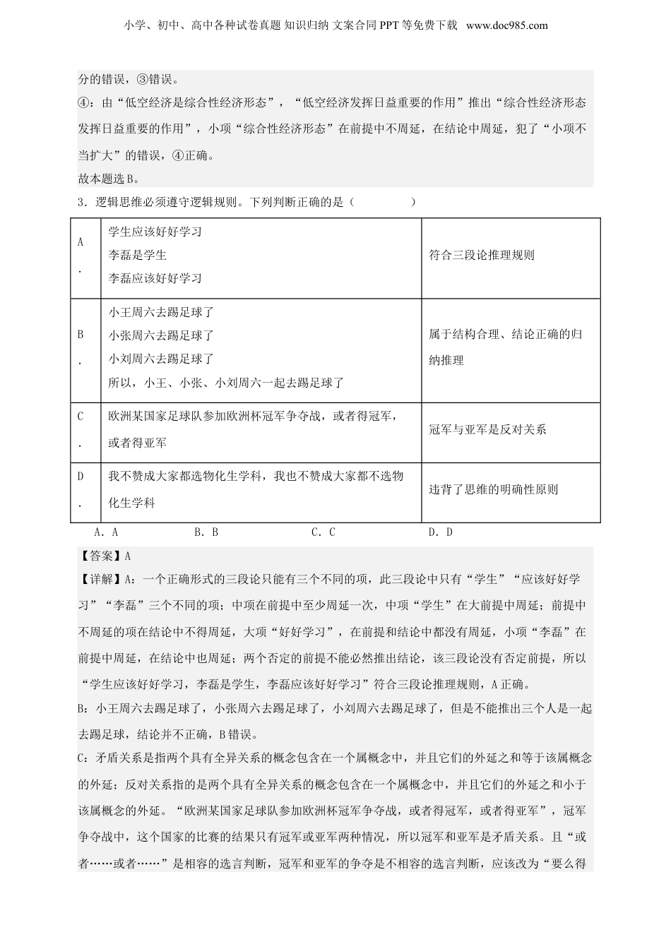 小学、初中、高中各种试卷真题知识归纳文案合同PPT等免费下载www.doc985.com第四课准确把握概念时间:45分钟满分:100分一、选择题:本题共25小题,每小题2分,共50分。每小题只有一个选项符合题目要求。1.F国(a)地处欧洲(b),是欧洲国家(c),是欧盟成员国(d)。abcd四个概念的关系可以图示为()【答案】B【详解】F国(a)、欧洲国家(c)、欧盟成员国(d)与欧洲(b)是全异关系;F国(a)与欧洲国家(c)是种属关系,F国(a)与欧盟成员国(d)也是种属关系;欧洲国家(c)与欧盟成员国(d)是交叉关系。A:图中a与b是种属关系,a与c是全同关系,A不符合题意。B:图中a与c、a与d是种属关系,a、c、d与b是全异关系,c与d是交叉关系,B符合题意。C:图中a与b、c、d都是全同关系,b、c、d是交叉关系,C不符合题意。D:图中a与c、a与d是全同关系,c与d是交叉关系,D不符合题意。故本题选B。2.低空经济是以各种有人驾驶和无人驾驶航空器的各类低空飞行活动为牵引,辐射带动相关领域融合发展的综合性经济形态。低空经济广泛体现于第一、第二、第三产业之中,在促进经济发展、加强社会保障、服务国防事业等方面发挥着日益重要的作用。对此,解读正确的有()①“低空经济”与“综合性经济形态”是种属关系②“低空经济”与“低空飞行活动”是全异关系③“低空经济广泛体现于第一、第二、第三产业之中”犯了越级划分的错误④由“低空经济是综合性经济形态”“低空经济发挥日益重要的作用”推出“综合性经济形态发挥日益重要的作用”,犯了“小项不当扩大”的错误A.①②B.①④C.②③D.③④【答案】B【详解】①:低空经济是以各种有人驾驶和无人驾驶航空器的各类低空飞行活动为牵引,辐射带动相关领域融合发展的综合性经济形态,这里“综合性经济形态”是“低空经济”的属概念,“低空经济”与“综合性经济形态”是种属关系,①正确。②:低空经济是以各类低空飞行活动为牵引的经济形态,“低空经济”与“低空飞行活动”是相容关系,不是全异关系,②错误。③:“低空经济广泛体现于第一、第二、第三产业之中”,三大产业属于同一等级,没有犯越级划小学、初中、高中各种试卷真题知识归纳文案合同PPT等免费下载www.doc985.com分的错误,③错误。④:由“低空经济是综合性经济形态”,“低空经济发挥日益重要的作用”推出“综合性经济形态发挥日益重要的作用”,小项“综合性经济形态”在前提中不周延,在结论中周延,犯了“小项不当扩大”的错误,④正确。故本题选B。3.逻辑思维必须遵守逻辑规则。下列判断正确的是()A.学生应该好好学习李磊是学生李磊应该好好学习符合三段论推理规则B.小王周六去踢足球了小张周六去踢足球了小刘周六去踢足球了所以,小王、小张、小刘周六一起去踢足球了属于结构合理、结论正确的归纳推理C.欧洲某国家足球队参加欧洲杯冠军争夺战,或者得冠军,或者得亚军冠军与亚军是反对关系D.我不赞成大家都选物化生学科,我也不赞成大家都不选物化生学科违背了思维的明确性原则A.AB.BC.CD.D【答案】A【详解】A:一个正确形式的三段论只能有三个不同的项,此三段论中只有“学生”“应该好好学习”“李磊”三个不同的项;中项在前提中至少周延一次,中项“学生”在大前提中周延;前提中不周延的项在结论中不得周延,大项“好好学习”,在前提和结论中都没有周延,小项“李磊”在前提中周延,在结论中也周延;两个否定的前提不能必然推出结论,该三段论没有否定前提,所以“学生应该好好学习,李磊是学生,李磊应该好好学习”符合三段论推理规则,A正确。B:小王周六去踢足球了,小张周六去踢足球了,小刘周六去踢足球了,但是不能推出三个人是一起去踢足球,结论并不正确,B错误。C:矛盾关系是指两个具有全异关系的概念包含在一个属概念中,并且它们的外延之和等于该属概念的外延;反对关系指的是两个具有全异关系的概念包含在一个属概念中,并且它们的外延之和小于该属概念的外延。“欧洲某国家足球队参加欧洲杯冠军争夺战,或者得冠军,或者得亚军”,冠军争夺战中,这个国家的比赛的结果只有冠军或亚军两种情况,所以冠军和亚军是矛盾关系。...