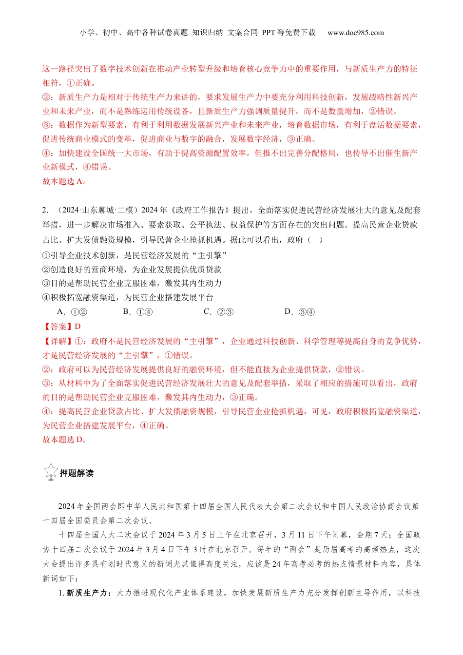 小学、初中、高中各种试卷真题知识归纳文案合同PPT等免费下载www.doc985.com2024年高考政治终极押题猜想(高分的秘密武器:终极密押+押题预测)押题猜想一“两会”聚民智,齐心绘宏图………………………………………………1押题猜想二发展新质生产力,赋能中国式现代化……………………………………17押题猜想三习近平文化思想,引领文化强国航向……………………………………26押题猜想四“一带一路”十周年:成果丰硕,惠及全球……………………………34押题猜想五全面依法治国,建设法治中国………………………………………………47押题猜想六构建新发展格局,推动经济高质量发展……………………………………62押题猜想七勇于自我革命,赢得历史主动………………………………………………79押题猜想八树立科学思维观念,提高创新思维能力……………………………………94押题猜想九传导类选择题秘笈:抓住两头,带动中间…………………………………108押题猜想十漫画类选择题秘笈:明辨褒贬,文字点睛…………………………………117押题猜想十一评析认识类主观题题秘笈:纠偏补正,分说理由…………………………123押题猜想十二探究开放类主观题秘笈:紧扣主题,多措并举…………………………132押题猜想一“两会”聚民智,齐心绘宏图1.(2024·湖南怀化·二模)2024年全国两会期间,牢牢占据两会热词“C位”的当数“新质生产力”。《政府工作报告》提出要大力推进现代化产业体系建设,加快发展新质生产力。加快发展新质生产力,是高质量发展的应有之义,是开辟发展新领域新赛道、培育发展新动能、增强竞争新优势的战略选择。下列关于发展新质生产力的传导路径正确的是()①加快技术创新→赋能产业转型升级→培育产业核心竞争力→赢得发展主动权②培养新型劳动者→熟练运用传统设备→提高全要素生产率→增加产量③培育数据市场→提高数据要素利用率→变革商业模式→发展数字经济④加快建设全国统一大市场→提高资源配置效率→完善分配格局→催生新产业新模式A.①③B.①④C.②③D.②④【答案】A【详解】①:通过加快技术创新可以赋能产业转型升级,进而培育产业的核心竞争力以及赢得发展主动权,小学、初中、高中各种试卷真题知识归纳文案合同PPT等免费下载www.doc985.com这一路径突出了数字技术创新在推动产业转型升级和培育核心竞争力中的重要作用,与新质生产力的特征相符,①正确。②:新质生产力是相对于传统生产力来讲的,要求发展生产力中要充分利用科技创新,发展战略性新兴产业和未来产业,而不是熟练运用传统设备,且新质生产力强调质量提升,而不是数量增加,②错误。③:数据作为新型要素,有利于利用数据发展新兴产业和未来产业,培育数据市场,有利于盘活数据要素,促进传统商业模式的变革,促进商业与数字的融合,发展数字经济,③正确。④:加快建设全国统一大市场,有助于提高资源配置效率,但推不出完善分配格局,也传导不出催生新产业新模式,④错误。故本题选A。2.(2024·山东聊城·二模)2024年《政府工作报告》提出,全面落实促进民营经济发展壮大的意见及配套举措,进一步解决市场准入、要素获取、公平执法、权益保护等方面存在的突出问题。提高民营企业贷款占比、扩大发债融资规模,引导民营企业抢抓机遇。据此可以看出,政府()①引导企业技术创新,是民营经济发展的“主引擎”②创造良好的营商环境,为企业发展提供优质贷款③目的是帮助民营企业克服困难,激发其内生动力④积极拓宽融资渠道,为民营企业搭建发展平台A.①②B.①④C.②③D.③④【答案】D【详解】①:政府不是民营经济发展的“主引擎”,企业通过科技创新、科学管理等提高自身的竞争优势,才是民营经济发展的“主引擎”,①错误。②:政府可以为民营经济发展提供良好的融资环境,但不能直接为企业提供贷款,②错误。③:从材料中为了全面落实促进民营经济发展壮大的意见及配套举措,采取了相应的措施可以看出,政府的目的是帮助民营企业克服困难,激发其内生动力,③正确。④:提高民营企业贷款占比、扩大发债融资规模,引导民营企业抢抓机遇,可见,政府积极拓宽融资渠道,...
