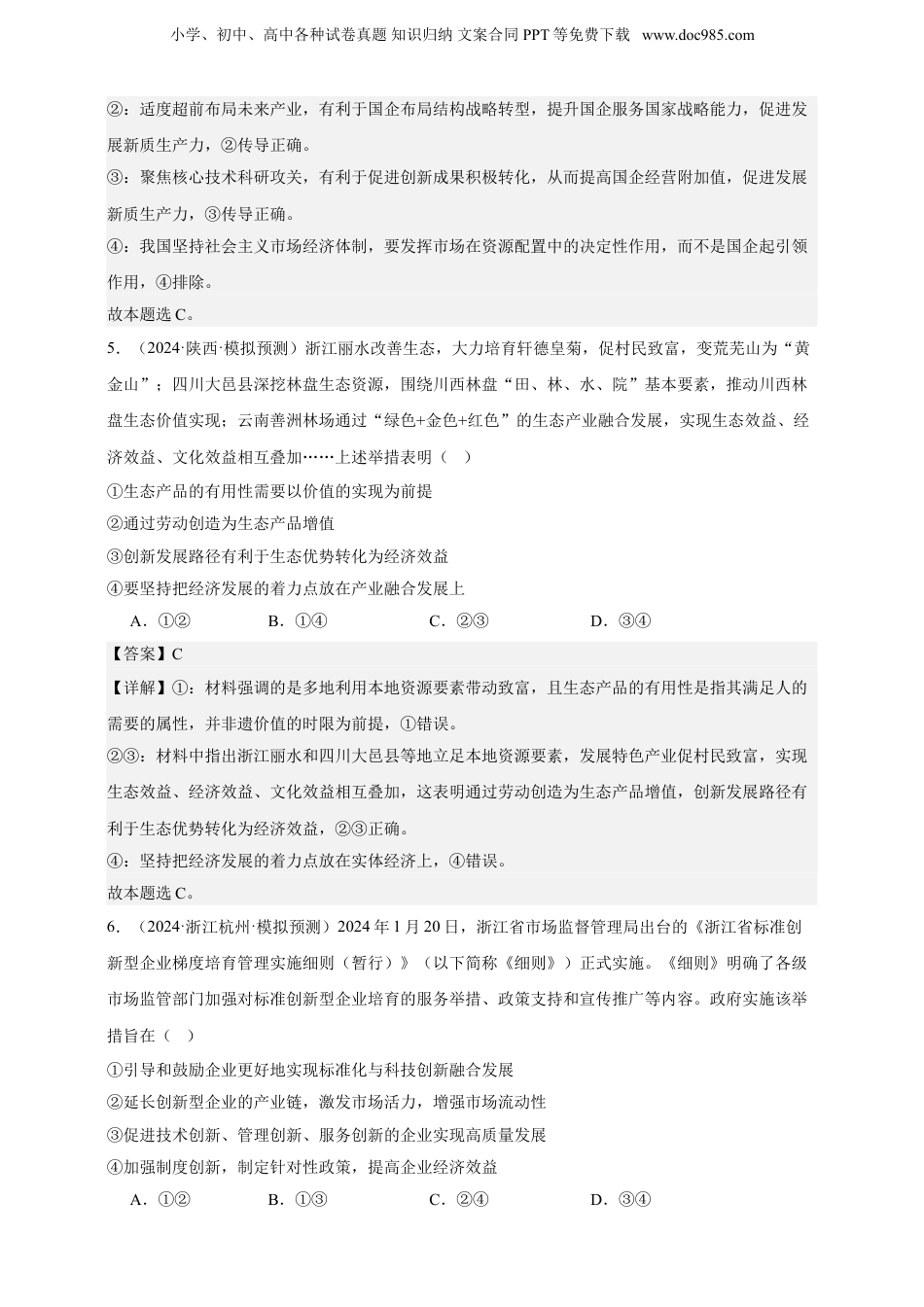 小学、初中、高中各种试卷真题知识归纳文案合同PPT等免费下载www.doc985.com第三课我国的经济发展时间:45分钟满分:100分一、选择题:本题共20小题,每小题3分,共60分。每小题只有一个选项符合题目要求。1.(2024·辽宁·模拟预测)某动力公司是大功率中高速船用柴油机专业化制造企业。近年来,该公司和大学合作共同研究出国际领先水平的甲醇发动机技术,能够替代原油和煤,降低大量的碳排放,推动了行业的进步与发展。这说明,该公司()①提高创新能力,缩短产品生产周期②坚持绿色发展理念,优化能源结构③提高产品质量,扩大市场占有率④依托科技创新,推动新旧动能转换A.①③B.①④C.②③D.②④【答案】D【详解】①:材料未涉及缩短产品生产周期,①排除。②:根据“替代原油和煤,降低大量的碳排放”等信息,体现了坚持绿色发展理念,优化能源结构,②正确。③:材料未涉及扩大市场占有率,③排除。④:研究出甲醇发动机技术以及发挥的作用等信息,体现了依托科技创新,推动新旧动能转换,④正确。故本题选D。2.(2024·四川成都·模拟预测)2024年一季度的宏观数据“出炉”,总体上看,一季度GDP实际增长5.3%,但全国一般公共预算收入同比下降2.3%;居民人均可支配收入同比增长6.2%,但个人所得税同比下降4.5%,这表明()①积极的财政政策加力提效,稳增长促民生②合理的分配政策要兼顾国家企业个人利益③因降低个人所得税从而实现居民收入增长④发挥有为政府作用,加强经济的直接干预A.①②B.①③C.②④D.③④【答案】B【详解】①③:总体上看,一季度GDP实际增长5.3%,但全国一般公共预算收入同比下降2.3%;居民人均可支配收入同比增长6.2%,但个人所得税同比下降4.5%,这表明积极的财政政策加力提效,稳增长促民生,因降低个人所得税从而实现居民收入增长,①③符合题意。②:材料不体现合理的分配政策要兼顾国家企业个人利益,②与题意不符。④:发挥有为政府作用,要加强对经济运行的宏观调控而非直接干预,④错误。故本题选B。小学、初中、高中各种试卷真题知识归纳文案合同PPT等免费下载www.doc985.com3.(2024·四川广安·一模)环境库兹涅茨曲线被称为倒U型曲线,揭示了环境污染水平与经济发展水平之间存在倒U型关系(如图)。近年来,我国持续推进美丽中国建设,不断加强生态治理,有望迎来环境库兹涅茨曲线拐点。这说明()①我国的经济发展水平与环境质量始终成反比关系②必须加大中西部协调发展以增强经济发展均衡性③应该转变发展方式,推动经济结构不断优化升级④碳中和碳达峰政策实施有利于缩短A点到B点的进程A.①②B.①④C.②③D.③④【答案】D【详解】①:由图表内容可知,在进入工业化初期,环境污染呈上升趋势,当人均GDP达到一定程度后,环境污染逐渐趋缓,即环境质量随着经济发展呈现先恶化后改善的趋势,并不是始终成反比关系,①错误。②:材料强调坚持绿色发展理念,加强生态治理,并没有涉及中西部协调发展,②不符合题意。③④:改善生态环境,应该转变发展方式,推动经济结构不断优化升级,实现可持续发展,而碳中和碳达峰政策实施能助力A点到B点的跨越,减缓环境恶化,③④正确。故本题选D。4.(2024·重庆·模拟预测)按照“四新”即新赛道、新技术、新平台、新机制标准,国务院国资委围绕加快培育创新型国有企业,启动实施启航企业培育工程,加快打造未来“独角兽”企业和科技领军企业,积极培育新质生产力。对于实施该工程发挥作用的路径,正确的是()①加快发展战略新兴产业→催生新业态新模式→提高国企市场地位②适度超前布局未来产业→国企布局结构战略转型→提升国企服务国家战略能力③聚焦核心技术科研攻关→促进创新成果积极转化→提高国企经营附加值④建设战略新兴产业集群→培养新质生产力主阵地→发挥国企引领资源配置的作用A.①③B.①④C.②③D.②④【答案】C【详解】①:该选项最后一个传导支有误,各种所有制企业在市场竞争中的地位是平等的,①排除。小学、初中、高中各种试卷真题知识归纳文案合同PPT等免费下载www.doc985.com②:适度超前布局未来产业,有利于国企布局结构战略转型,提升国企服务国...