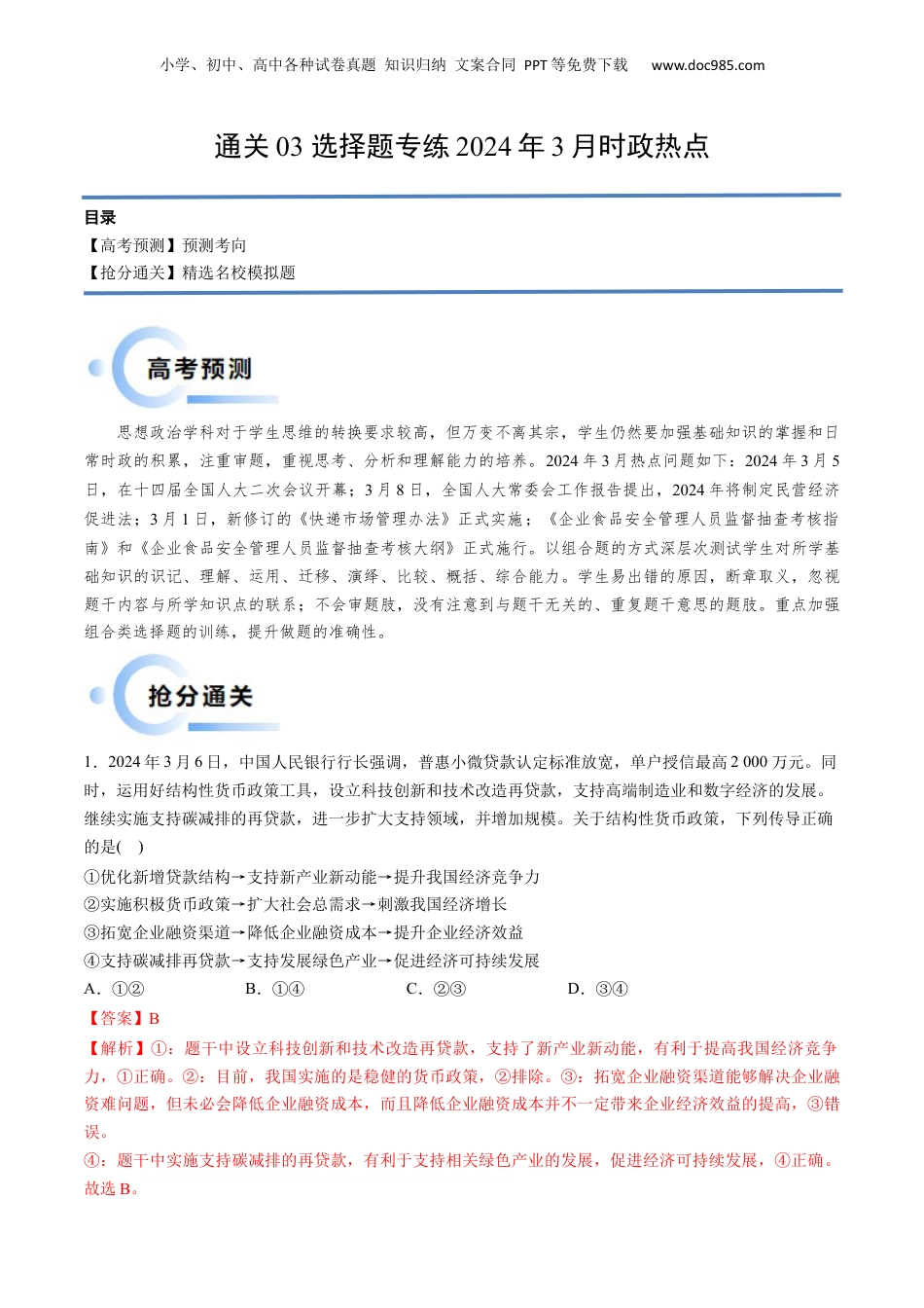 小学、初中、高中各种试卷真题知识归纳文案合同PPT等免费下载www.doc985.com通关03选择题专练2024年3月时政热点目录【高考预测】预测考向【抢分通关】精选名校模拟题思想政治学科对于学生思维的转换要求较高,但万变不离其宗,学生仍然要加强基础知识的掌握和日常时政的积累,注重审题,重视思考、分析和理解能力的培养。2024年3月热点问题如下:2024年3月5日,在十四届全国人大二次会议开幕;3月8日,全国人大常委会工作报告提出,2024年将制定民营经济促进法;3月1日,新修订的《快递市场管理办法》正式实施;《企业食品安全管理人员监督抽查考核指南》和《企业食品安全管理人员监督抽查考核大纲》正式施行。以组合题的方式深层次测试学生对所学基础知识的识记、理解、运用、迁移、演绎、比较、概括、综合能力。学生易出错的原因,断章取义,忽视题干内容与所学知识点的联系;不会审题肢,没有注意到与题干无关的、重复题干意思的题肢。重点加强组合类选择题的训练,提升做题的准确性。1.2024年3月6日,中国人民银行行长强调,普惠小微贷款认定标准放宽,单户授信最高2000万元。同时,运用好结构性货币政策工具,设立科技创新和技术改造再贷款,支持高端制造业和数字经济的发展。继续实施支持碳减排的再贷款,进一步扩大支持领域,并增加规模。关于结构性货币政策,下列传导正确的是()①优化新增贷款结构→支持新产业新动能→提升我国经济竞争力②实施积极货币政策→扩大社会总需求→刺激我国经济增长③拓宽企业融资渠道→降低企业融资成本→提升企业经济效益④支持碳减排再贷款→支持发展绿色产业→促进经济可持续发展A.①②B.①④C.②③D.③④【答案】B【解析】①:题干中设立科技创新和技术改造再贷款,支持了新产业新动能,有利于提高我国经济竞争力,①正确。②:目前,我国实施的是稳健的货币政策,②排除。③:拓宽企业融资渠道能够解决企业融资难问题,但未必会降低企业融资成本,而且降低企业融资成本并不一定带来企业经济效益的提高,③错误。④:题干中实施支持碳减排的再贷款,有利于支持相关绿色产业的发展,促进经济可持续发展,④正确。故选B。小学、初中、高中各种试卷真题知识归纳文案合同PPT等免费下载www.doc985.com2.2024年3月6日,十四届全国人大二次会议举行经济主题记者会。我国商务部部长在会上表示,2024年的外贸形势仍十分严峻。国际货币基金组织报告显示,2023年全球实施了约3000项贸易限制措施,远高于2019年的1100项。世界贸易组织预测2024年全球货物贸易量增速在3.3%,远低于往年历史平均值4.9%。在这一背景下,我国应当()①依托国家市场优势,推动全球开放体制的形成②打造市场化、法治化、国际化的营商环境③积极参与全球经济治理和贸易规则的制定④维护多边贸易体制,反对贸易保护主义A.①②B.①③C.②④D.③④【答案】D【解析】③:面对全球贸易限制措施增加以及全球货物贸易量增速下降,启示我们要积极参与全球经济治理和贸易规则的制定才能更好促进世界贸易的发展,③符合题意。④:在2024年外贸形势严峻的背景下,我国应当积极参与全球经济治理和贸易规则的制定,维护多边贸易体制,反对贸易保护主义,④符合题意。①:我国以高水平开放推动建设开放型世界经济,既巩固已有开放成果,又扎实推动制度型开放,加快形成我国更高水平开放型经济新体制,“推动全球开放体制的形成”说法不准确,①说法错误。②:打造营商环境是从我国国内经济角度思考的,②不符合题意。故本题选D。3.2024年3月13日,澳门特别行政区行政长官在澳门2024年全国两会精神传达会上表示,要结合澳门实际,发挥澳门所长,学习贯彻落实好两会精神,凝心聚力,以实际行动贯彻执行好中央的决策部署,更大作为做好特区各项工作,在团结奋斗中不断实现广大居民对美好生活的向往。澳门特别行政区要保持长期繁荣稳定的良好发展态势,必须()①发挥制度优势,坚守“一国两制”的国家结构形式②守住安全底线,坚决防范和遏制外部势力干预澳门事务③发挥独特优势,在融入国家发展大局中实现更好发展④服从中央统一领导,处理好中央和民族自治地方的关系A.①②B.①④C...