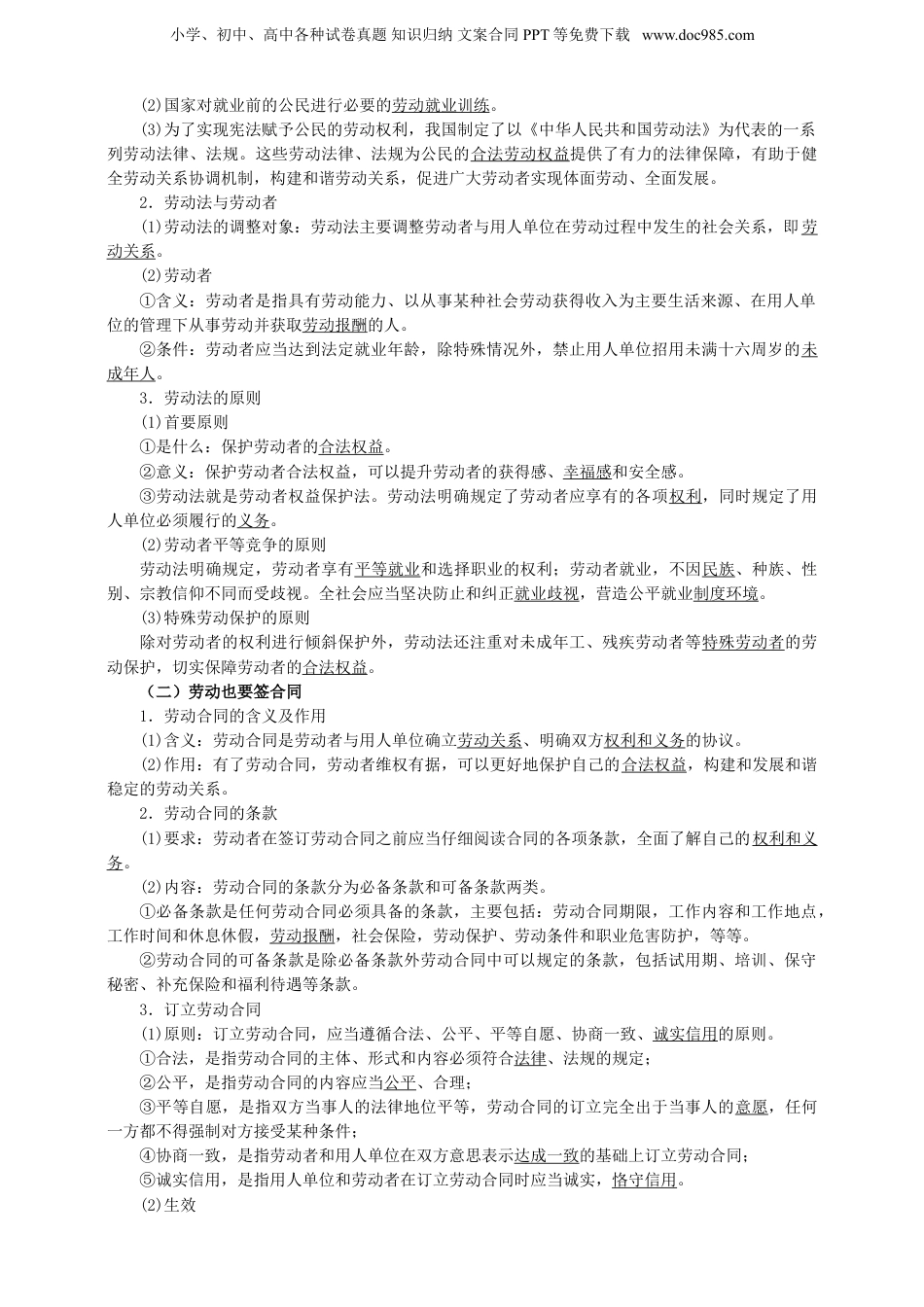 小学、初中、高中各种试卷真题知识归纳文案合同PPT等免费下载www.doc985.com2025年高考政治一轮复习精讲精练第七课做个明白的劳动者【课标要求】了解劳动法的基本原则,理解劳动者的权利和义务,解释劳动合同的主要内容,熟悉劳动者依法维权的途径和方式。【核心素养】政治认同:认同宪法及法律对劳动者权利义务的规定。认同我国尊重劳动,重视依法维护劳动者的合法权利。科学精神:科学理解劳动合同的主要内容,认识劳动合同的意义。法治意识:培养自我保护意识,树立规则意识和法律观念;按劳动法办事。增强依法维权意识。公共参与:掌握签订劳动合同的基本要素。学会用法律维护自己的合法权益。把握劳动者依法享有的权利和应承担的主要义务。【命题预测】1.高频考点:劳动关系;劳动法基本原则;劳动合同;劳动者的权利和义务;劳动维权途径。2.题型预判:选择题和非选择题均会考查。结合现实生活中真实情境,剖析侵犯劳动者合法权益的现象,辨别几种维权方式的特点,熟悉劳动者依法维权的途径和方式。【思维导图】【考点梳理】(一)法律守护劳动者1.法律对劳动者权利与义务的保障(1)宪法规定,公民有劳动的权利和义务。国家通过各种途径,创造劳动就业条件,加强劳动保护,改善劳动条件,并在发展生产的基础上,提高劳动报酬和福利待遇。小学、初中、高中各种试卷真题知识归纳文案合同PPT等免费下载www.doc985.com(2)国家对就业前的公民进行必要的劳动就业训练。(3)为了实现宪法赋予公民的劳动权利,我国制定了以《中华人民共和国劳动法》为代表的一系列劳动法律、法规。这些劳动法律、法规为公民的合法劳动权益提供了有力的法律保障,有助于健全劳动关系协调机制,构建和谐劳动关系,促进广大劳动者实现体面劳动、全面发展。2.劳动法与劳动者(1)劳动法的调整对象:劳动法主要调整劳动者与用人单位在劳动过程中发生的社会关系,即劳动关系。(2)劳动者①含义:劳动者是指具有劳动能力、以从事某种社会劳动获得收入为主要生活来源、在用人单位的管理下从事劳动并获取劳动报酬的人。②条件:劳动者应当达到法定就业年龄,除特殊情况外,禁止用人单位招用未满十六周岁的未成年人。3.劳动法的原则(1)首要原则①是什么:保护劳动者的合法权益。②意义:保护劳动者合法权益,可以提升劳动者的获得感、幸福感和安全感。③劳动法就是劳动者权益保护法。劳动法明确规定了劳动者应享有的各项权利,同时规定了用人单位必须履行的义务。(2)劳动者平等竞争的原则劳动法明确规定,劳动者享有平等就业和选择职业的权利;劳动者就业,不因民族、种族、性别、宗教信仰不同而受歧视。全社会应当坚决防止和纠正就业歧视,营造公平就业制度环境。(3)特殊劳动保护的原则除对劳动者的权利进行倾斜保护外,劳动法还注重对未成年工、残疾劳动者等特殊劳动者的劳动保护,切实保障劳动者的合法权益。(二)劳动也要签合同1.劳动合同的含义及作用(1)含义:劳动合同是劳动者与用人单位确立劳动关系、明确双方权利和义务的协议。(2)作用:有了劳动合同,劳动者维权有据,可以更好地保护自己的合法权益,构建和发展和谐稳定的劳动关系。2.劳动合同的条款(1)要求:劳动者在签订劳动合同之前应当仔细阅读合同的各项条款,全面了解自己的权利和义务。(2)内容:劳动合同的条款分为必备条款和可备条款两类。①必备条款是任何劳动合同必须具备的条款,主要包括:劳动合同期限,工作内容和工作地点,工作时间和休息休假,劳动报酬,社会保险,劳动保护、劳动条件和职业危害防护,等等。②劳动合同的可备条款是除必备条款外劳动合同中可以规定的条款,包括试用期、培训、保守秘密、补充保险和福利待遇等条款。3.订立劳动合同(1)原则:订立劳动合同,应当遵循合法、公平、平等自愿、协商一致、诚实信用的原则。①合法,是指劳动合同的主体、形式和内容必须符合法律、法规的规定;②公平,是指劳动合同的内容应当公平、合理;③平等自愿,是指双方当事人的法律地位平等,劳动合同的订立完全出于当事人的意愿,任何一方都不得强制对方接受某种条件;④协商一致,是指劳动者和用人单位在双方意思表示达成一致的基础...
