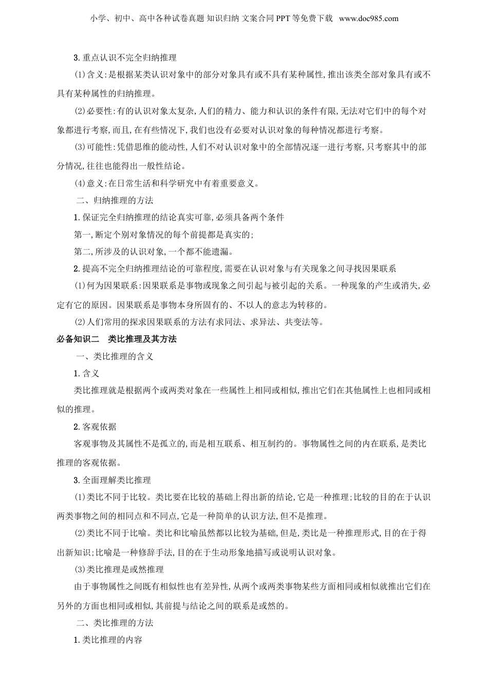 小学、初中、高中各种试卷真题知识归纳文案合同PPT等免费下载www.doc985.com2025年高考政治一轮复习精讲精练第七课学会归纳与类比推理【课标要求】学会归纳推理、类比推理;评析常见的推理错误。【核心素养】科学精神:领会归纳推理的逻辑要义,掌握因果联系的普遍性、客观性和探究因果联系的方法,树立科学精神。公共参与:运用实际事例比较完全归纳推理和不完全归纳推理,分析因果联系的思维材料,养成观察生活、善于思维的习惯。【命题预测】1.高频考点:类比推理、归纳推理、探求因果。2.题型预判:选择题和非选择题均会考查。命题常常结合生活经常遇到的问题来进行考查。【思维导图】【考点梳理】必备知识一归纳推理及其方法一、归纳推理的含义1.定义以个别性或特殊性知识为前提,推出一般性的结论的推理形式叫作归纳推理。2.分类(1)不完全归纳推理:①前提只涉及认识的部分对象。②这种推理的前提与结论之间不具有保真关系,属于逻辑推理分类中的或然推理。(2)完全归纳推理:①前提遍及认识的全部对象。②这种推理的前提与结论之间具有保真关系,它不属于逻辑推理分类中的或然推理。小学、初中、高中各种试卷真题知识归纳文案合同PPT等免费下载www.doc985.com3.重点认识不完全归纳推理(1)含义:是根据某类认识对象中的部分对象具有或不具有某种属性,推出该类全部对象具有或不具有某种属性的归纳推理。(2)必要性:有的认识对象太复杂,人们的精力、能力和认识的条件有限,无法对它们中的每个对象都进行考察,而且,在有些情况下,我们也没有必要对认识对象的每种情况都进行考察。(3)可能性:凭借思维的能动性,人们不对认识对象中的全部情况逐一进行考察,只考察其中的部分情况,往往也能得出一般性结论。(4)意义:在日常生活和科学研究中有着重要意义。二、归纳推理的方法1.保证完全归纳推理的结论真实可靠,必须具备两个条件第一,断定个别对象情况的每个前提都是真实的;第二,所涉及的认识对象,一个都不能遗漏。2.提高不完全归纳推理结论的可靠程度,需要在认识对象与有关现象之间寻找因果联系(1)何为因果联系:因果联系是事物或现象之间引起与被引起的关系。一种现象的产生或消失,必定有它的原因。因果联系是事物本身所固有的、不以人的意志为转移的。(2)人们常用的探求因果联系的方法有求同法、求异法、共变法等。必备知识二类比推理及其方法一、类比推理的含义1.含义类比推理就是根据两个或两类对象在一些属性上相同或相似,推出它们在其他属性上也相同或相似的推理。2.客观依据客观事物及其属性不是孤立的,而是相互联系、相互制约的。事物属性之间的内在联系,是类比推理的客观依据。3.全面理解类比推理(1)类比不同于比较。类比要在比较的基础上得出新的结论,它是一种推理;比较的目的在于认识两类事物之间的相同点和不同点,它是一种简单的认识方法,但不是推理。(2)类比不同于比喻。类比和比喻虽然都以比较为基础,但是,类比是一种推理形式,目的在于得出新知识;比喻是一种修辞手法,目的在于生动形象地描写或说明认识对象。(3)类比推理是或然推理由于事物属性之间既有相似性也有差异性,从两个或两类事物某些方面相同或相似就推出它们在另外的方面也相同或相似,其前提与结论之间的联系是或然的。二、类比推理的方法1.类比推理的内容小学、初中、高中各种试卷真题知识归纳文案合同PPT等免费下载www.doc985.com类比推理是依据事物之间相同或相似的属性进行的推理,事物的要素、结构和功能是其属性的主要内容。从思维的角度说,类比推理既可以在对象的要素和结构之间进行类比,也可以在对象的功能之间进行类比,还可以从导致事物某种功能的条件方面进行类比。2.如何提高类比推理的可靠程度第一,类比的根据越多越好。前提中确认对象的相同或相似属性越多,意味着它们所属的类别可能越相近,结论的可靠性越高。第二,作为类比推理根据的相同属性越是接近本质属性,相同属性与推出属性之间的相关程度越高,结论的可靠程度就越高。第三,前提中确认的属性不应该有与结论相互排斥的属性。一旦前提中出现与结论相互排斥的属性,就不能推出结论。3.类比推理的作用(1)类比推理在科学技术创新中具有前锋的作用。(2)在日常论...
