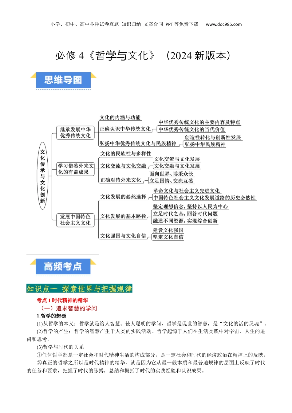 小学、初中、高中各种试卷真题知识归纳文案合同PPT等免费下载www.doc985.com必修4《哲文化》(学与2024新版本)知识点一探索世界与把握规律考点1时代精神的精华(一)追求智慧的学问1.哲学的起源(1)从哲学的本义:哲学就是给人智慧、使人聪明的学问,哲学是现世的智慧,是“文化的活的灵魂”。(2)哲学的产生:哲学的智慧产生于人类的实践活动。哲学起源于人们在生活实践中对宇宙、人生的追问和思考。(3)哲学与时代的关系①任何哲学都是一定社会和时代精神生活的构成部分,是一定社会和时代的经济政治在精神上的反映。②真正的哲学之所以是时代精神的精华,就是因为它从最一般本质和最普遍规律的层面上反映了时代的任务和要求,把握了时代的脉搏,总结和概括了时代的实践经验和认识成果。小学、初中、高中各种试卷真题知识归纳文案合同PPT等免费下载www.doc985.com(4)哲学的作用:哲学总是直接或间接地影响着我们的学习、工作和生活。2.哲学是系统化理论化的世界观(1)世界观与哲学比较世界观哲学含义世界观是人们对整个世界的总的看法和根本观点哲学是关于世界观的学问,是系统化理论化的世界观特点自发形成的、零散的自觉的、系统化、理论化主体人人都有不是人人都有(2)世界观与方法论①一般说来,世界观决定方法论,方法论体现世界观,有什么样的世界观就有什么样的方法论。②哲学是世界观与方法论的统一。(3)哲学是对自然、社会和思维知识的概括和总结。①具体科学与哲学的区别:具体科学揭示的是自然、社会和思维某一具体领域的特殊规律;哲学是对具体科学知识进行概括和升华,从中抽象出最一般的本质和最普遍的规律。②具体科学与哲学的联系:具体科学的进步推动哲学的发展;哲学为具体科学研究提供世界观和方法论的指导。(二)哲学的基本问题1.什么是哲学的基本问题(1)哲学的基本问题:是思维与存在的关系问题,也就是意识和物质的关系问题。(2)它包括两方面的内容:一是思维与存在何者是本原的问题。对这个问题的不同回答,是划分唯物主义和唯心主义的唯一标准。二是思维和存在有没有同一性问题,即思维能否正确认识存在的问题。对这个问题的不同回答形成了哲学上的可知论与不可知论。2.为什么思维和存在的关系问题是哲学的基本问题(1)思维和存在的关系问题,首先是人们在生活和实践活动中遇到的和无法回避的基本问题。(2)思维和存在的关系问题,是一切哲学都不能回避的、必须回答的问题。对这一问题的不同回答决定着各种哲学的基本性质和方向,决定着它们对其他哲学问题的回答。3.唯物主义和唯心主义(1)两者分歧:围绕物质和意识谁是本原的问题展开的。(2)根本观点:唯物主义认为,物质是本原的,意识是派生的,物质决定意识;唯心主义认为,意识是本原的,物质依赖于意识,意识决定物质。(3)基本形态:①唯物主义三种基本形态:古代朴素唯物主义,近代形而上学唯物主义,辩证唯物主义和历史唯物主义比较古代朴素唯物主义近代形而上学唯物主义辩证唯物主义和历史唯物主义基本观点把世界的本原归结为某一种或某几种具体的物质形态把物质归结为自然科学意义上的原子物质决定意识,意识具有能动作用代表观点①五行说:生成万物的基本元素是金、木、水、火、土②荀子:天地合而万物生,阴阳接而变化起③范缜:形存则神存,形谢则神灭④王夫之:气者,理之依也①霍尔巴赫:原子是世界的本原②狄德罗:自然界由数目无穷、性质不同的异质元素构成③培根:万物的基础是原始物质,是基本元素①世界的本原是物质,物质决定意识,意识对物质具有反作用②社会存在决定社会意识,社会意识对社会存在具有反作用合理性坚持了唯物主义的根本方向,本质上是正确的以自然科学为基础,丰富和发展了唯物主义是科学的世界观和方法论,是无产阶级的思想武器局限性缺少科学依据;把复杂的问题简单化机械性、形而上学性、历史观上的唯心主义共同性在根本观点上是一致的,都承认世界的本原是物质,物质第一性,意识第二性,物质决定意小学、初中、高中各种试卷真题知识归纳文案合同PPT等免费下载www.doc985.com识②唯心主义的两种基本形态:主观唯心主义,客观唯心主义基本形态主观唯心主义客观唯心...