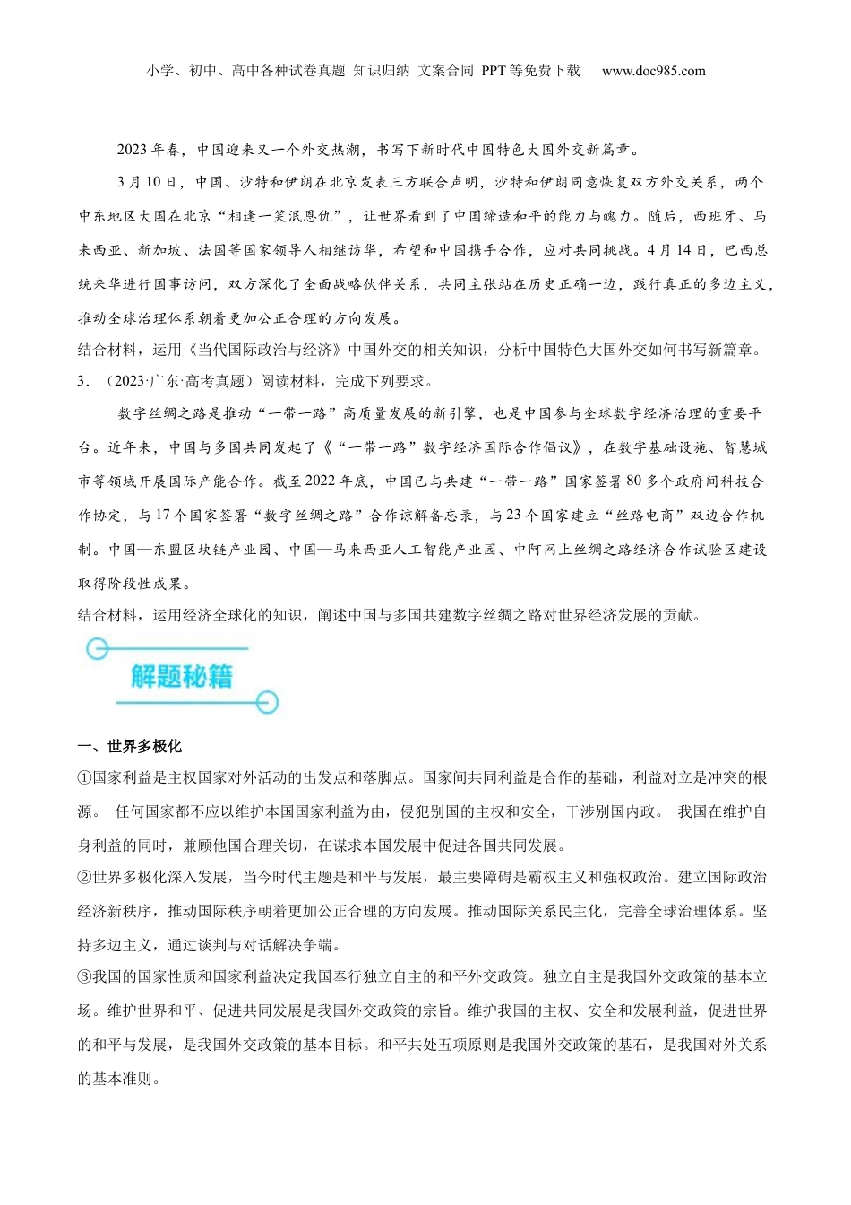 小学、初中、高中各种试卷真题知识归纳文案合同PPT等免费下载www.doc985.com押新高考卷17-26题当代国际政治与经济核心考点考情统计考向预测备考策略第19题(2):提高开放型经济发展水平北京卷本模块主观题主要集中在世界多极化和经济全球化部分,考查国际组织内容时也会与世界多极化和经济全球化综合考查。本模块易与经济新发展理念和新发展格局部分综合考查重点关注“新三样”、新质生产力、一带一路10周年、改革开放45周年、链博会等时政热点第18题:世界多极化与经济全球化天津卷第26题:中国特色大国外交海南卷第17题:世界多极化与经济全球化江苏卷第17题:提高开放型经济发展水平河北卷第18题:中国是经济全球化的贡献者广东卷第17题(1):提高开放型经济发展水平湖南卷第19题:世界多极化湖北卷第18题(3):世界多极化与经济全球化福建卷1.(2023·天津·高考真题)阅读材料,回答回题新时代以来,习近平主席围绕全球安全和发展等问题提出一系列重大倡议和主张,其核心理念是构建人类命运共同体。中国主张:全球治理要守法,要坚定维护以国际法为基础的国际秩序;要积极维护开放型世界经济体制;世界命运应该由各国共同掌握,国际规则应该由各国共同书写,全球事务应该由各国共同治理,发展成果应该由各国共享。依据材料,运用《当代国际政治与经济》知识,说明中国主张的合理性。2.(2023·海南·高考真题)阅读材料,完成下列问题。小学、初中、高中各种试卷真题知识归纳文案合同PPT等免费下载www.doc985.com2023年春,中国迎来又一个外交热潮,书写下新时代中国特色大国外交新篇章。3月10日,中国、沙特和伊朗在北京发表三方联合声明,沙特和伊朗同意恢复双方外交关系,两个中东地区大国在北京“相逢一笑泯恩仇”,让世界看到了中国缔造和平的能力与魄力。随后,西班牙、马来西亚、新加坡、法国等国家领导人相继访华,希望和中国携手合作,应对共同挑战。4月14日,巴西总统来华进行国事访问,双方深化了全面战略伙伴关系,共同主张站在历史正确一边,践行真正的多边主义,推动全球治理体系朝着更加公正合理的方向发展。结合材料,运用《当代国际政治与经济》中国外交的相关知识,分析中国特色大国外交如何书写新篇章。3.(2023·广东·高考真题)阅读材料,完成下列要求。数字丝绸之路是推动“一带一路”高质量发展的新引擎,也是中国参与全球数字经济治理的重要平台。近年来,中国与多国共同发起了《“一带一路”数字经济国际合作倡议》,在数字基础设施、智慧城市等领域开展国际产能合作。截至2022年底,中国已与共建“一带一路”国家签署80多个政府间科技合作协定,与17个国家签署“数字丝绸之路”合作谅解备忘录,与23个国家建立“丝路电商”双边合作机制。中国—东盟区块链产业园、中国—马来西亚人工智能产业园、中阿网上丝绸之路经济合作试验区建设取得阶段性成果。结合材料,运用经济全球化的知识,阐述中国与多国共建数字丝绸之路对世界经济发展的贡献。一、世界多极化①国家利益是主权国家对外活动的出发点和落脚点。国家间共同利益是合作的基础,利益对立是冲突的根源。任何国家都不应以维护本国国家利益为由,侵犯别国的主权和安全,干涉别国内政。我国在维护自身利益的同时,兼顾他国合理关切,在谋求本国发展中促进各国共同发展。②世界多极化深入发展,当今时代主题是和平与发展,最主要障碍是霸权主义和强权政治。建立国际政治经济新秩序,推动国际秩序朝着更加公正合理的方向发展。推动国际关系民主化,完善全球治理体系。坚持多边主义,通过谈判与对话解决争端。③我国的国家性质和国家利益决定我国奉行独立自主的和平外交政策。独立自主是我国外交政策的基本立场。维护世界和平、促进共同发展是我国外交政策的宗旨。维护我国的主权、安全和发展利益,促进世界的和平与发展,是我国外交政策的基本目标。和平共处五项原则是我国外交政策的基石,是我国对外关系的基本准则。小学、初中、高中各种试卷真题知识归纳文案合同PPT等免费下载www.doc985.com④中国是维护世界和平与稳定的积极因素和坚定力量,是促进世界经济发展的重要力量。中国发挥着建...