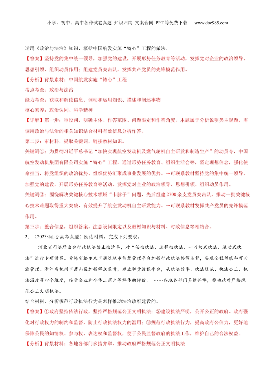 小学、初中、高中各种试卷真题知识归纳文案合同PPT等免费下载www.doc985.com押新高考卷16-25题政治与法治核心考点考情统计考向预测备考策略第18题(1):人民代表大会北京卷本模块去年主观题知识点主要集中在中国共产党、人大制度及法治政府部分,主要以小切口为主。今年中国共产党依然是考查的重点,要注意人民当家作主、依法治国综合知识的考查重点关注“枫桥经验”60周年时政热点,该热点与中国共产党、基层群众自治、依法治国有关,会进行综合考查;关注大兴调查研究,该热点与中国共产党联系紧密第16题:中国共产党天津卷第16题:法治政府山东卷第25题(2):中国共产党海南卷第18题:人大常委会、科学立法江苏卷第18题:法治政府河北卷第19题:人大代表如何履职广东卷第18题:人民代表大会制度湖南卷第18题:中国共产党湖北卷第17题:中国共产党辽宁卷1.(2023·天津·高考真题)阅读材料,回答问题航空发动机被喻为现代工业“皇冠上的明珠”,是大国重器。为贯彻习近平总书记“加快实现航空发动机及燃气轮机自主研发和制造生产”的动员令,中国航空发动机集团有限公司(简称“中国航发”)实施“铸心”工程,通过形势任务教育、组织生活会等,坚定理想信念,强化使命担当,将党组织的政治优势、组织优势汇聚成事业发展的优势;围绕解决关键核心技术领域“卡脖子”问题,先后组建2700余支党员突击队,推动一批关键核心技术难题取得重大突破,有效提升了航空发动机自主研发能力。小学、初中、高中各种试卷真题知识归纳文案合同PPT等免费下载www.doc985.com运用《政治与法治》知识,概括中国航发实施“铸心”工程的做法。【答案】坚持党的集中统一领导,加强党的建设,开展形势任务教育等活动,发挥党对企业的政治领导、思想引领、组织动员作用;组建党员突击队,发挥共产党员的先锋模范作用。【分析】背景素材:中国航发实施“铸心”工程考点考查:政治与法治能力考查:获取和解读信息、调动和运用知识、描述和阐述事物核心素养:政治认同、科学精神【详解】第一步:审设问,明确主体、作答范围、问题限定和作答角度。本题属于分析说明类主观题,需调用政治与法治的相关知识结合材料有效信息分析作答。第二步:审材料,提取关键词,链接教材知识。关键词①:为贯彻习近平总书记“加快实现航空发动机及燃气轮机自主研发和制造生产”的动员令,中国航空发动机集团有限公司实施“铸心”工程,通过形势任务教育、组织生活会等,坚定理想信念,强化使命担当,将党组织的政治优势、组织优势汇聚成事业发展的优势。→可联系教材坚持党的集中统一领导,加强党的建设,开展形势任务教育等活动,发挥党对企业的政治领导、思想引领、组织动员作用。关键词②:围绕解决关键核心技术领域“卡脖子”问题,先后组建2700余支党员突击队,推动一批关键核心技术难题取得重大突破,有效提升了航空发动机自主研发能力。→可联系教材发挥共产党员的先锋模范作用。第三步:整合信息,组织答案。注意设问限定以及教材知识与材料、时政信息等相结合。2.(2023·河北·高考真题)阅读材料,完成下列要求。河北省司法厅出台行政执法禁止性清单,对“任性执法、选择性执法、一刀切式执法、运动式执法”进行专项督察。青海省格尔木市通过城市智慧管理平台加强行政执法协调监督,实现全程留痕和可回溯管理。浙江省杭州市萧山区加强群众监督,建立职责透视平台,从执法效率、执法规范、执法公正、执法温度等四个维度,接受企业和个体工商户等群体的评价。……各地各部门多措并举,推动政府严格规范公正文明执法。结合材料,分析规范行政执法行为是怎样推动法治政府建设的。【答案】①政府坚持依法行政,坚持严格规范公正文明执法;②建设执法严明,公开公正的政府。政府强化对行政权力的制约和监督,防止行政执法权力的滥用;③规范行政执法行为,提高政府公信力,更好地保障公民的知情权、参与权、表达权和监督权,便于公民监督政府的执法工作,维护自己的合法权益。【分析】背景材料:各地各部门多措并举,推动政府严格规范公正文明执法小学、初中、高中各种试卷真题知识归纳文案合同PPT等免费下载www.do...