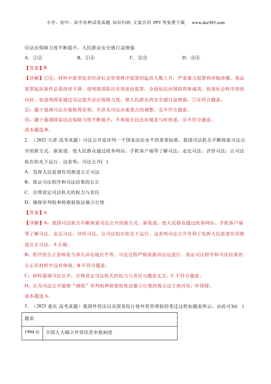小学、初中、高中各种试卷真题知识归纳文案合同PPT等免费下载www.doc985.com押新高考卷4-10题全面依法治国核心考点考情统计考向预测备考策略第4题:法治国家、法治社会福建卷本模块选择题主要集中在法治政府和依法治国的基本要求部分,也会与党领导立法、人大行使立法权等知识综合命题重点关注各地各部门多措并举,推动政府严格规范公正文明执法、鼓励地方创造性立法、法院有关正当防卫的判决所体现的司法公正、新一轮国家机构改革、国务院组织法的通过等第4题:公正司法天津卷第7题:科学立法重庆卷第10题:法治政府、严格执法第7题:法治政府、严格执法海南卷第9题:公正司法广东卷第6题:科学立法、严格执法、公正司法山东卷第8题:法治政府湖北卷第9题:科学立法1.(2023·福建·高考真题)在2023年最高人民检察院向全国人大提交的工作报告中,多组数据呈现“一升一降”的特点引人注目。例如,帮助信息网络犯罪活动罪等新型危害经济社会管理秩序犯罪的起诉人数上升;抢劫、故意杀人等严重暴力犯罪和涉枪涉爆、毒品犯罪起诉案件总量持续下降。“一升一降”说明()①依法治国取得新成效,社会秩序持续向好②司法办案重点适时调整,犯罪活动得到有效遏制③全民法治观念与时俱进,社会法治化水平稳步提高小学、初中、高中各种试卷真题知识归纳文案合同PPT等免费下载www.doc985.com④法治保障力度不断提升,人民群众安全感日益增强A.①②B.①④C.②③D.③④【答案】B【详解】①④:材料中新型危害经济社会管理秩序犯罪的起诉人数上升,严重暴力犯罪和涉枪涉爆、毒品犯罪起诉案件总量持续下降,说明我国依法有效惩治犯罪,全面依法治国取得新成效,促使社会秩序持续向好,也说明国家通过司法提升法治保障力度,使人民群众的安全感日益增强,①④符合题意。②:题干强调司法办案取得实效,不涉及司法办案重点的调整,②不符合题意。③:题干强调国家法治保障力度不断提升,不体现全民法治观念与时俱进,③不符合题意。故本题选B。2.(2023·天津·高考真题)司法公开是评判一个国家法治水平的重要标准。我国司法机关不断探索司法公开的新方式、新渠道,使人民群众通过政务网站、手机客户端等了解司法、走近司法、评价司法,让司法权在阳光下运行。这表明,司法公开()A.发挥人民监督作用推进公正司法B.保证司法程序和司法结果的公正C.合理设定司法机关的权力与责任D.确保审判权和检察权依法独立行使【答案】A【详解】A:我国司法机关不断探索司法公开的新方式、新渠道,使人民群众通过政务网站、手机客户端等了解司法、走近司法、评价司法,让司法权在阳光下运行。这表明司法公开有利于发挥人民监督作用推进公正司法,A正确。B:程序的公正意味着当事人诉讼地位平等、司法过程严格依据诉讼法进行。保证司法程序和司法结果的公正在材料中没有体现,B不符合题意。C:材料强调司法公开,合理设定司法机关的权力与责任与题意无关,C不符合题意。D:认为司法公开能够“确保”审判权和检察权依法独立行使的观点过于绝对化,D排除。故本题选A。3.(2023·重庆·高考真题)我国外贸法以及国务院行使外贸管理权的变迁过程如题表所示,由此可知()题表1994年全国人大确立外贸经营审批制度小学、初中、高中各种试卷真题知识归纳文案合同PPT等免费下载www.doc985.com2004年全国人大取消外贸经营审批制度,确立外贸经营备案登记制度2019年经全国人大授权,在自贸区试点外贸经营备案登记制度2022年全国人大,外贸经营备案登记制度①外贸立法与改革之间呈现出了良性互动②国务院在自贸区无权制定外贸行政法规③先行先试是外贸法制定修改的必备程序④国务院行使外贸管理权的方式逐步优化A.①③B.①④C.②③D.②④【答案】B【详解】①:根据外贸法以及国务院行使外贸管理权的变迁过程,可知外贸立法与改革之间呈现出了良性互动,①符合题意。②:图表中未涉及到国务院在自贸区无权制定外贸行政法规,②不合题意。③:图表中未涉及先行先试,③不合题意。④:根据外贸法以及国务院行使外贸管理权的变迁过程可知国务院行使外贸管理权的方式逐步优化,④符合题意。故本题选B。一、比较法治国...
