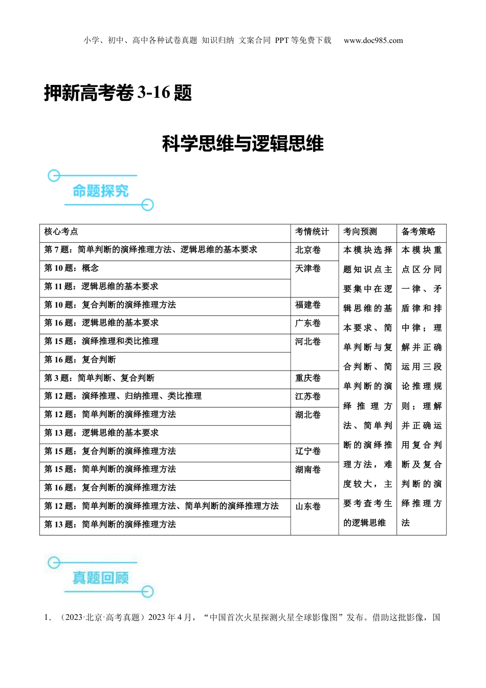 小学、初中、高中各种试卷真题知识归纳文案合同PPT等免费下载www.doc985.com押新高考卷3-16题科学思维与逻辑思维核心考点考情统计考向预测备考策略第7题:简单判断的演绎推理方法、逻辑思维的基本要求北京卷本模块选择题知识点主要集中在逻辑思维的基本要求、简单判断与复合判断、简单判断的演绎推理方法、简单判断的演绎推理方法,难度较大,主要考查考生的逻辑思维本模块重点区分同一律、矛盾律和排中律;理解并正确运用三段论推理规则;理解并正确运用复合判断及复合判断的演绎推理方法第10题:概念天津卷第11题:逻辑思维的基本要求第10题:复合判断的演绎推理方法福建卷第16题:逻辑思维的基本要求广东卷第15题:演绎推理和类比推理河北卷第16题:复合判断第3题:简单判断、复合判断重庆卷第12题:演绎推理、归纳推理、类比推理江苏卷第12题:简单判断的演绎推理方法湖北卷第13题:逻辑思维的基本要求第15题:复合判断的演绎推理方法辽宁卷第15题:简单判断的演绎推理方法湖南卷第16题:复合判断的演绎推理方法第12题:简单判断的演绎推理方法、简单判断的演绎推理方法山东卷第13题:简单判断的演绎推理方法1.(2023·北京·高考真题)2023年4月,“中国首次火星探测火星全球影像图”发布。借助这批影像,国小学、初中、高中各种试卷真题知识归纳文案合同PPT等免费下载www.doc985.com际天文联合会根据相关规则,以中国的历史文化名村名镇命名了火星上的22个地理实体,杨柳青、古田、周庄、漠河等中国地名“刻印”在火星大地,基于上述材料,下列三段论推理违反“同一律”要求的是()A.所有的文化名镇都在地球,有的杨柳青是文化名镇,所以,所有的杨柳青都在地球B.古田是历史名镇,古田是火星地理实体,所以有的火星地理实体是历史名镇C.有的周庄不是地球地名,有的火星地名不是周庄,所以有的火星地名是地球地名D.地球上的漠河是地名,火星上的漠河是地名,所以火星上的漠河是地球上的漠河2.(2023·辽宁·高考真题)雾凇俗称树挂,玉树琼花,宛若仙境。其形成条件严苛,需要独特的气象条件与自然要素。不同地区形成雾凇的条件存在一定差异,但湿度大、风力小、气温日较差大是形成雾凇的共同条件。以下选项一定为真的是()①湿度大、风力小、气温日较差大,所以雾凇产生了②雾凇产生了,所以湿度大、风力小、气温日较差大③湿度小或风力大或气温日较差小,所以雾凇没产生④雾凇没产生,所以并非湿度大、风力小、气温日较差大A.①②B.①④C.②③D.③④3.(2023·江苏·高考真题)春天的微风中飘散的不仅仅有花粉,一些植物病毒也可以借着花粉在花与花之间传播。某大学研究团队发现,在农业区采集的花朵携带着100多种不同病毒的基因组片段,而来自人类活动较少的草原上的花朵仅携带12种病毒。该团队认为,如果一块农田的植物物种趋于同质化,就可能使更多的病毒寄居在这里。得出这一结论是运用了()A.求同法B.求异法C.类比推理D.演绎推理一、逻辑思维的基本要求规律名称要求公式逻辑错误同一律思维的确定性要求,在同一思维过程中,每一思想必须保持自身同一性A是A偷换概念、偷换论题矛盾律思维的一致性要求,在同一时间、从同一方面、对同一对象所形成的论断“A”和“非A”,不能断定A不是非A自相矛盾小学、初中、高中各种试卷真题知识归纳文案合同PPT等免费下载www.doc985.com它们都成立。“A”和“非A”必有一假排中律思维的明确性要求,在同一时间、从同一方面、对同一对象所形成的论断“A”和“非A”,不能断定它们都不成立。“A”和“非A”必有一假A或者非A“两不可”二、概念的特征、明确概念的方法概念的基本特征概念的内涵概念的内涵指概念所反映的事物的本质属性,它反映事物“质”的规定性,说明概念所反映的那种事物究竟“是什么”概念的外延外延含义概念的外延是指具有概念所反映的本质属性的事物的范围。它说明概念所反映的那种事物“有多少”外延种类种类含义图示法举例相容关系全同关系两个概念的外延完全相同《史记》作者与司马迁种属或属种关系一个概念的外延包含着另一个概念的全部外延,外延大的概念为属概念,外延小的概念为种概念种属...