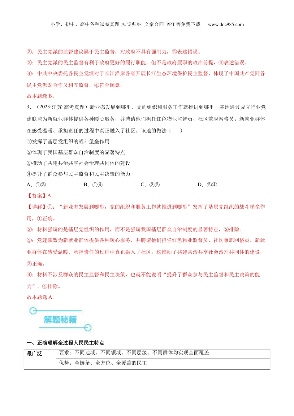 小学、初中、高中各种试卷真题知识归纳文案合同PPT等免费下载www.doc985.com押新高考卷3-8题人民当家作主核心考点考情统计考向预测备考策略第4题:人民政协福建卷本模块在高考选择题命题中,知识点主要集中在人大、政协及基层群众自治部分,国体、民族、宗教很少涉及。本模块政党制度和基层群众自治制度与中国共产党综合命制选择题较多,主要考查中国共产党与各民主党派的关系、基层党组织的内容重点背诵人大、政协、基层群众自治部分易混易错知识点;加强人民当家作主综合选择题练习,掌握解题方法,重点关注全国两会通过的国务院组织法、“枫桥经验”、爱国主义教育法、基层治理新方式等时政热点第5题:人大代表第3题:人大代表、政协委员天津卷第7题:人民政协河北卷第9题:基层群众自治重庆卷第8题:中国共产党与各民主党派第6题:基层群众自治海南卷第4题:人民政协江苏卷第3题:基层群众自治第6题:基层群众自治广东卷第7题:民族区域自治第8题:中国共产党与各民主党派第7题:基层群众自治辽宁卷第6题:基层群众自治湖南卷第5题:基层群众自治山东卷第9题:人大职权湖北卷第7题:基层群众自治小学、初中、高中各种试卷真题知识归纳文案合同PPT等免费下载www.doc985.com1.(2023·天津·高考真题)2023年全国两会前夕,代表委员们走进群众收集意见建议,准备议案提案。在广东,杨登辉代表广泛征集建议,笔记本上写满技能人才培养的“金点子”;在河南,马萧林委员把调研重点放在红色遗产保护利用上,积极探索让文物“活”起来的有效方式……代表委员们()A.深入基层汇集民意,是全过程人民民主的生动实践B.建言献策贡献智慧力量,使议案提案顺利转化为政府决策C.解决了群众关心的突出问题,助力党和国家事业兴旺发达D.把群众意见化为议案提案,是对国家大事行使决定权的表现【答案】A【详解】A:杨登辉代表广泛征集建议,笔记本上写满技能人才培养的“金点子”;马萧林委员把调研重点放在红色遗产保护利用上,积极探索让文物“活”起来的有效方式’;这表明代表委员们深入基层汇集民意,是全过程人民民主的生动实践,A符合题意。B:代表委员们的是向人大和政协提出议案提案,而不是向政府提出议案提案,“使议案提案转化为政府决策”表述不妥,B排除。C:代表委员们收集意见建议,准备议案提案,还没有解决群众关心的突出问题,“解决了”表述错误,C排除。D:人民代表大会行使决定权,代表和委员均没有决定权,D表述错误。故本题选A。2.(2023·重庆·高考真题)中共中央委托各民主党派对于长江沿岸各省开展长江生态环境保护民主监督,要求各级政府为民主党派监督调研提供支持并且认真听取监督建议,实施好长江生态修复和环境保护工程,这体现了()①中国共产党坚持科学执政、民主执政②民主党派的监督建议对政府有强制力③民主党派的民主监督是政府履职的政治前提④中国共产党同各民主党派既合作又相互监督A.①②B.①④C.②③D.③④【答案】B【详解】①:中共中央重视长江生态修复和环境保护工程,体现了共产党把握社会发展规律,科学执政;委托各民主党派对于长江沿岸各省开展长江生态环境保护民主监督,要求各级政府认真听取监督建议,体现了共产党民主执政,①符合题意。小学、初中、高中各种试卷真题知识归纳文案合同PPT等免费下载www.doc985.com②:民主党派的监督建议属于民主监督,对政府不具有强制力,②表述错误。③:民主党派的民主监督有利于政府更好的履行职能,但不是政府履职的政治前提,③表述错误。④:中共中央委托各民主党派对于长江沿岸各省开展长江生态环境保护民主监督,体现了中国共产党同各民主党派既合作又相互监督,④符合题意。故本题选B。3.(2023·江苏·高考真题)新业态发展到哪里,党的组织和服务工作就推进到哪里。某地通过成立行业党建联盟为新就业群体提供各种暖心服务,并聘请他们担任红色物业监督员、社区兼职网格员。新就业群体在感受温暖、承担责任的过程中真正融入了社区。该地的做法()①发挥了基层党组织的战斗堡垒作用②体现了我国基层群众自治制度的显著特点③推动了共建共治共享社会治理共同体的建设④提升了群众...