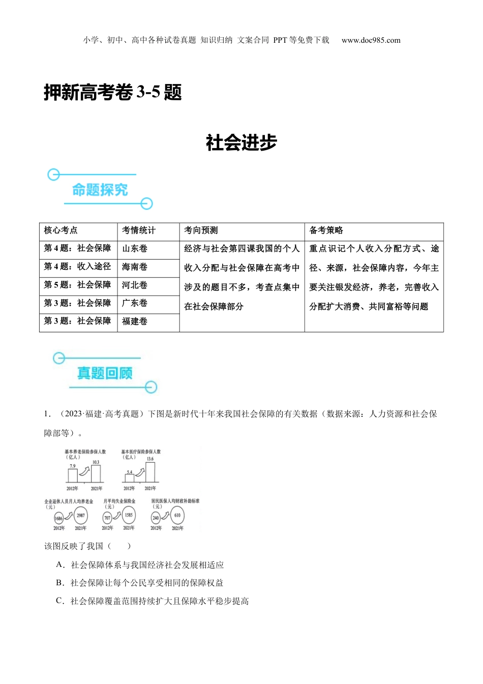 小学、初中、高中各种试卷真题知识归纳文案合同PPT等免费下载www.doc985.com押新高考卷3-5题社会进步核心考点考情统计考向预测备考策略第4题:社会保障山东卷经济与社会第四课我国的个人收入分配与社会保障在高考中涉及的题目不多,考查点集中在社会保障部分重点识记个人收入分配方式、途径、来源,社会保障内容,今年主要关注银发经济,养老,完善收入分配扩大消费、共同富裕等问题第4题:收入途径海南卷第5题:社会保障河北卷第3题:社会保障广东卷第3题:社会保障福建卷1.(2023·福建·高考真题)下图是新时代十年来我国社会保障的有关数据(数据来源:人力资源和社会保障部等)。该图反映了我国()A.社会保障体系与我国经济社会发展相适应B.社会保障让每个公民享受相同的保障权益C.社会保障覆盖范围持续扩大且保障水平稳步提高小学、初中、高中各种试卷真题知识归纳文案合同PPT等免费下载www.doc985.comD.社会保障作为规范个人收入分配秩序的手段实现了多样化【答案】C【详解】C:图中信息显示,新时代十年来,我国基本养老保险参保人数、基本医疗保险参保人数不断增加,反映了我国社会保障覆盖范围持续扩大;企业退休人员月人均养老金、月平均失业保险金、居民医保人均财政补助标准持续增长,反映了我国的社会保障水平稳步提高,故C选项符合题意;A:社会保障体系由社会保险、社会救助、社会福利、社会优抚等要素构成,图中信息只涉及社会保险的有关情况,没有涉及整个社会保障体系与经济发展的关系,故排除A选项;B:国家要公平对待每个公民并确保其享受相应的社会保障权益,要更多地维护好弱势群体的利益,并非每个公民享有的社会保障权益都是相同的,故排除B选项;D:规范收入分配秩序要通过保护合法收入、增加低收入者收入、扩大中等收入群体、调节过高收入、取缔非法收入等渠道来实现。社会保障是再分配调节机制的重要手段,不是规范收入分配秩序的手段,故排除D选项。故本题选C。2.(2023·河北·高考真题)在社会各界的共同努力下,河北省逐步形成了组织化、专业化、多元化的慈善事业发展新格局。截至2023年3月,全省注册志愿者1203.8万人。某国有股份有限公司2018年以来,累计捐款1亿多元,诠释了企业、企业家的责任和担当。慈善()①是社会保障体系的核心内容②在社会福利事业等方面发挥着重要作用③有利于完善个人收入分配④是再分配的调节手段A.①③B.①④C.②③D.②④【答案】C【详解】①:社会保险是社会保障体系的核心内容,①说法错误。②:慈善是社会公益事业,有利于促进社会公平,在社会福利事业等方面发挥着重要作用,②正确。③:慈善可以通过发挥第三次分配的作用,有利于完善个人收入分配,③正确。④:慈善是第三次分配,不属于再分配调节手段,④不选,故本题选C。3.(2023·海南·高考真题)下表为2022年全国居民收入情况:绝对量(元)涨幅比重小学、初中、高中各种试卷真题知识归纳文案合同PPT等免费下载www.doc985.com人均可支配收入368835.0%人均工资性收入205904.9%55.8%人均经营净收入61754.8%16.7%人均财产净收入32274.9%8.7%人均转移净收入68925.5%18.7%数据来源:国家统计局对上表信息解读正确的是()①劳动性收入是我国居民收入的主要来源②人均经营净收入增长主要是依靠土地出租③人均转移净收入增长反映了国家大力促进社会公平正义④人均财产净收入增加表明城乡居民收入差距进一步缩小A.①③B.①④C.②③D.②④【答案】A【详解】①:从图表信息可知,2022年全国居民人均工资性收入占比最高,达55.8%,表明劳动性收入是我国居民收入的主要来源,①正确。②:经营性收入指通过生产经营活动所获得的收入。材料没有反映土地出租,且土地出租得到的收入属于财产性收入,不是经营性收入,②排除。③:转移性收入指国家、单位、社会团体对住户的各种经常性转移支付和住户之间的经常性收入转移,包括养老金、社会救济和补助、政策性生产补贴、政策性生活补贴、救灾款等。人均转移净收入增长反映了国家大力促进社会公平正义,反映了国家在再分配环节更加注重公平,③正确。④:通过人均财产净收入增加,无法反映城乡...