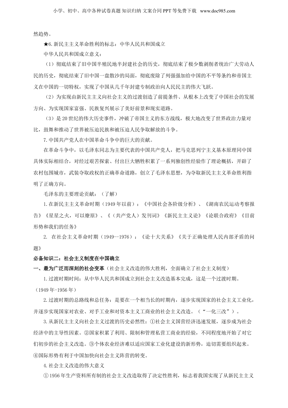 小学、初中、高中各种试卷真题知识归纳文案合同PPT等免费下载www.doc985.com2025年高考政治一轮复习精讲精练第二课只有社会主义才能救中国【课标要求】1.阐述新民主主义革命的性质和特点2.理解新中国确立社会主义制度的历史必然性。【核心素养】政治认同:认同中国必须坚持中国共产党的领导;中国不能走资本主义道路;认同社会主义改造的必要性,坚信只有社会主义才能救中国科学精神:坚持马克思列宁主义,坚持毛泽东思想;深刻理解社会主义改造伟大胜利的历史意义,能辩证地看待社会主义建设初步探索的伟大成就与历史教训。公共参与:树立为实现中华民族伟大复兴而奋斗的理想,勇于担当社会责任。【命题预测】本课一般以选择题出现的概率比较大。一般结合历史事件来考查,难度不会很大。重点关注:1.新民主主义革命“新”在哪里。2.中国选择社会主义道路的历史必然性。3.社会主义改造的完成有什么历史意义。【思维导图】【考点梳理】必备知识一:新民主主义革命的胜利一、近代中国探索复兴之路1.近代中国的历史任务小学、初中、高中各种试卷真题知识归纳文案合同PPT等免费下载www.doc985.com历史任务:争取民族独立、人民解放和实现国家富强、人民幸福。2.资本主义道路在中国走不通:资本主义道路在中国走不通,是由近代中国的基本国情决定的。①帝国主义要把中国变成它们的殖民地或半殖民地,维护其在华特权,它们决不允许中国通过走资本主义道路强大起来,成为自己的竞争对手。②中国的封建势力同帝国主义相勾结,严重阻碍了民族资本主义经济的发展。③中国民族资产阶级的力量十分弱小,并且与封建主义和外国资本主义有着千丝万缕的联系,具有软弱性和妥协性的特点,不能承担起领导中国人民完成反帝反封建的民主革命的使命。3.结论:在半殖民地半封建的近代中国,资本主义道路走不通。为了实现民族独立、人民解放,为了实现国家富强、人民幸福,必须另辟新路。二、新民主主义革命的胜利过程1.马克思列宁主义传入中国(1)1917年,十月革命一声炮响,给中国送来了马克思列宁主义。(了解)(2)五四运动的意义:①五四运动推动了中国进步,促进了马克思主义在中国的传播,促进了马克思主义同中国工人运动的结合了②为中国共产党做了思想上干部上的准备,为新的革命力量、革命文化、革命斗争登上历史舞台创造了条件③是中国旧民主主义革命走向新民主主义革命的转折点,在近代以来中华民族追求民族独立和发展进步的历史进程中具有里程碑意义。2.中国共产党诞生的伟大历史意义a.中国共产党的诞生是中国人民谋求民族独立、人民解放和国家富强、人民幸福的斗争有了主心骨。b.中国共产党领导新民主主义革命,探索出一条以农村包围城市、武装夺取政权、最后夺取全国胜利的新民主主义革命道路。运用三大法宝——统一战线、武装斗争、党的建设。4.新民主主义革命的道路、阶段和法宝(1)革命道路:农村包围城市、武装夺取政权、最后夺取全国胜利的新民主主义革命道路(2)革命的四个阶段:大革命、土地革命战争、抗日战争、解放战争(3)取胜的三大法宝:统一战线、武装斗争、党的建设5.性质:新民主主义革命是无产阶级领导的,工农联盟为基础的,人民大众的,反对帝国主义、封建主义和官僚资本主义的民主革命。★特点:“新”——新民主主义革命“新”在哪里:①就领导权来说,新民主主义革命由无产阶级领导,这一点具有决定性意义;②就革命前途来说,是建立无产阶级领导的各革命阶级的联合专政,并最终过渡到社会主义社会;③就所属世界范畴来说,是属于世界无产阶级革命的一部分。中国革命的两个步骤:第一步,改变半殖民地半封建的社会形态,使中国社会变成一个独立的民主主义的社会;第二步,使革命向前发展,建立社会主义的社会。二者关系:新民主主义革命是社会主义革命的必要准备,社会主义革命是新民主主义革命的必小学、初中、高中各种试卷真题知识归纳文案合同PPT等免费下载www.doc985.com然趋势。★6.新民主主义革命胜利的标志:中华人民共和国成立中华人民共和国成立意义:(1)彻底结束了旧中国半殖民地半封建社会的历史,彻底结束了极少数剥削者统治广大劳动人民的历史,彻...