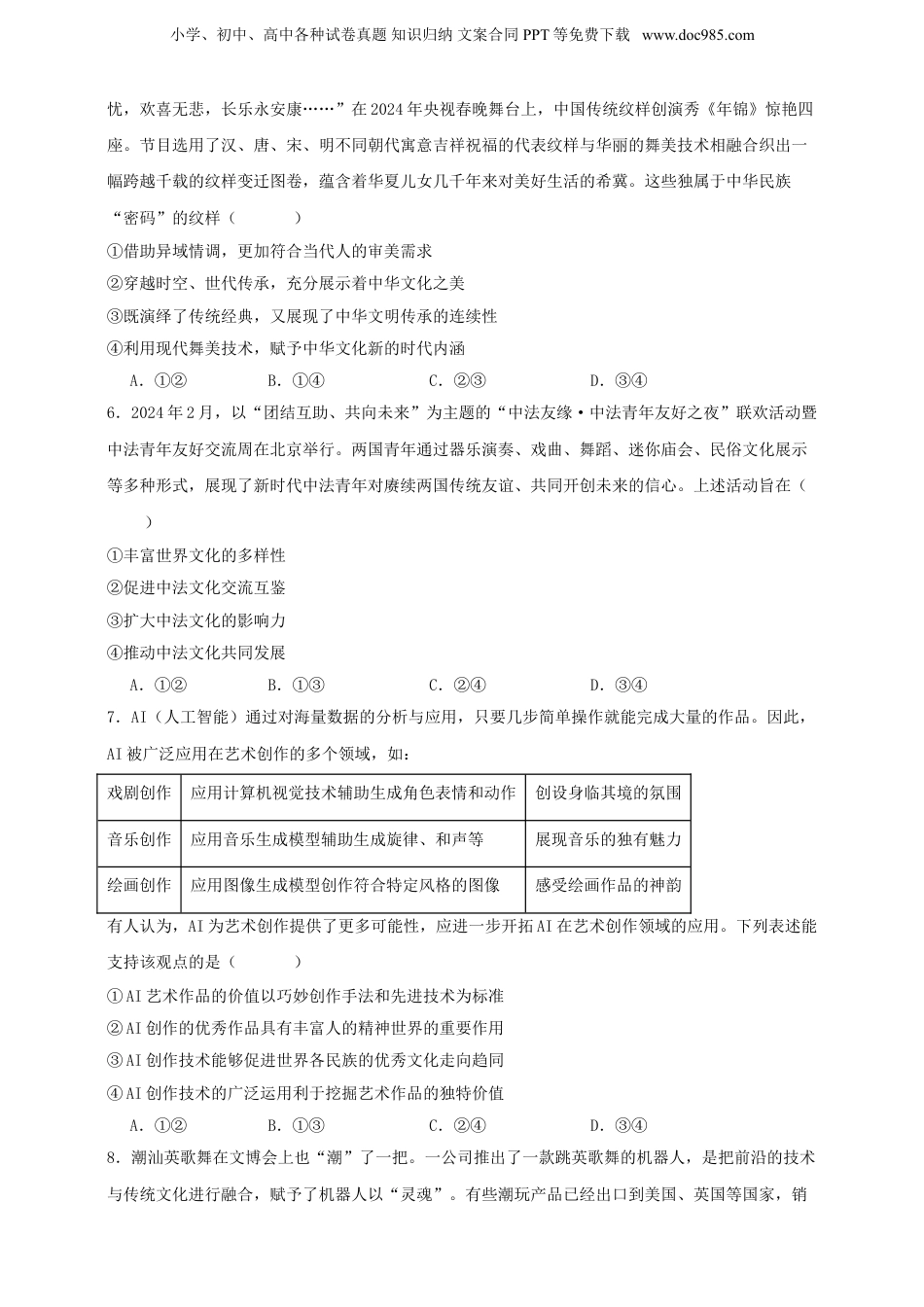 小学、初中、高中各种试卷真题知识归纳文案合同PPT等免费下载www.doc985.com第八课学习借鉴外来文化的有益成果时间:60分钟满分:100分一、选择题:本题共25小题,每小题2分,共50分。每小题只有一个选项符合题目要求。1.在中华民族对外交流史上,古丝绸之路上的驼铃声、郑和下西洋的帆影…中华民族自信而又大度地同世界其他民族进行交往,留下了千古佳话。今天,共建“一带一路”从中国倡议走向国际实践,正谱写着各国文化融合共生的时代新篇。中外交往的历史和现实说明()①中华民族积极主动地吸纳人类文化成果②文化多样性是推动文化繁荣的必然要求③文化交流构成了人类文化发展的重要动力④应在文化交融基础上增进文化的相互认同A.①②B.①④C.②③D.③④2.以“舞动梦想,和美丝路”为主题的第六届中国新疆国际民族舞蹈节在乌鲁木齐举行,来自亚洲、欧洲、非洲10多个国家和地区的1000多名艺术家会聚天山脚下,以舞为媒、以舞会友,让人们切身感受到了各美其美、美人之美、天下大同的中国气派。新疆国际民族舞蹈节的举办体现了()①应该尊重和保护文化多样性②文化交流是文化发展的源泉③认同世界文化有利于文化繁荣④文化发展必须保持开放的心态A.①②B.①④C.②③D.③④3.2024年是中法建交60周年,中法两国将携手合作,举办涵盖表演艺术、视觉艺术、文化遗产、旅游推广等多领域的中法文化旅游年活动。该活动的文化价值在于()①扩大中法两国人文交流、促进民心相通②增强对中法两国彼此文化的尊重和趋同③有助于不同文明间对话,推动相知相亲④有利于推动中法两国经济社会健康发展A.①③B.①④C.②③D.②④4.今年“五一”假期,贵州黔东南苗族侗族自治州凭借“村超”文体“嘉年华”,再次迎来游客高峰。榕江在“村超”赛场之外推出了定威水族乡生态羊烧笋节、乐里七十二侗寨斗牛对抗赛等丰富多彩的活动,持续带动榕江餐饮、旅游、农业等产业的发展。由此可见()A.经济决定文化,高质量发展助推人民对新时代美好生活的向往B.文化具有民族性,集中体现了中华民族的整体风貌和精神特征C.文化反作用于经济,具有服务社会和推动发展的重要功能D.大力发展文化事业,能够为人民群众提供丰富全面的文化服务5.“愿这千里江山,河清海晏,福星耀东方;愿这冬去春来,繁花似锦,万物苏醒忙;愿你岁岁无小学、初中、高中各种试卷真题知识归纳文案合同PPT等免费下载www.doc985.com忧,欢喜无悲,长乐永安康……”在2024年央视春晚舞台上,中国传统纹样创演秀《年锦》惊艳四座。节目选用了汉、唐、宋、明不同朝代寓意吉祥祝福的代表纹样与华丽的舞美技术相融合织出一幅跨越千载的纹样变迁图卷,蕴含着华夏儿女几千年来对美好生活的希冀。这些独属于中华民族“密码”的纹样()①借助异域情调,更加符合当代人的审美需求②穿越时空、世代传承,充分展示着中华文化之美③既演绎了传统经典,又展现了中华文明传承的连续性④利用现代舞美技术,赋予中华文化新的时代内涵A.①②B.①④C.②③D.③④6.2024年2月,以“团结互助、共向未来”为主题的“中法友缘·中法青年友好之夜”联欢活动暨中法青年友好交流周在北京举行。两国青年通过器乐演奏、戏曲、舞蹈、迷你庙会、民俗文化展示等多种形式,展现了新时代中法青年对赓续两国传统友谊、共同开创未来的信心。上述活动旨在()①丰富世界文化的多样性②促进中法文化交流互鉴③扩大中法文化的影响力④推动中法文化共同发展A.①②B.①③C.②④D.③④7.AI(人工智能)通过对海量数据的分析与应用,只要几步简单操作就能完成大量的作品。因此,AI被广泛应用在艺术创作的多个领域,如:戏剧创作应用计算机视觉技术辅助生成角色表情和动作创设身临其境的氛围音乐创作应用音乐生成模型辅助生成旋律、和声等展现音乐的独有魅力绘画创作应用图像生成模型创作符合特定风格的图像感受绘画作品的神韵有人认为,AI为艺术创作提供了更多可能性,应进一步开拓AI在艺术创作领域的应用。下列表述能支持该观点的是()①AI艺术作品的价值以巧妙创作手法和先进技术为标准②AI创作的优秀作品具有丰富人的精神世界的重要作用③AI创作...