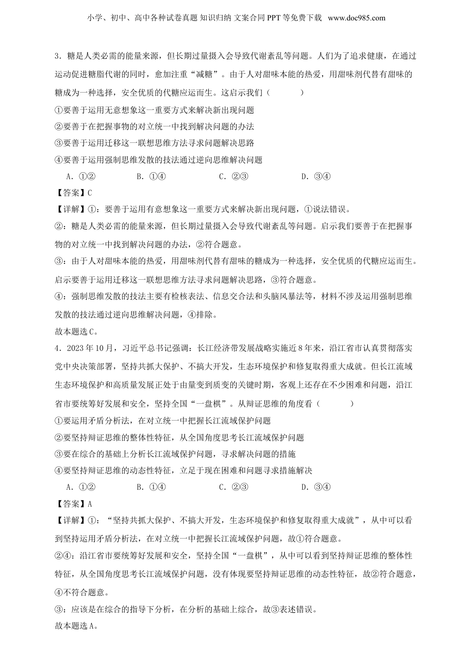 小学、初中、高中各种试卷真题知识归纳文案合同PPT等免费下载www.doc985.com第八课把握辩证分合时间:45分钟满分:100分一、选择题:本题共25小题,每小题2分,共50分。每小题只有一个选项符合题目要求。1.中国共产党的一百年,是矢志践行初心使命的一百年,是筚路蓝缕奠基立业的一百年,是创造辉煌开辟未来的一百年。只有从党的百年奋斗历程中,我们才能深刻领悟坚持中国共产党领导的历史必然性,坚定对党的领导的自信。以上表述体现了()①要整体性地认识事物、思考问题②必须用动态性的辩证思维看问题③分析以综合为基础,又以综合的结果为指导④分析与综合的对立统一是事物发展的根本动力A.①②B.③④C.②③D.①④【答案】A【详解】①:只有从党的百年奋斗历程中,我们才能深刻领悟坚持中国共产党领导的历史必然性,坚定对党的领导的自信。说明我们要深刻要整体性地认识事物、思考问题,①正确。②:党的百年奋斗历程是一个动态过程,所以我们必须用动态性的辩证思维看问题,②正确。③:分析是综合的基础,③错误。④:矛盾双方既对立又统一,由此推动事物的运动、变化和发展,矛盾是事物发展的源泉和根本动力,矛盾双方未必是分析与综合,④错误。故本题选A。2.某校开展《红楼梦》整本书阅读的项目式学习活动,同学们通过阅读《红楼梦》全书,梳理小说主要人物和情节,理清人物关系,理解和欣赏人物形象,探究人物精神世界,整体把握小说的思想内容和艺术特点,建构阅读长篇小说的方法和经验。这一材料蕴含的辩证思维方法是()①运用分析方法整体上把握事物的本质和规律②综合方法的注意力主要在部分之间的联系上③在分析与综合的对立统一中推动认识的发展④综合方法在认识事物的过程中起到基础作用A.①②B.①④C.②③D.③④【答案】C【详解】①:运用综合方法整体上把握事物的本质和规律,①错误。②③:同学们通过阅读《红楼梦》全书,梳理小说主要人物和情节,理清人物关系,理解和欣赏人物形象,探究人物精神世界,整体把握小说的思想内容和艺术特点,建构阅读长篇小说的方法和经验。这一材料蕴含的辩证思维方法是综合方法的注意力主要在部分之间的联系上,在分析与综合的对立统一中推动认识的发展,②③符合题意。④:分析方法在认识事物的过程中起到基础作用,④错误。故本题选C。小学、初中、高中各种试卷真题知识归纳文案合同PPT等免费下载www.doc985.com3.糖是人类必需的能量来源,但长期过量摄入会导致代谢紊乱等问题。人们为了追求健康,在通过运动促进糖脂代谢的同时,愈加注重“减糖”。由于人对甜味本能的热爱,用甜味剂代替有甜味的糖成为一种选择,安全优质的代糖应运而生。这启示我们()①要善于运用无意想象这一重要方式来解决新出现问题②要善于在把握事物的对立统一中找到解决问题的办法③要善于运用迁移这一联想思维方法寻求问题解决思路④要善于运用强制思维发散的技法通过逆向思维解决问题A.①②B.①④C.②③D.③④【答案】C【详解】①:要善于运用有意想象这一重要方式来解决新出现问题,①说法错误。②:糖是人类必需的能量来源,但长期过量摄入会导致代谢紊乱等问题。启示我们要善于在把握事物的对立统一中找到解决问题的办法,②符合题意。③:由于人对甜味本能的热爱,用甜味剂代替有甜味的糖成为一种选择,安全优质的代糖应运而生。启示要善于运用迁移这一联想思维方法寻求问题解决思路,③符合题意。④:强制思维发散的技法主要有检核表法、信息交合法和头脑风暴法等,材料不涉及运用强制思维发散的技法通过逆向思维解决问题,④排除。故本题选C。4.2023年10月,习近平总书记强调:长江经济带发展战略实施近8年来,沿江省市认真贯彻落实党中央决策部署,坚持共抓大保护、不搞大开发,生态环境保护和修复取得重大成就。但长江流域生态环境保护和高质量发展正处于由量变到质变的关键时期,客观上还存在不少困难和问题,沿江省市要统筹好发展和安全,坚持全国“一盘棋”。从辩证思维的角度看()①要运用矛盾分析法,在对立统一中把握长江流域保护问题②要坚持辩证思维的整体性特征,从全国角度思考长江流域保护问题③要在综...