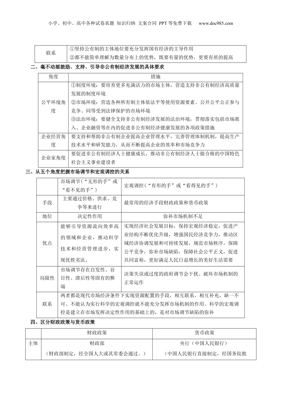 小学、初中、高中各种试卷真题知识归纳文案合同PPT等免费下载www.doc985.com押江苏卷9题生产资料私有制与经济体制核心考点考情统计考向预测备考策略公有制经济2023浙江高考2023山东高考1.运用我国的生产资料所有制的相关知识,分析深入实施国企改革三年行动的经济意义以及如何深化国企改革。2.运用“我国的生产资料所有制”的知识分析民营企业在我国经济社会发展中的作用。运用“毫不动摇鼓励、支持、引导非公有制经济发展”的知识,分析该市政府是如何创造良好环境支持民宿产业发展的。3.以“构建高水平社会主义市场经济制”“建设全国统一大市场”“深化要素市场化改革,建设高标准市场体系”等为情境,考查市场配置资源的机制、市场体系、市场秩序等。4以疫情后经济复苏,支持民营经济发展等情境,考查考生对社会主义市场经济基本特征及政府的经济职能的理解,培育考生的科学认知素养。1.本专题在近几年的高考中,主要以选择题的形式进行考查,特别是材料分析型和推导选择题为主,学生要掌握破解题型的方法。2.构架知识体系,掌握并理解核心关键词。加大选择题的训练,寻找学习中的难点和盲点。3.关注国家最新出台的宏观调控政策,学会运用市场调节和宏观调控的知识,分析政府宏观调控政策的原因和措施。促进非公有制经济共同发展2023全国高考2023湖南高考2023浙江高考2023重庆高考2023广东高考使市场在资源配置中起决定性作用2023浙江高考2023江苏高考2023广东高考2023辽宁高考财政政策和货币政策2023全国高考2023江苏高考2023湖北高考政府的宏观调控2023湖南高考2023江苏高考2023广东高考1.(2023·江苏·高考真题)高质量发展是全面建设社会主义现代化国家的首要任务,也是中国式现代化的本质要求。我们要坚持以高质量发展为主题,推动经济实现质的有效提升和量的合理增长。下列传导路径中,能推动我国经济高质量发展的是()小学、初中、高中各种试卷真题知识归纳文案合同PPT等免费下载www.doc985.comA.完善产权保护制度→优化营商环境→扩大我国对外投资规模B.增加银行存款准备金→增加货币供给量→扩大国内消费需求C.构建国内统一大市场→促进要素自由流动→缩小居民收入差距D.整合国有企业资源→优化国有经济结构→提升国有资本配置效率2.(2023·江苏·高考真题)近年来,为应对一些西方国家挑起的“芯片战”,我国芯片企业积极进行科技攻关。伴随着国产芯片技术的进步和国产替代进程的加速,芯片企业业绩普遍好转。在其他条件不变的情况下,下图中(D、S分别代表需求曲线和供给曲线,P、Q分别代表价格和数量)能够反映我国国产芯片市场变化结果的是()A.B.C.D.2024年高考备考,掌握核心必备知识,理清本专题体系,掌握核心主干句。一、公有制的主体地位和国有经济的主导作用公有制的主体地位国有经济的主导作用区别侧重公有制经济在所有制结构中所占的比重国有经济在国民经济中所处的地位和对国民经济性质和发展方向所起的作用表现①公有资产在社会总资产中占优势②国有经济控制国民经济命脉①主要体现在控制力上。对关系国民经济命脉的重要行业和关键领域,国有经济必须占支配地位②国有企业是国有经济最主要的实现形式,是中国特色社会主义的重要物质基础和政治基础,是推进国家现代化、保障人民共同利益的重要力量,是我们党执政兴国的重要支柱和依靠力量小学、初中、高中各种试卷真题知识归纳文案合同PPT等免费下载www.doc985.com联系①坚持公有制的主体地位要充分发挥国有经济的主导作用②都不能简单理解为数量分布上的优势,既要有量的优势,更要有质的提高二、毫不动摇鼓励、支持、引导非公有制经济发展的具体要求角度措施公平环境角度①制度环境:要培育更多充满活力的市场主体,营造支持非公有制经济高质量发展的制度环境②市场环境:营造各种所有制主体依法平等使用资源要素、公开公平公正参与竞争、同等受到法律保护的市场环境③法治环境:要健全支持非公有制经济发展的法治环境,贯彻落实包括市场准入、企业融资等在内的促进非公有制经济健康发展的各项政策措施企业经营角度要支持和帮助非公有制企业提高企业管理水平,完善管理体制机制,提高生产...
