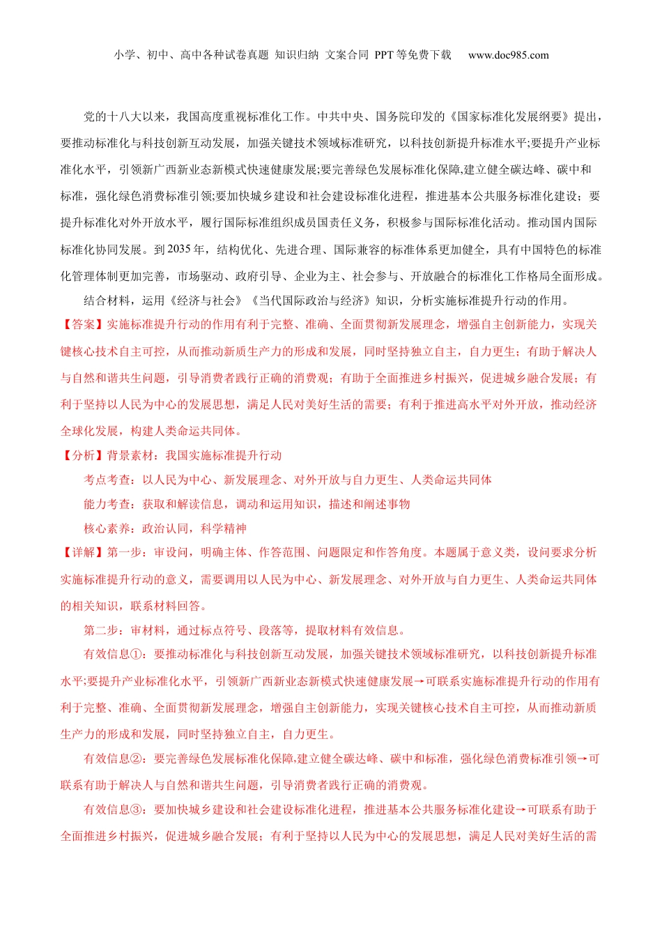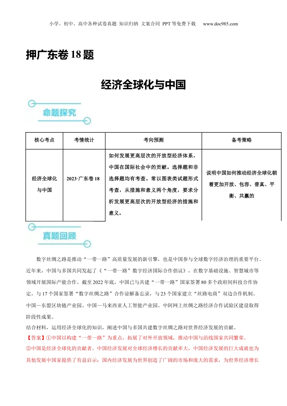 小学、初中、高中各种试卷真题知识归纳文案合同PPT等免费下载www.doc985.com押广东卷18题经济全球化与中国核心考点考情统计考向预测备考策略经济全球化与中国2023·广东卷18如何发展更高层次的开放型经济体系,中国在国际社会中的贡献。选择题和非选择题均有考查。常以图表类试题形式考查,从措施和意义两个角度,要求分析发展更高层次的开放型经济的措施和意义。说明中国如何推动经济全球化朝着更加开放、包容、普真、平衡、共赢的数字丝绸之路是推动“一带一路”高质量发展的新引擎,也是中国参与全球数字经济治理的重要平台。近年来,中国与多国共同发起了《“一带一路”数字经济国际合作倡议》,在数字基础设施、智慧城市等领域开展国际产能合作。截至2022年底,中国已与共建“一带一路”国家签署80多个政府间科技合作协定,与17个国家签署“数字丝绸之路”合作谅解备忘录,与23个国家建立“丝路电商”双边合作机制。中国—东盟区块链产业园、中国—马来西亚人工智能产业园、中阿网上丝绸之路经济合作试验区建设取得阶段性成果。结合材料,运用经济全球化的知识,阐述中国与多国共建数字丝绸之路对世界经济发展的贡献。【答案】①中国以构建“一带一路”为重点,拓展了对外开放领域,推动中国与沿线国家共同繁荣。②中国是经济全球化的贡献者。中国经济发展对全球经济增长的贡献率大,中国经济发展的巨大成就也为其他发展中国家提供了有益启示;国内经济发展为世界创造了广阔的市场和庞大的需求,为世界经济增长小学、初中、高中各种试卷真题知识归纳文案合同PPT等免费下载www.doc985.com提供了持续强大的动力。③坚持共商共建共享,内外联动发展,不断增添共同发展新动力,推动世界经济朝着合作共赢方向发展。中国和经济全球化的关系(各自发挥比较优势)(1)中国是经济全球化的受益者赢得了良好的国际环境,促进了社会主义市场经济体制的建立和健全,推动开放型经济水平的提高(有利于建设更高层次的开放型经济---经常是答题点),带动了国内产业结构的优化升级,创造了大批的就业机会,提高了人民群众的收入和生活水平。(2)中国是经济全球化的贡献者A.中国对全球减贫事业做出重大贡献,也为其他发展中国家提供了有益启示。B.中国经济快速增长为世界各国提供了更广阔的市场、更充足的资本、更丰富的产品、更宝贵的合作机会,为全球经济的稳定和增长提供了持续强大的推动力。C.中国同一大批国家的联动发展,使全球经济发展更加平衡,为开放型世界经济的发展提供了重要动力。注:中国的发展关键在于走出了一条适合中国国情的发展道路(3)中国主张:作为世界主要经济体和负责任的大国,中国奉行多边贸易体制,反对贸易保护主义,积极参与全球经济治理和规则制定,通过协商应对共同的挑战,使世界经济增长更加包容。1.(2024·黑龙江齐齐哈尔·三模)阅读材料,完成下列要求。标准是经济活动和社会发展的技术支撑,在基础性制度的重要方面。2024年政府工作报告提出,实施标准提升行动,加快构建这的质重发展要求的标准体系,推动商品和服务质量不断提高,更好满足人民群众改善生活的需要。小学、初中、高中各种试卷真题知识归纳文案合同PPT等免费下载www.doc985.com党的十八大以来,我国高度重视标准化工作。中共中央、国务院印发的《国家标准化发展纲要》提出,要推动标准化与科技创新互动发展,加强关键技术领域标准研究,以科技创新提升标准水平;要提升产业标准化水平,引领新广西新业态新模式快速健康发展;要完善绿色发展标准化保障,建立健全碳达峰、碳中和标准,强化绿色消费标准引领;要加快城乡建设和社会建设标准化进程,推进基本公共服务标准化建设;要提升标准化对外开放水平,履行国际标准组织成员国责任义务,积极参与国际标准化活动。推动国内国际标准化协同发展。到2035年,结构优化、先进合理、国际兼容的标准体系更加健全,具有中国特色的标准化管理体制更加完善,市场驱动、政府引导、企业为主、社会参与、开放融合的标准化工作格局全面形成。结合材料,运用《经济与社会》《当代国际政治与经济》知识,分析实施标准提升行动的作用。【答案】实施标准提升行...