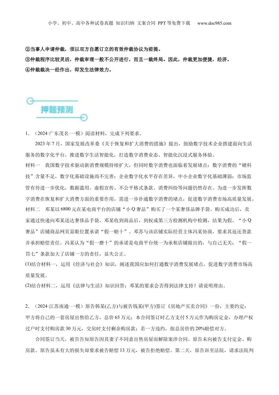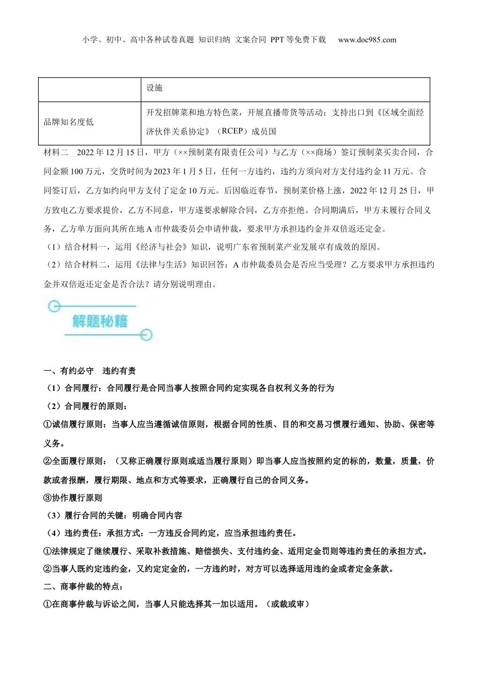 小学、初中、高中各种试卷真题知识归纳文案合同PPT等免费下载www.doc985.com押广东卷17题商事仲裁、违约责任核心考点考情统计考向预测备考策略建设现代化经济体系、商事仲裁、违约责任2023·广东卷17从命题内容上看,合同的实质、合同成立的决定因素、合同订立的两个阶段、合同的效力、合同履行的原则、违约责任、法定免责是高考考查的重点明确商事仲裁的特点和程序,理解并分析违约责任的承担方式和违约责任的免责事由。材料一预制菜是以农、畜、禽、水产品为原料,经过分切、搅拌、腌制等环节加工而成的成品或半成品。广东省作为预制菜的策源地,针对行业痛点制定对策(见下表),产业发展卓有成效,在2022年《中国预制菜产业指数省份排行榜》中位居第一。预制菜行业痛点和广东省主要做法行业痛点主要做法涉及食材种类多,企业生产工艺良莠不齐出台《加快推进广东预制菜产业高质量发展十条措施》,制定《预制菜冷链配送规范》《预制菜产业园建设指南》等地方标准农林牧渔产品的价格受自然条件影响大采用“公司+基地+农户”的经营模式,与农户签订订单;加强中央厨房建设,实行统一采购冷链运输损耗大研发与营养保持、菜品保鲜、冷链物流相关的关键技术;支持建设仓储物流小学、初中、高中各种试卷真题知识归纳文案合同PPT等免费下载www.doc985.com设施品牌知名度低开发招牌菜和地方特色菜,开展直播带货等活动;支持出口到《区域全面经济伙伴关系协定》(RCEP)成员国材料二2022年12月15日,甲方(××预制菜有限责任公司)与乙方(××商场)签订预制菜买卖合同,合同金额100万元,交货时间为2023年1月5日,任何一方违约,违约方须向对方支付违约金11万元。合同签订后,乙方如约向甲方支付了定金10万元。后因临近春节,预制菜价格上涨,2022年12月25日,甲方致电乙方要求提价,乙方不同意,甲方遂要求解除合同,乙方亦拒绝。合同期满后,甲方未履行合同义务,乙方单方面向其所在地A市仲裁委员会申请仲裁,要求甲方承担违约金并双倍返还定金。(1)结合材料一,运用《经济与社会》知识,说明广东省预制菜产业发展卓有成效的原因。(2)结合材料二,运用《法律与生活》知识回答:A市仲裁委员会是否应当受理?乙方要求甲方承担违约金并双倍返还定金是否合法?请分别说明理由。一、有约必守违约有责(1)合同履行:合同履行是合同当事人按照合同约定实现各自权利义务的行为(2)合同履行的原则:①诚信履行原则:当事人应当遵循诚信原则,根据合同的性质、目的和交易习惯履行通知、协助、保密等义务。②全面履行原则:(又称正确履行原则或适当履行原则)即当事人应当按照约定的标的,数量,质量,价款或者报酬,履行期限、地点和方式等要求,正确履行自己的合同义务。③协作履行原则(3)履行合同的关键:明确合同内容(4)违约责任:承担方式:一方违反合同约定,应当承担违约责任。①法律规定了继续履行、采取补救措施、赔偿损失、支付违约金、适用定金罚则等违约责任的承担方式。②当事人既约定违约金,又约定定金的,一方违约时,对方可以选择适用违约金或者定金条款。二、商事仲裁的特点:①在商事仲裁与诉讼之间,当事人只能选择其一加以适用。(或裁或审)小学、初中、高中各种试卷真题知识归纳文案合同PPT等免费下载www.doc985.com②当事人申请仲裁,须以双方自愿订立的有效仲裁协议为前提。③仲裁程序比较灵活,仲裁审理一般不公开进行,而且一裁终局。因此,仲裁更加便捷,经济。④仲裁裁决一经作出,即发生法律效力。1.(2024·广东茂名·一模)阅读材料,完成下列要求。2023年7月,国家发展改革委《关于恢复和扩大消费的措施》提出,鼓励数字技术企业搭建面向生活服务的数字化平台,推进数字生活智能化,打造数字消费业态、智能化沉浸式服务体验。材料一我国数字技术驱动新消费规模持续扩大,但同时数字消费也面临着发展堵点:数字消费的“硬科技”含量不足,数字化基础设施尚不完善;企业数字化水平存在差异,中小企业数字化基础薄弱;市场监管有待进一步优化,数据滥用、虚假宣传、不公平格式条款、消费纠纷等问题仍然存在。为进一步发挥数字消费在恢复和扩大消费方...