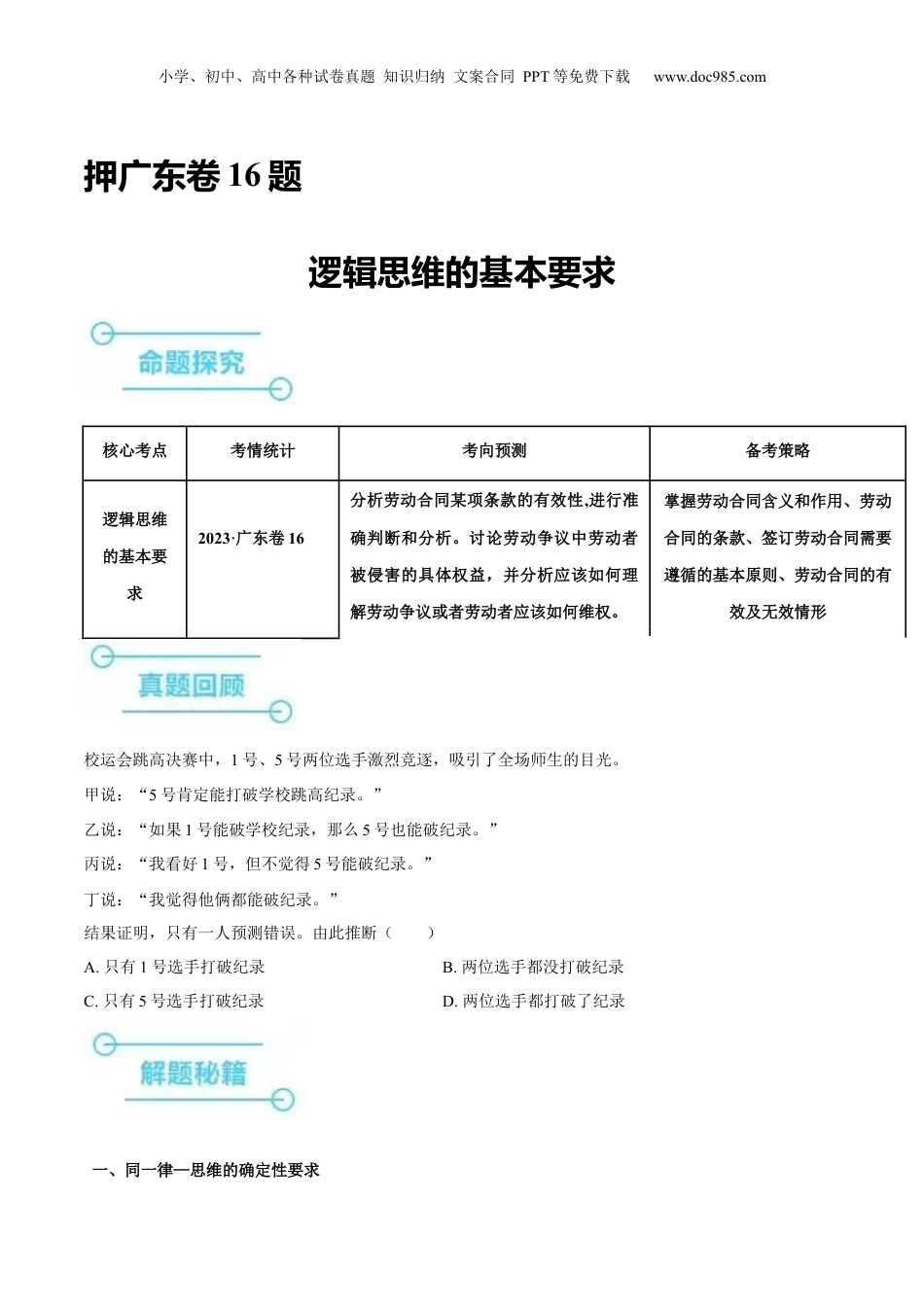 小学、初中、高中各种试卷真题知识归纳文案合同PPT等免费下载www.doc985.com押广东卷16题逻辑思维的基本要求核心考点考情统计考向预测备考策略逻辑思维的基本要求2023·广东卷16分析劳动合同某项条款的有效性,进行准确判断和分析。讨论劳动争议中劳动者被侵害的具体权益,并分析应该如何理解劳动争议或者劳动者应该如何维权。掌握劳动合同含义和作用、劳动合同的条款、签订劳动合同需要遵循的基本原则、劳动合同的有效及无效情形校运会跳高决赛中,1号、5号两位选手激烈竞逐,吸引了全场师生的目光。甲说:“5号肯定能打破学校跳高纪录。”乙说:“如果1号能破学校纪录,那么5号也能破纪录。”丙说:“我看好1号,但不觉得5号能破纪录。”丁说:“我觉得他俩都能破纪录。”结果证明,只有一人预测错误。由此推断()A.只有1号选手打破纪录B.两位选手都没打破纪录C.只有5号选手打破纪录D.两位选手都打破了纪录一、同一律—思维的确定性要求小学、初中、高中各种试卷真题知识归纳文案合同PPT等免费下载www.doc985.com1.遵循同一律的理由:合乎逻辑的思维是具有确定性的思维。要正确地反映客观事物的事实与规律,必须让思维确定下来,该是什么就是什么,不能游移不定。这就要遵循同一律的要求。2.公式与要求(1)公式:①公式表达:“A是A”。②公式意思:在同一时间、从同一方面、对同一对象所形成的论断“A”,如果是真的,就是真的;如果是假的,就是假的。(2)要求:同一律要求人们:在同一思维过程中,每一思想必须保持自身同一性。不能混淆概念,也不能转移论题。3.违反同一律的逻辑错误:故意违反同一律的要求,所犯的逻辑错误叫作“偷换概念”或“偷换论题”。的情况下,任意变更概念或判断。二、矛盾律—思维的一致性要求(不能自相矛盾)1.遵循矛盾律的理由:合乎逻辑的思维是具有一致性的思维。要避免思维出现不融贯一致的逻辑错误,就要遵循矛盾律的要求。2.公式与要求(1)公式:①公式表达:“A不是非A”。②公式意思:在同一时间、从同一方面、对同一对象所形成的论断“A”和它的否定论断“非A”不能同真,其中必有一假。(2)要求:矛盾律要求人们:在同一时间、从同一方面、对同一对象所形成的论断“A”和“非A”,不能断定它们都成立。①“概念”角度,矛盾律要求:在同一思维过程中,对于同一个对象不能同时用两个相互矛盾的概念。②“判断”角度,矛盾律要求:在同一思维过程中,对同一对象,不能同时作出两个相互矛盾的判断。来反映。3.违反矛盾律要求的逻辑错误叫作“自相矛盾”。三、排中律—思维的明确性要求(不能骑墙居中)1.遵循排中律的理由:合乎逻辑的思维是具有明确性的思维。逻辑思维既要排除自相矛盾的逻辑错误,也要反对在“是”与“非”之间骑墙居中,在矛盾关系的论断之间持“两不可”的态度。这就要遵循2.公式与要求小学、初中、高中各种试卷真题知识归纳文案合同PPT等免费下载www.doc985.com(1)公式:①公式表达:“A或者非A”。②公式意思:在同一时间、从同一方面、对同一对象所形成的论断“A”和“非A”不能同假,其中必有一真。(2)要求:排中律要求人们:在同一时间、从同一方面、对同一对象形成的论断“A”和“非A”,不能断定它们都不成立。也就是说,不能同时否认“A”,又否认“非A”,对“是”与“非”各打五十大板。4.违反排中律要求的逻辑错误叫作“两不可”。1.(2024·湖南·二模)陈文、张芸、林平、彭兵是某一中学学生,他们中有一位做好事不留名,被反映到学校。学校了解情况如下:陈文说:不是我。张芸说:是彭兵。林平说:是张芸。彭兵说:不是我。其中只有一人没说假话,那么是谁做了好事没留名呢?()A.张芸B.林平C.彭兵D.陈文2.(2024·河南·二模)甲、乙、丙、丁四位同学中有见义勇为的当事人,记者采访时,四位同学经商量告诉记者:“我们四位各提醒你一句,只有一个人说的是假的,然后你猜猜谁是见义勇为的当事人甲同学:见义勇为者是丙乙同学:丁是见义勇为者丙同学:如果我是见义勇为者,那么丁也是丁同学:见义勇为者不是我请你判断:谁是见义勇为者,依据是什么()A.丙和丁矛盾律B.丙和丁排中律C.丁矛盾律D...